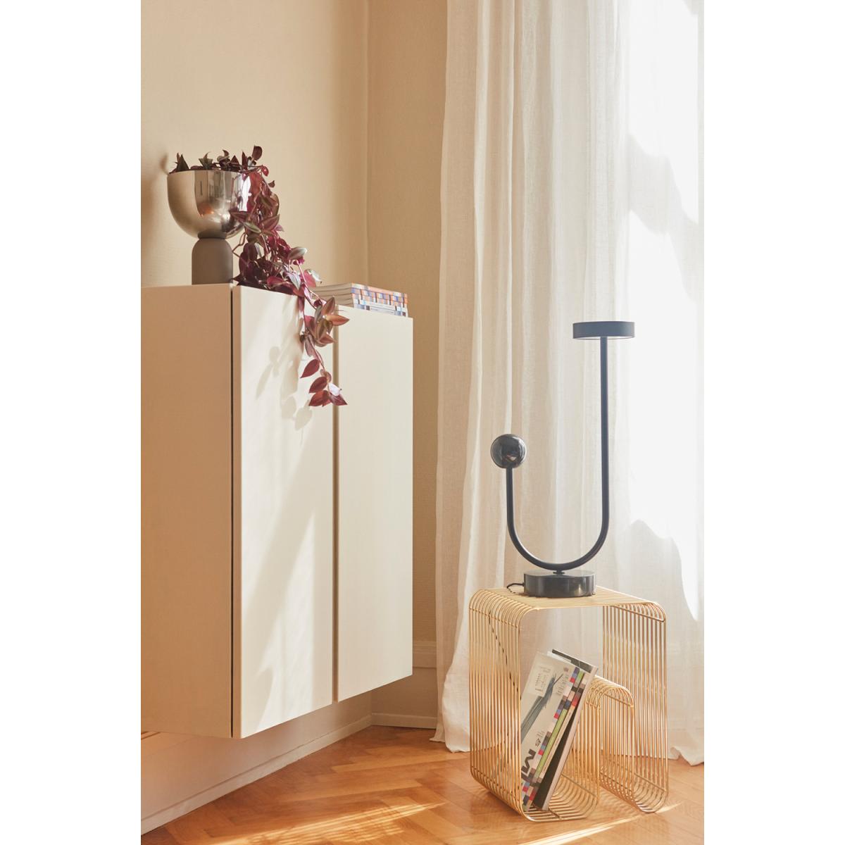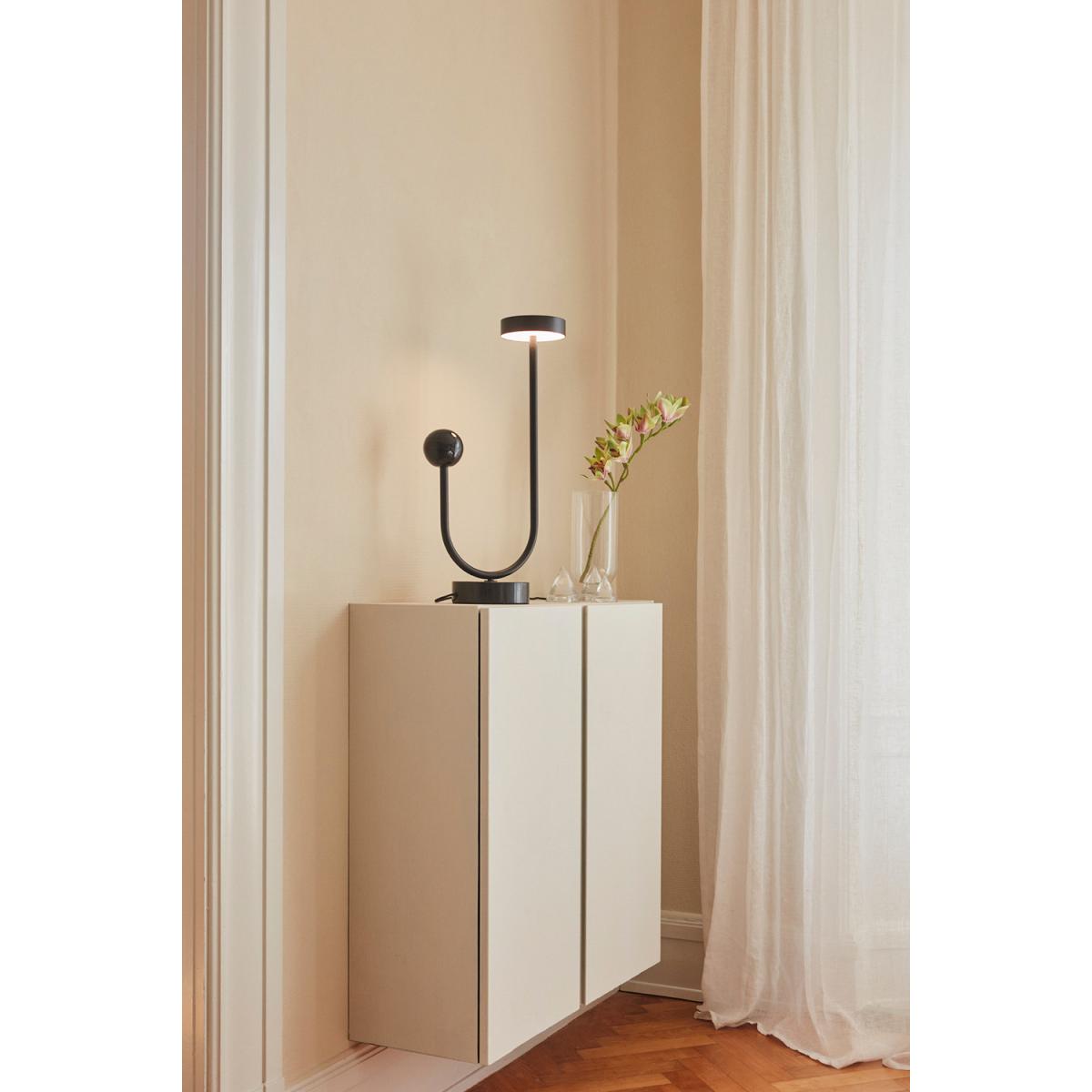 I love the modern, sculptural feel of this lamp; its sleek black finish makes it versatile for various interiors. It works particularly well in contemporary, minimalist, or industrial spaces, where its clean lines can be showcased without overwhelming the room. Practical styling tips include placing it on a sideboard or a console table to add visual interest, or as a statement piece on a desk or side table. Its simple yet bold design makes it easy to incorporate into a variety of colour palettes, especially monochrome or neutral schemes, and it pairs beautifully with other black or metallic accents for a cohesive look.