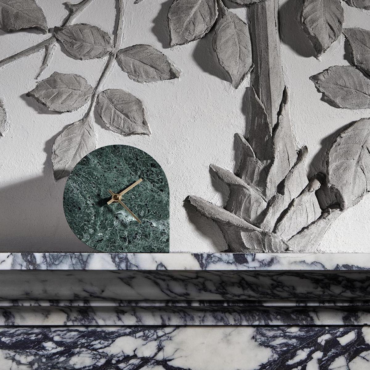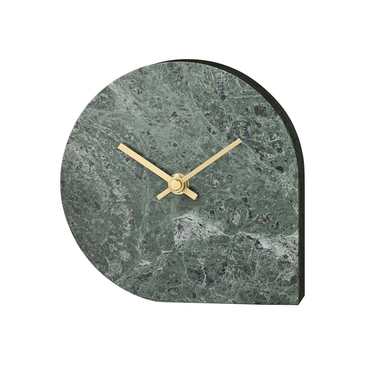 Add statement Scandinavian design to your interior with this Stilla clock from AYTM. Crafted from rippling green marble, this clock is in a striking asymmetrical shape that will be eye-catching on any mantelpiece or shelf. Finished with two brass coloured hands to stylishly track the time, it is a testament to contemporary Danish design.