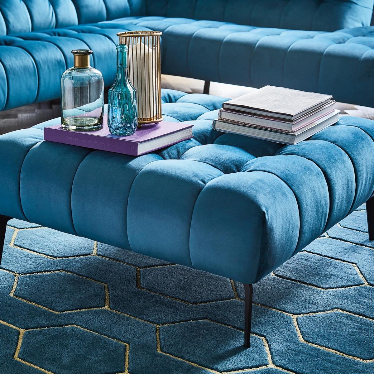 Design. The perfect accompaniment to the Azalea Corner Sofa, the Azalea Footstool boasts a sumptuous plump design, with foam cushioning and luxuriously vintage button-through upholstery. Pairing a contemporary, clean lined base with a curvaceous cushion, the Azalea captures modern elegance through its tapered iron feet and plush velvet that feels as good as it looks. The ideal place to rest your feet after a long day, the Azalea is suitable for adding a touch of luxe to any room. Choose between rich teal, deep navy, sophisticated black or versatile grey.