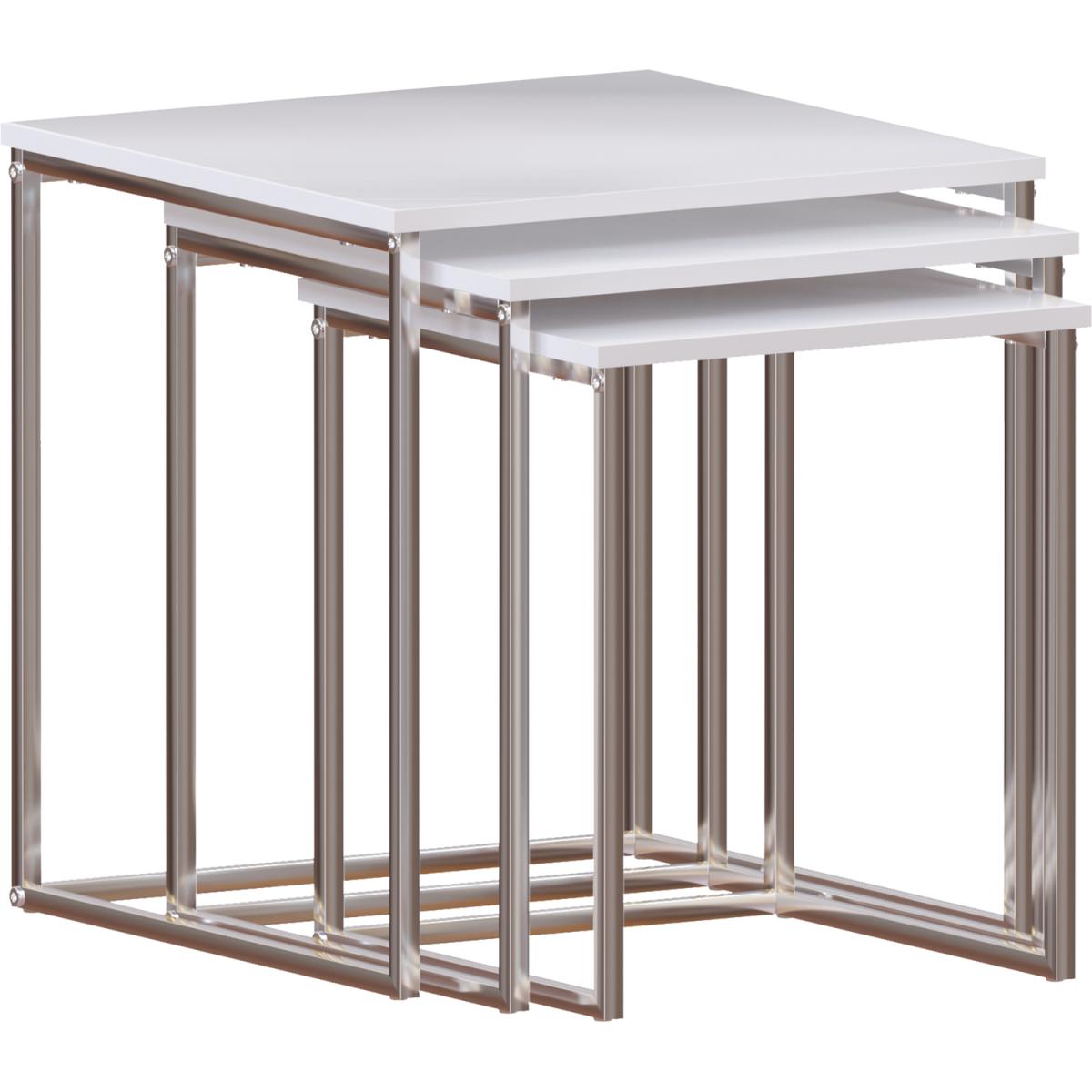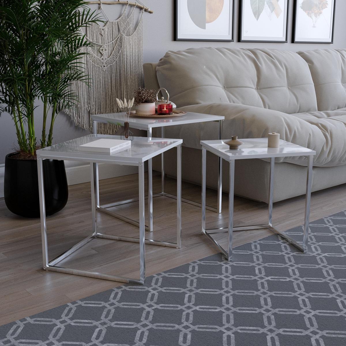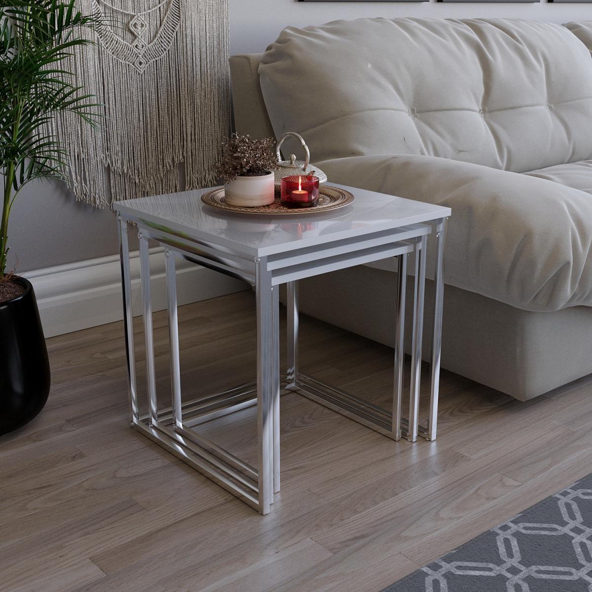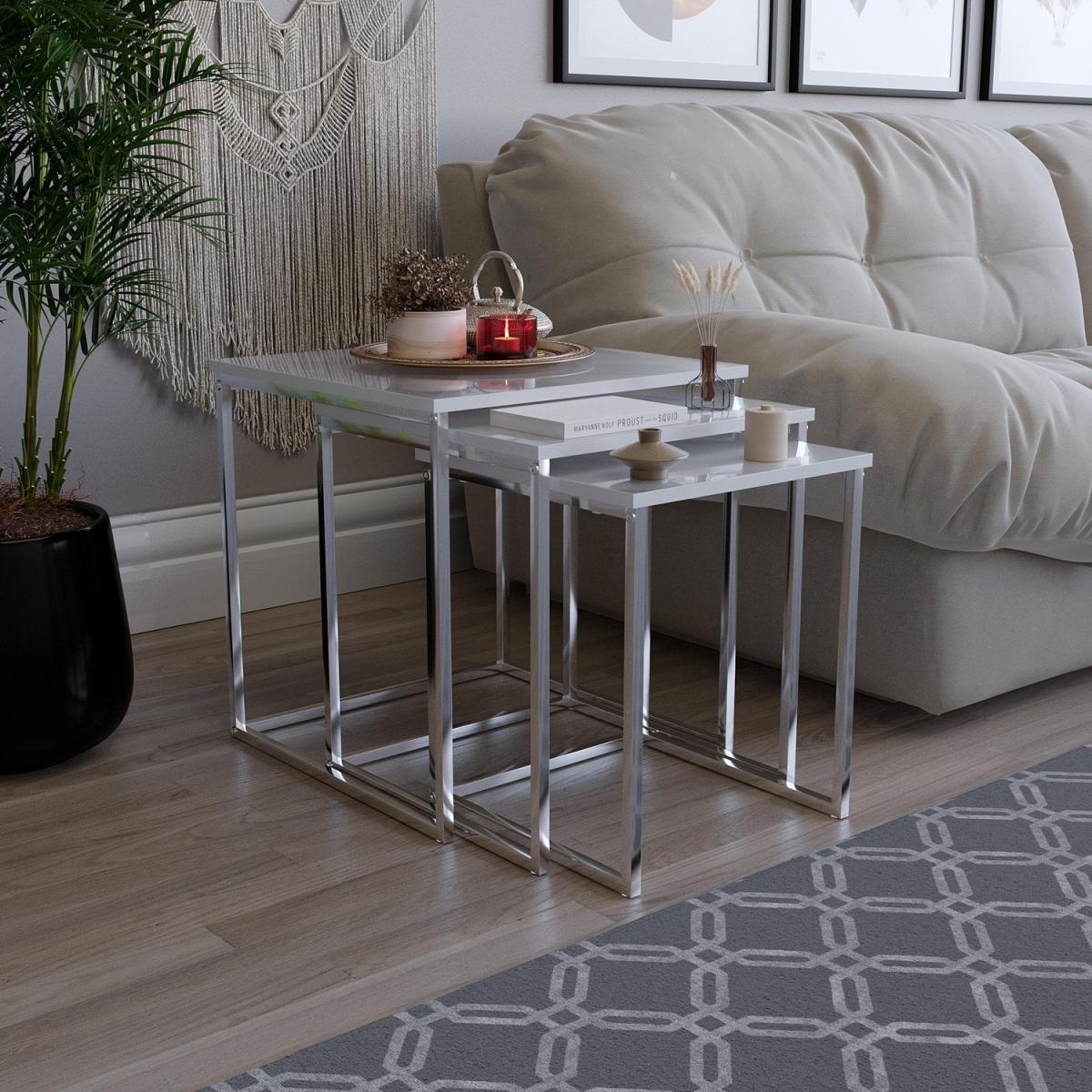 I love this set because of its sleek, modern look that can seamlessly blend into both contemporary and minimalist interiors. The white finish keeps the tables feeling fresh and versatile, perfect for brightening up living rooms or even bedrooms. These nest tables are great for practical styling-they can be stacked together to save space or pulled apart for when you need extra surface area for drinks or décor. For a polished look, pair them with neutral-toned accessories like vases or candles, and they work well on light or patterned rugs to add layers of interest without overwhelming the space. They're a practical yet stylish choice for adding functionality without compromising on style.