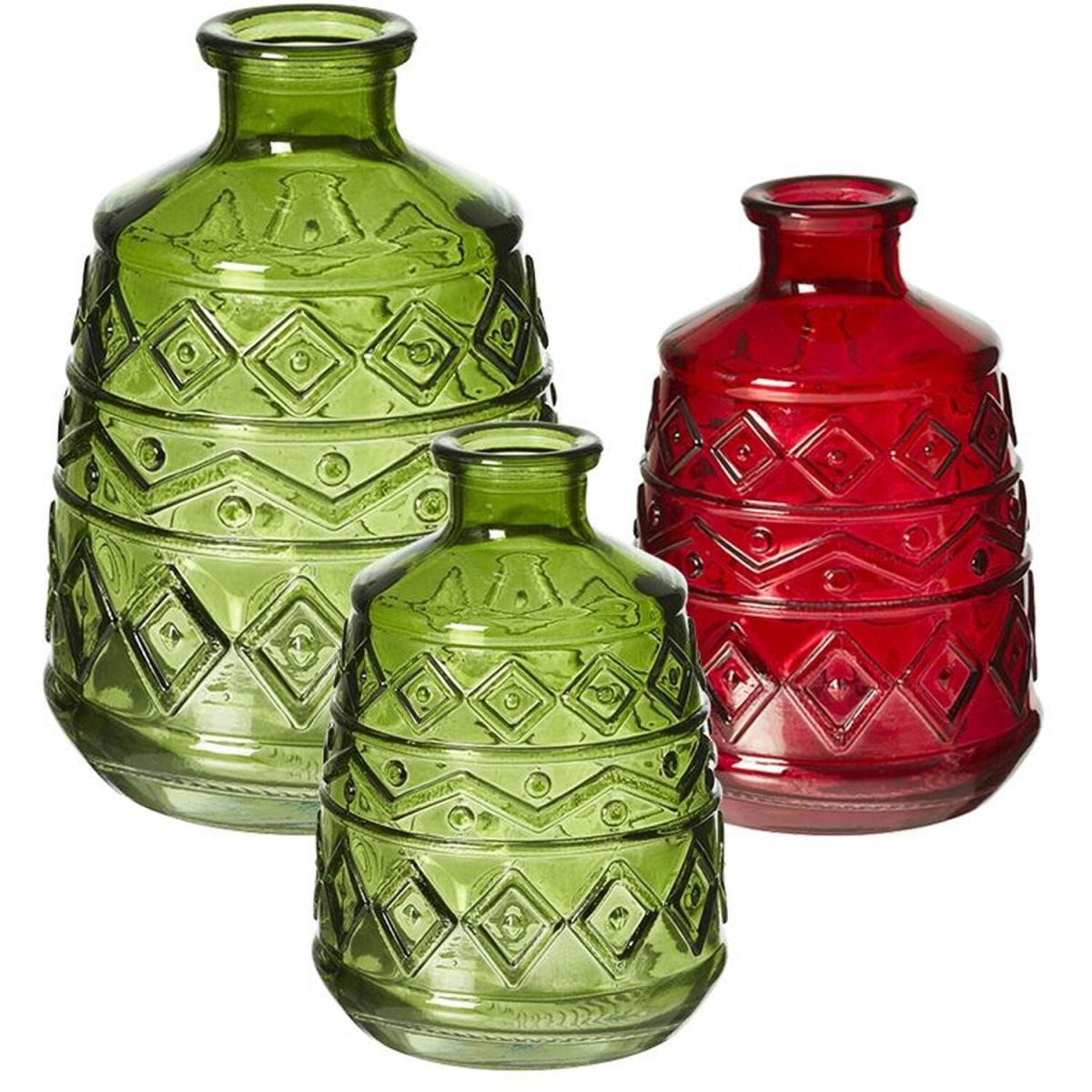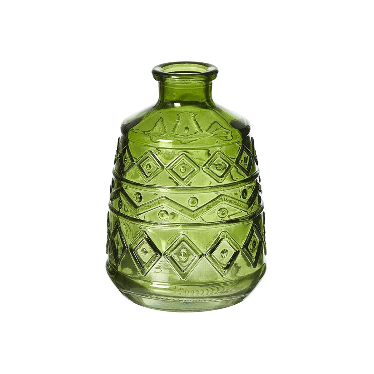 Red or Green glass vase with an embossed Aztec pattern. Ideal as a table centrepiece for any occasion. On-trend design. Ideal for small flower arrangements, use with fresh or artificial flowers.