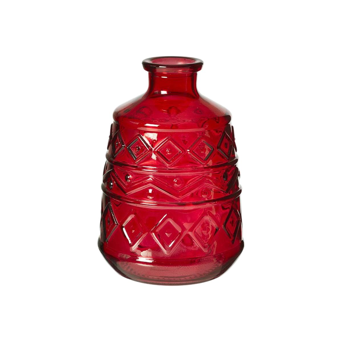 Red or Green glass vase with an embossed Aztec pattern. Ideal as a table centrepiece for any occasion. On-trend design. Ideal for small flower arrangements, use with fresh or artificial flowers.