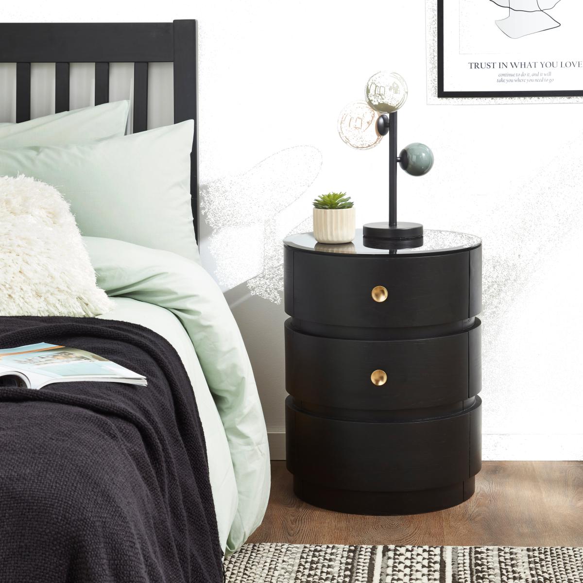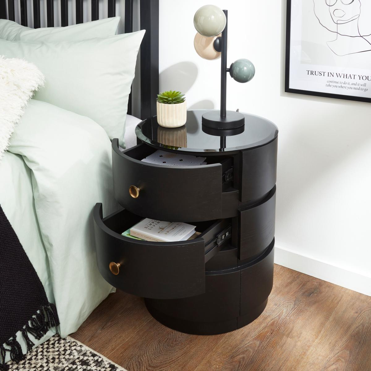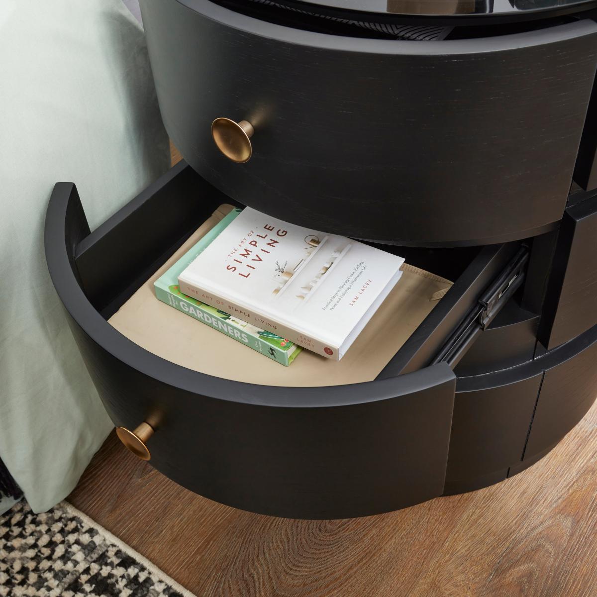 I really like the Azula bedside table - it’s a sleek, modern piece that adds a touch of sophistication to various interiors. Its clean black finish works well in contemporary and minimal spaces, but it can also provide a striking contrast in more eclectic or monochrome bedrooms. The rounded shape and gold handles give it a subtle chicness without being overly formal. For styling, I recommend layering with a simple table lamp, a small plant or decorative object, and perhaps a clock to keep practical use in mind. It’s a versatile piece that balances form and function, making it an excellent addition for both practical bedside storage and aesthetic appeal.