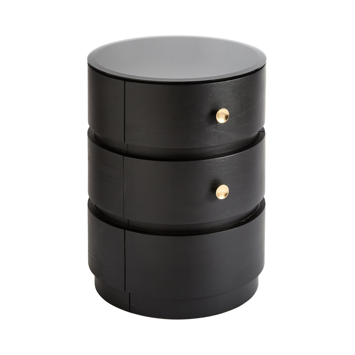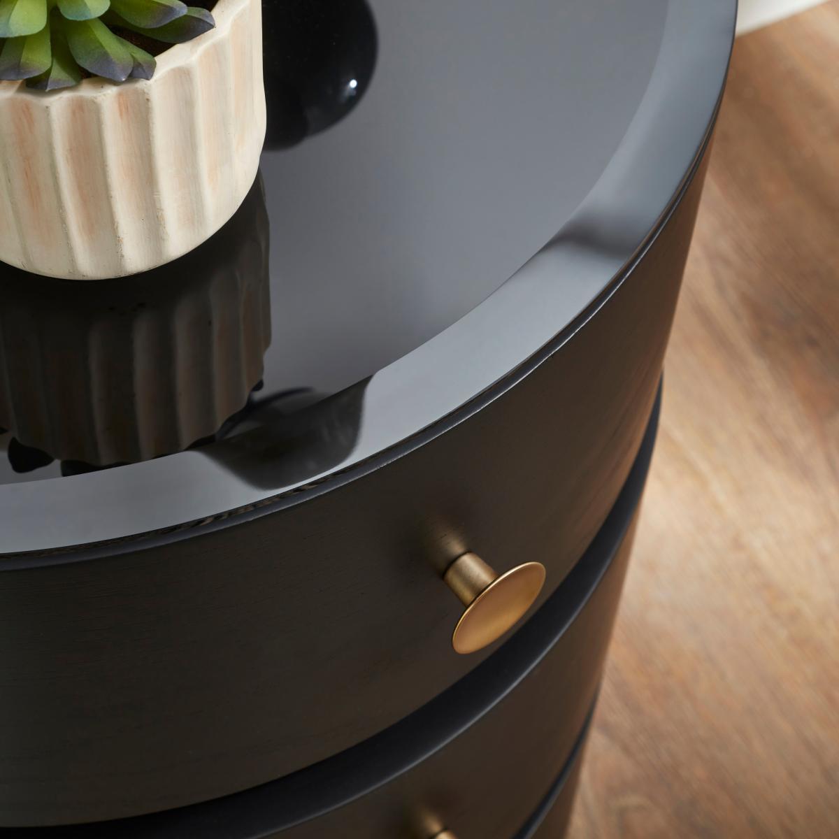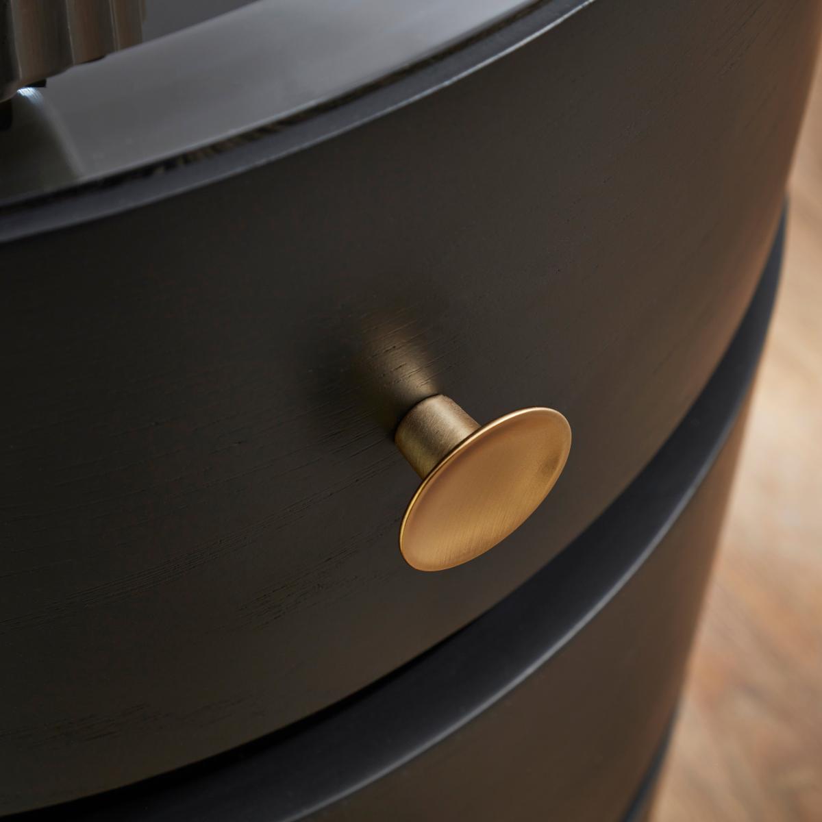 I really like the Azula bedside table - it’s a sleek, modern piece that adds a touch of sophistication to various interiors. Its clean black finish works well in contemporary and minimal spaces, but it can also provide a striking contrast in more eclectic or monochrome bedrooms. The rounded shape and gold handles give it a subtle chicness without being overly formal. For styling, I recommend layering with a simple table lamp, a small plant or decorative object, and perhaps a clock to keep practical use in mind. It’s a versatile piece that balances form and function, making it an excellent addition for both practical bedside storage and aesthetic appeal.