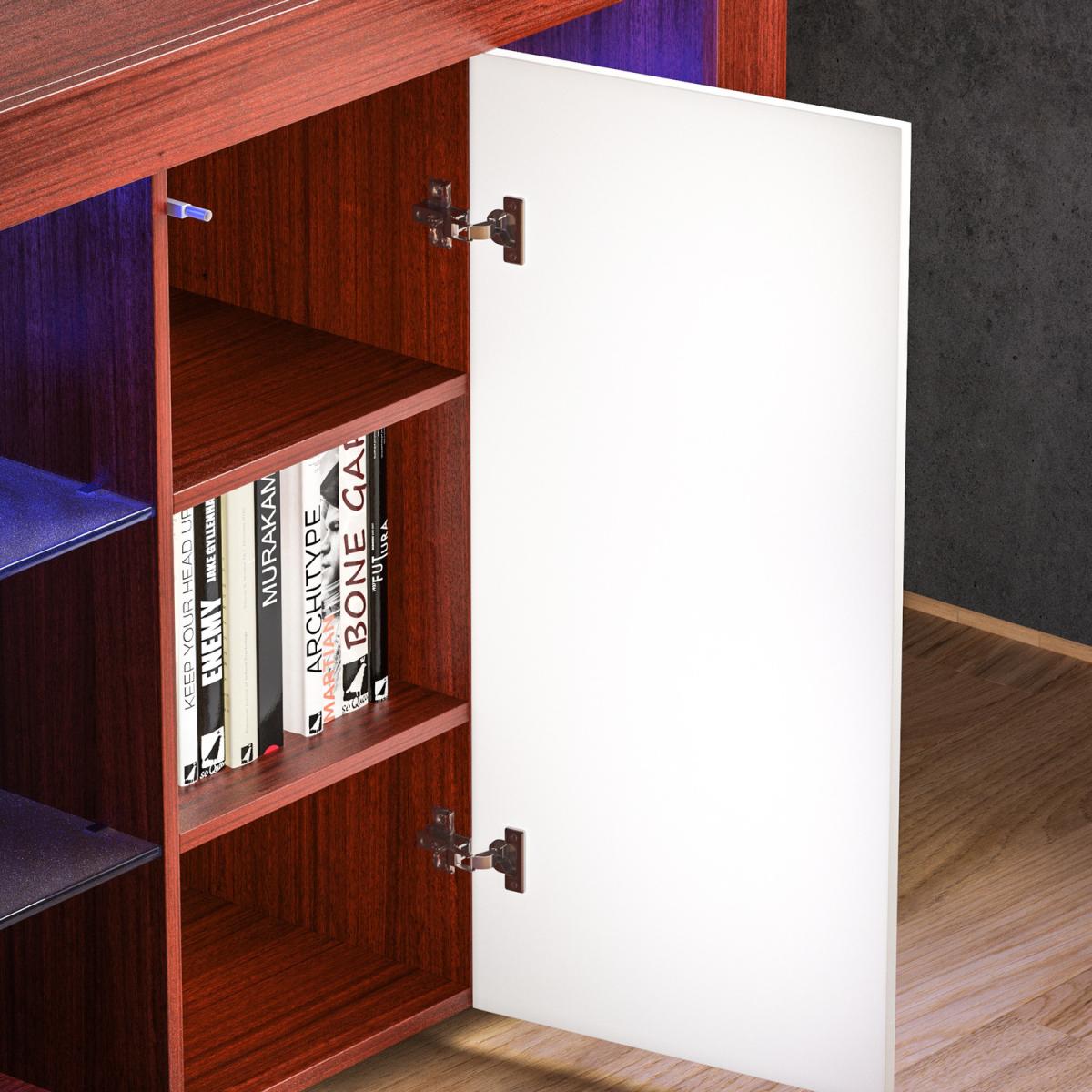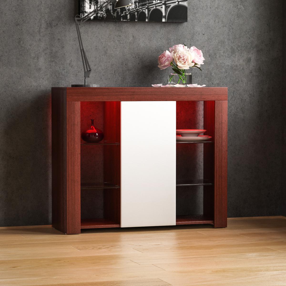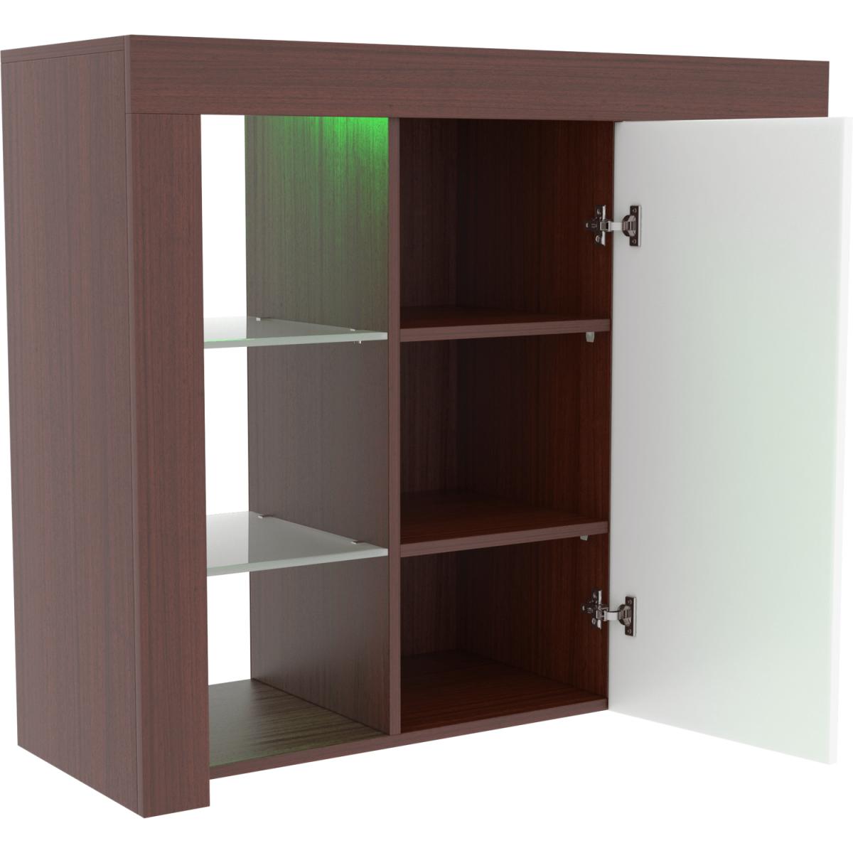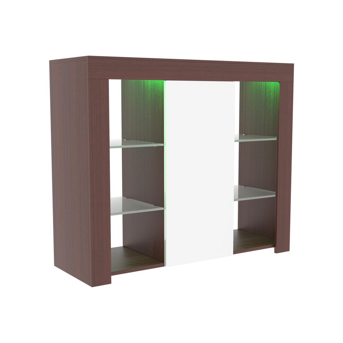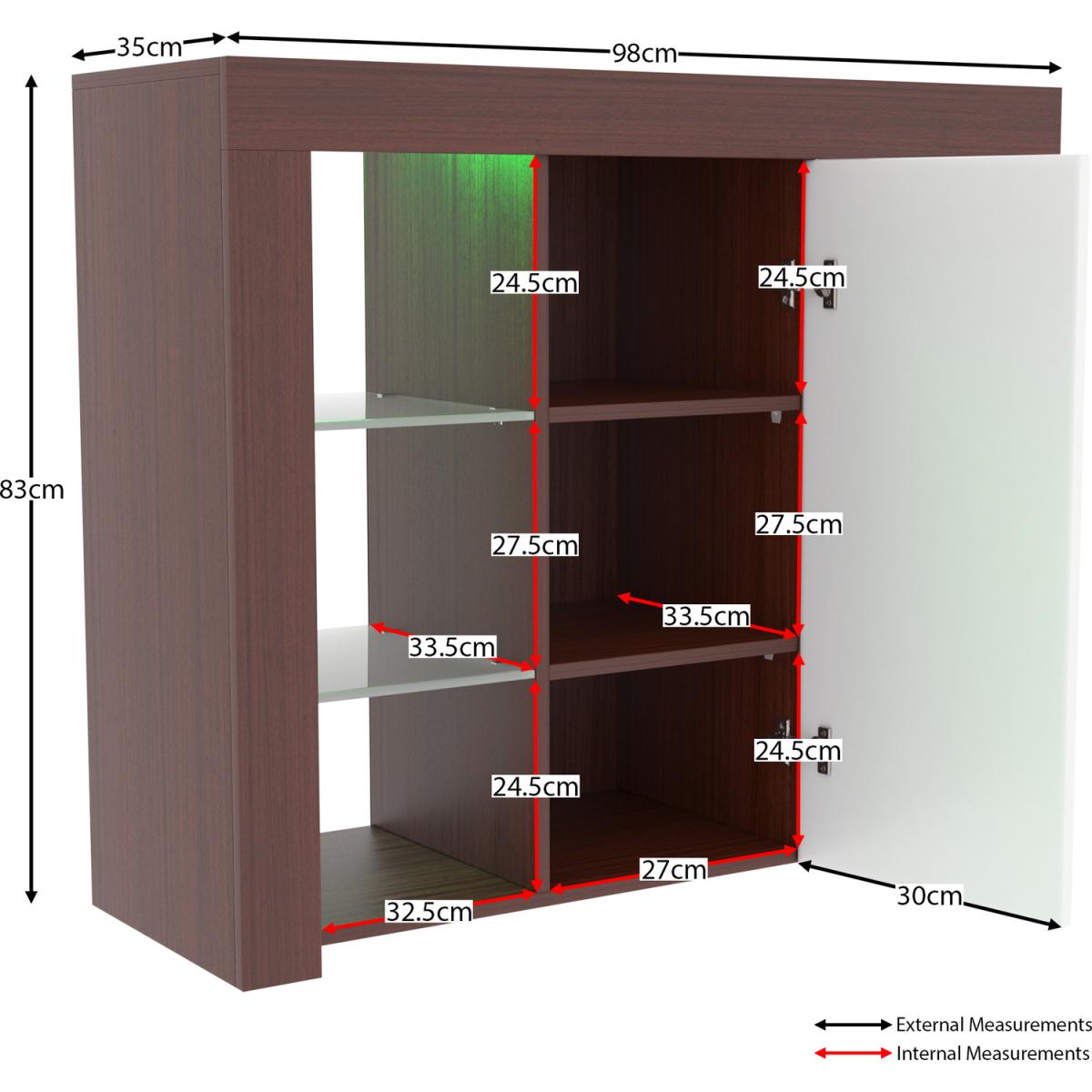 This new and modern stylish product, Azura 1 Door LED Sideboard, will help you keep your living room neat and tidy while adding a chic touch. Featuring 2 glass shelves, 1 door containing 2 additional shelves and LED lighting, it leaves plenty of space to store all your items whilst transforming your room from any decor to a more contemporary one. The door also features a magnetic latch for safely and securely closing the door. The sideboards includes a multi-colour LED backlight which can switch between a variety of colours with various effects such as strobe and fade.