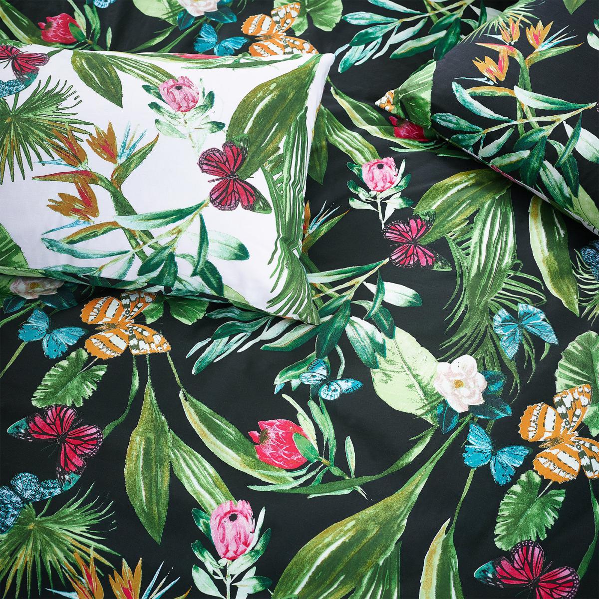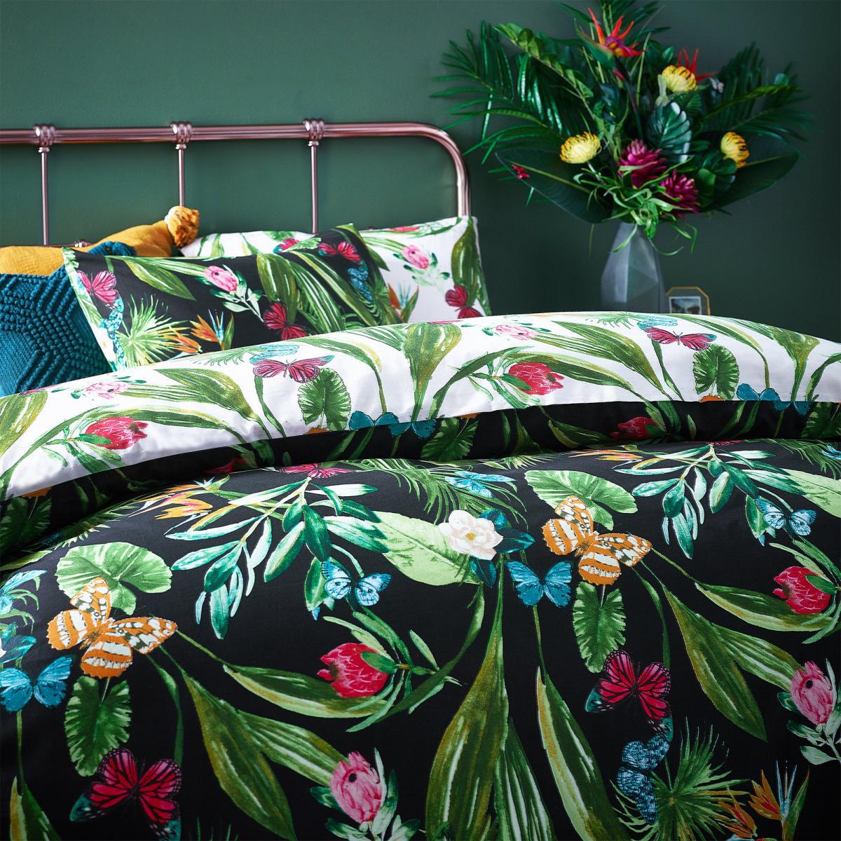 A beautiful botanical inspired design of bright butterflies fluttering across the duvet cover set. A complimenting design is printed on the reverse. The crisp 50/50 polycotton composition makes the duvet cover set hard-wearing but also soft to touch. Clear buttons close the duvet which also allows easy duvet removal. Care Instructions:.