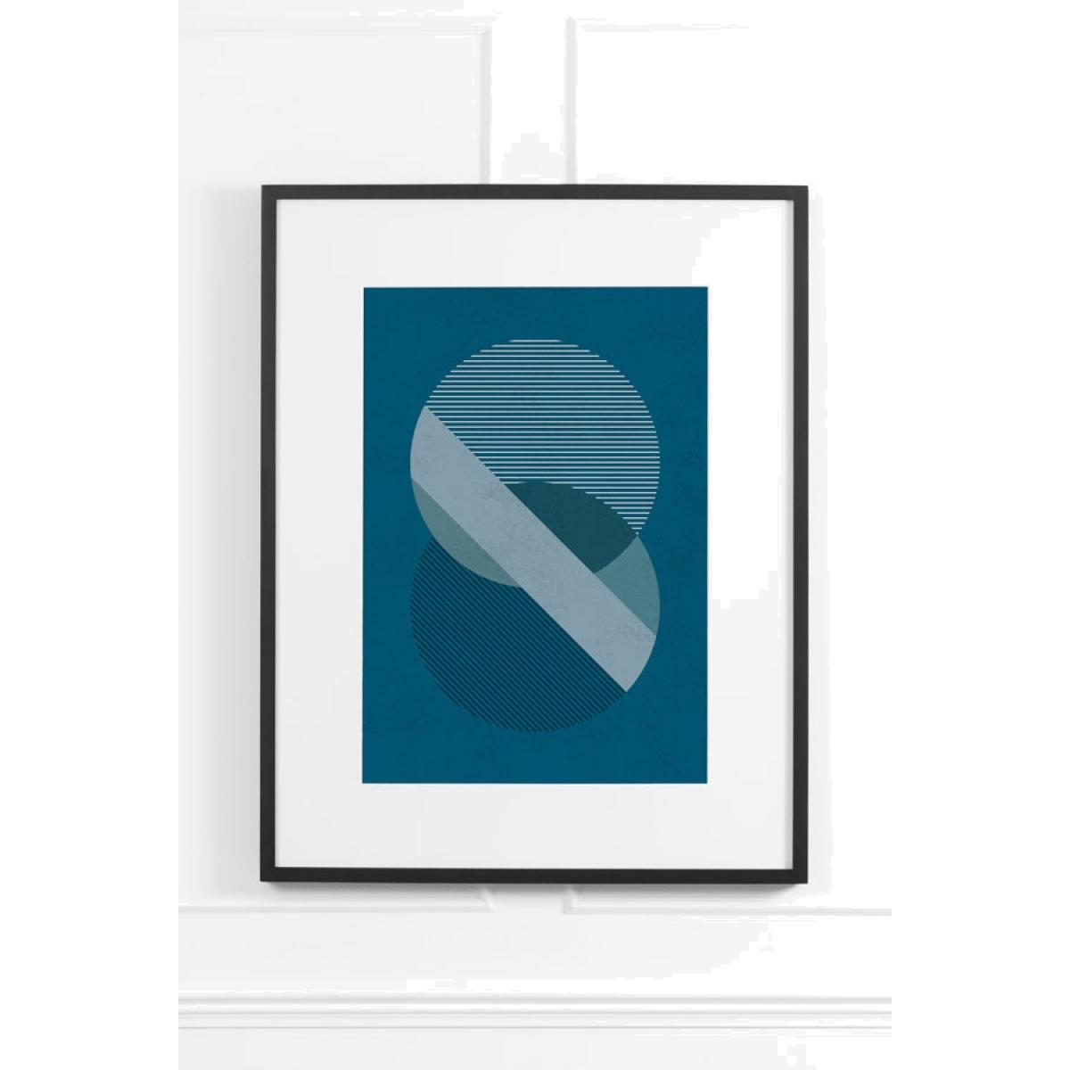 A geometric print featuring layered circles in shades of teal. 250gsm paper with a satin finish complete with an elegant matte black wooden frame.