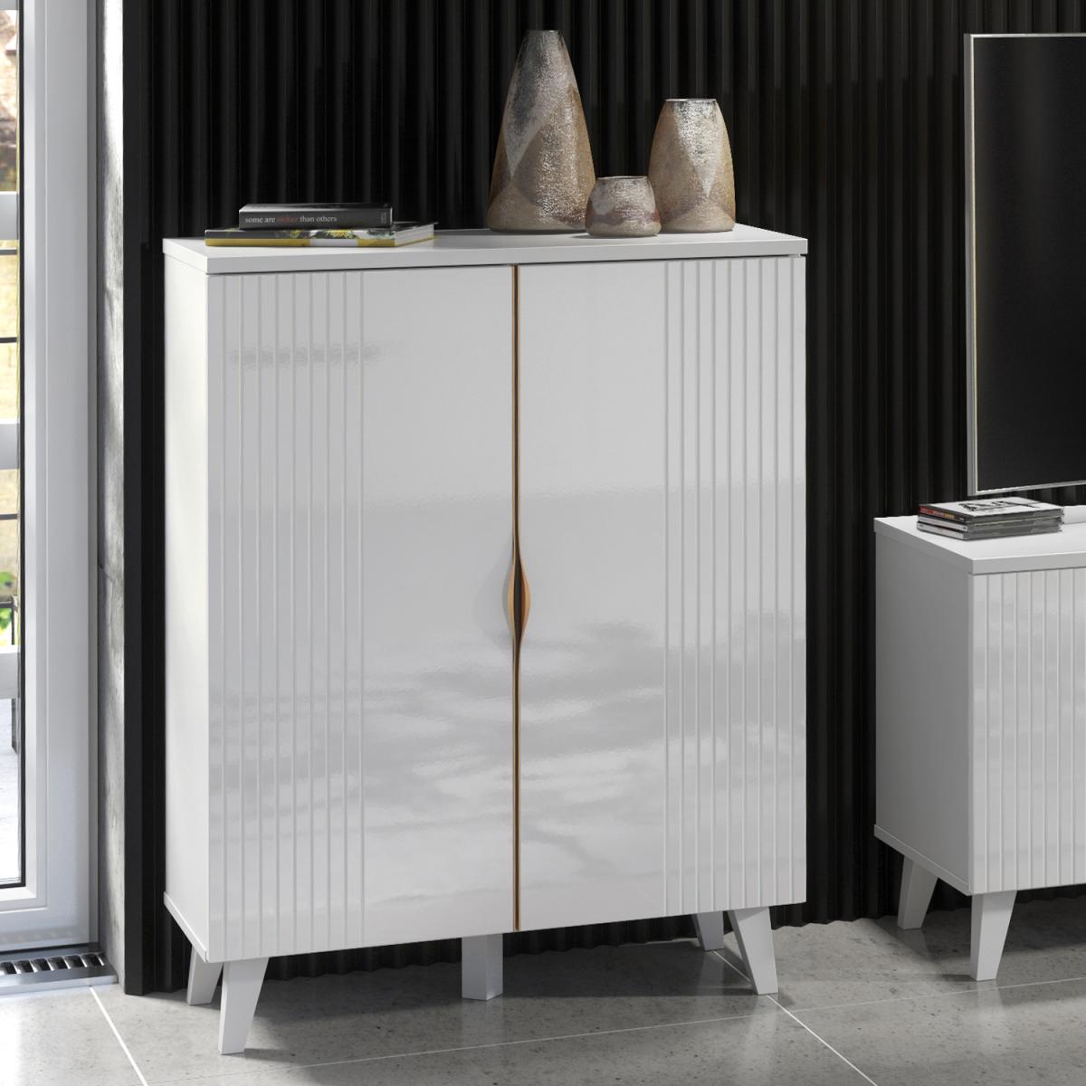 The cabinet is charcterised by a high gloss white finish to the doors with the rest of the body (top, sides and inside) in a matt white finish and brushed gold handles. The unit features enclosed storage space with two shelves inside. Dimensions: (WxHx. D): 70x94x35cm. Note that this is a flatpack item and will require assembly. Picture instructions, and a written notice are included with the item, these should be looked over carefully, before attempting assembly. Delivery is via a tracked UK courier (24/48 hour service), any questions relating to delivery can be put to us. This is a basic delivery service, delivery is to the front door of the building only. If you require additional delivery services, please contact us for details. Any damages or faults must be put to us before attempting assembly. You should not begin assembly until your problem is resolved by a member of our customer support team. Damage reported after assembly of the item will not be considered for return/refund, this may be the result of improper assembly. We are unable to accept returns of items that have been previously assembled or partially assembled. If you are not satisfied with your purchase, you can return the product for a refund, within 30 days after delivery. Any product you return must be in the original packaging in the condition that you received it, unused, including all internal protective packaging, and appropriately secured as before. We cannot accept returns of items that have been assembled, these will be treated as 'used'. Please note that returns must be made at buyer's own cost.