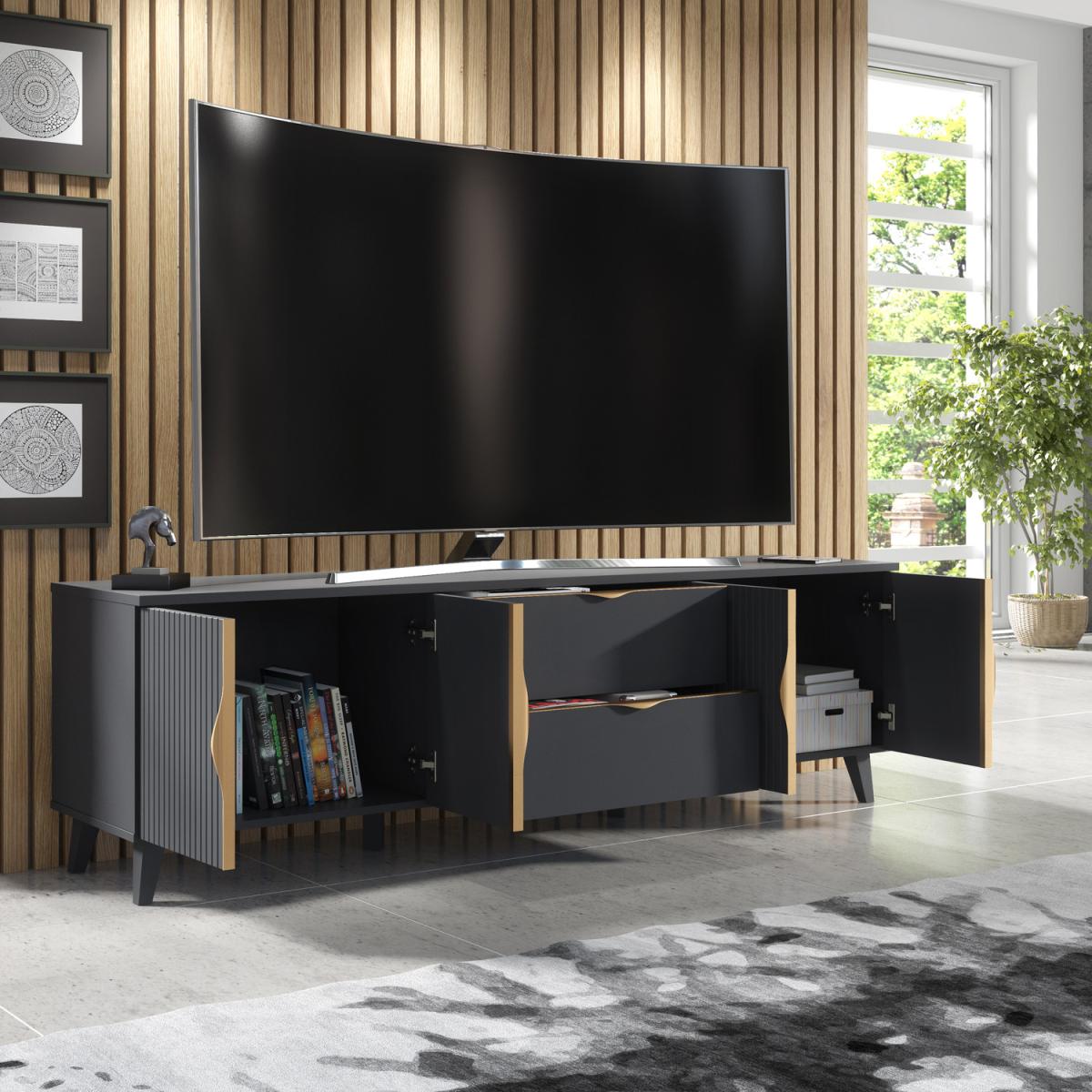 The unit is characterised by two outer cupboards, each with two milled doors, and central two drawers for storage. Suitable for TV's up to 75in. LED lights are included, they are mains powered with a UK power adapter and foot switch to turn them on and off.
