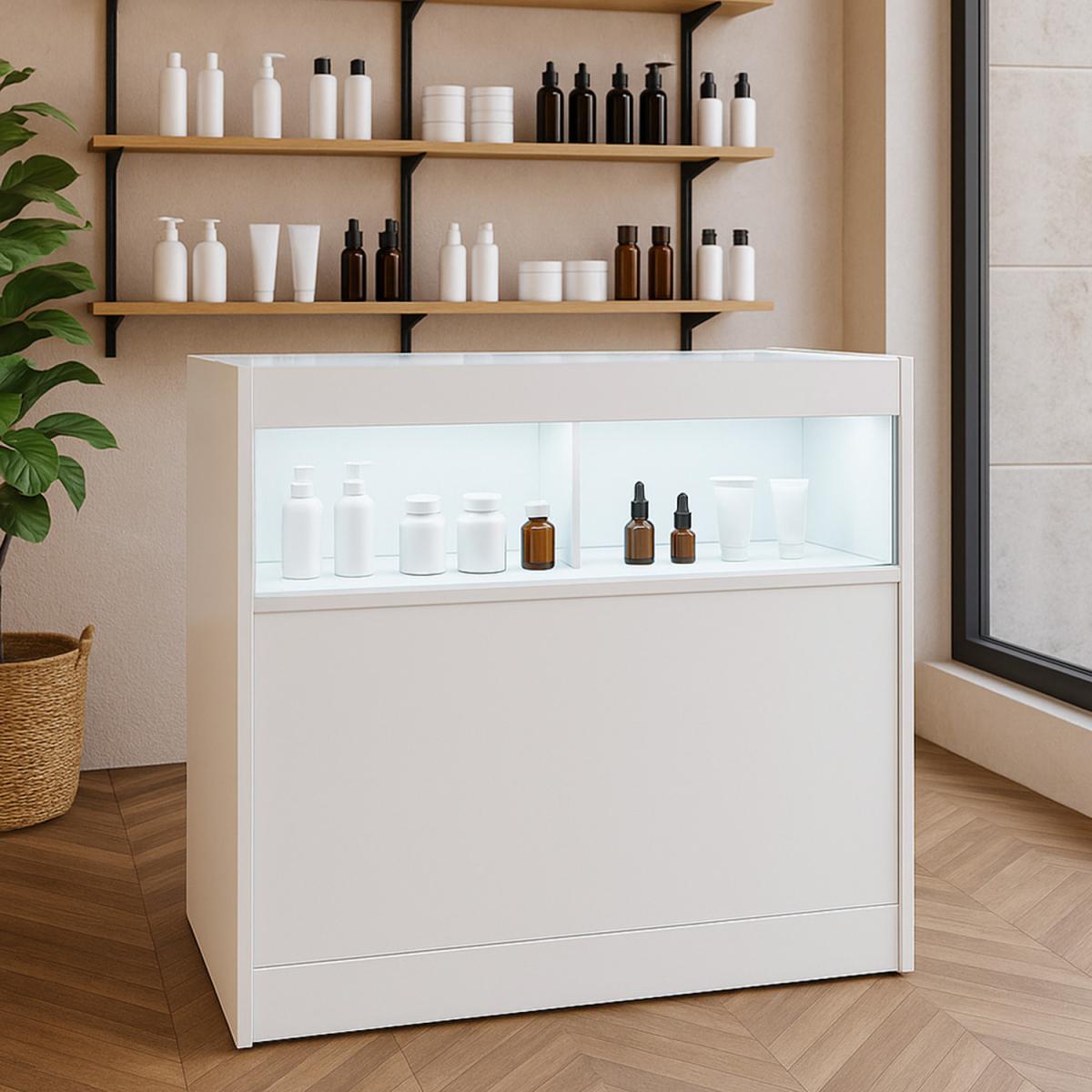 Designed to bring a sleek, modern edge to any retail environment, the B900 LED shop counter offers both style and practicality in equal measure. Ideal for retail settings such as clothing boutiques and jewellery shops, this elegant display counter is crafted to catch the eye while providing secure and efficient product presentation. Constructed from high-quality MDF with a durable melamine finish and toughened glass panels, the B900 counter is built for lasting performance in busy commercial settings. The bright white LED lighting adds a crisp, professional glow to your display items, ensuring that products are showcased to their best advantage even in lower-light conditions. The counters clean exterior enhances its premium look, making it a refined addition to both contemporary and classic store layouts.