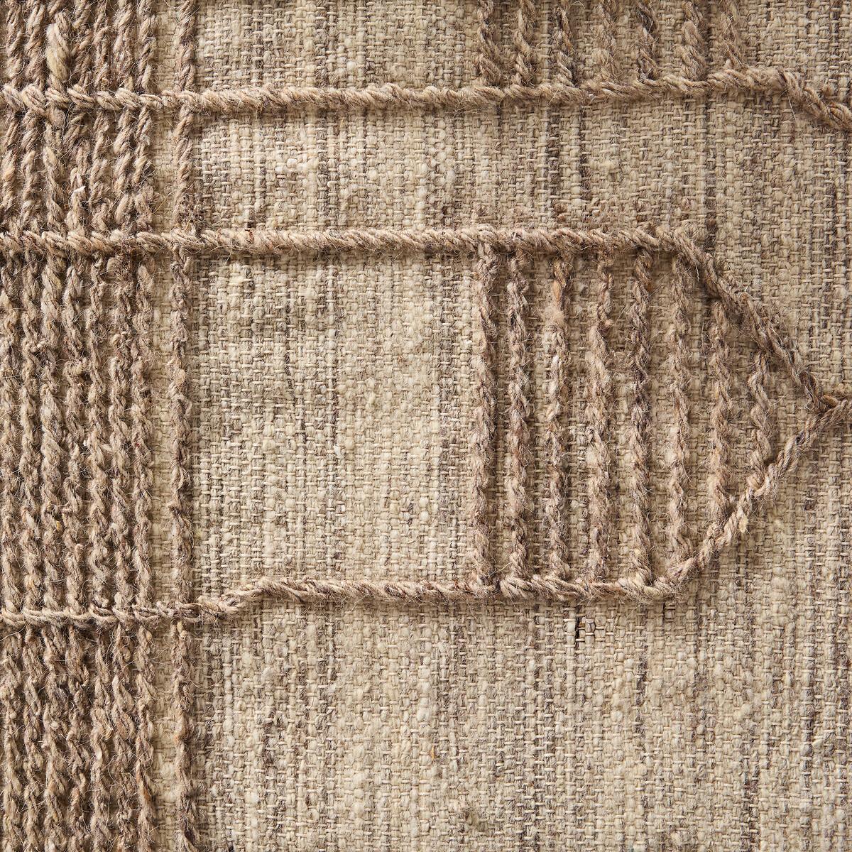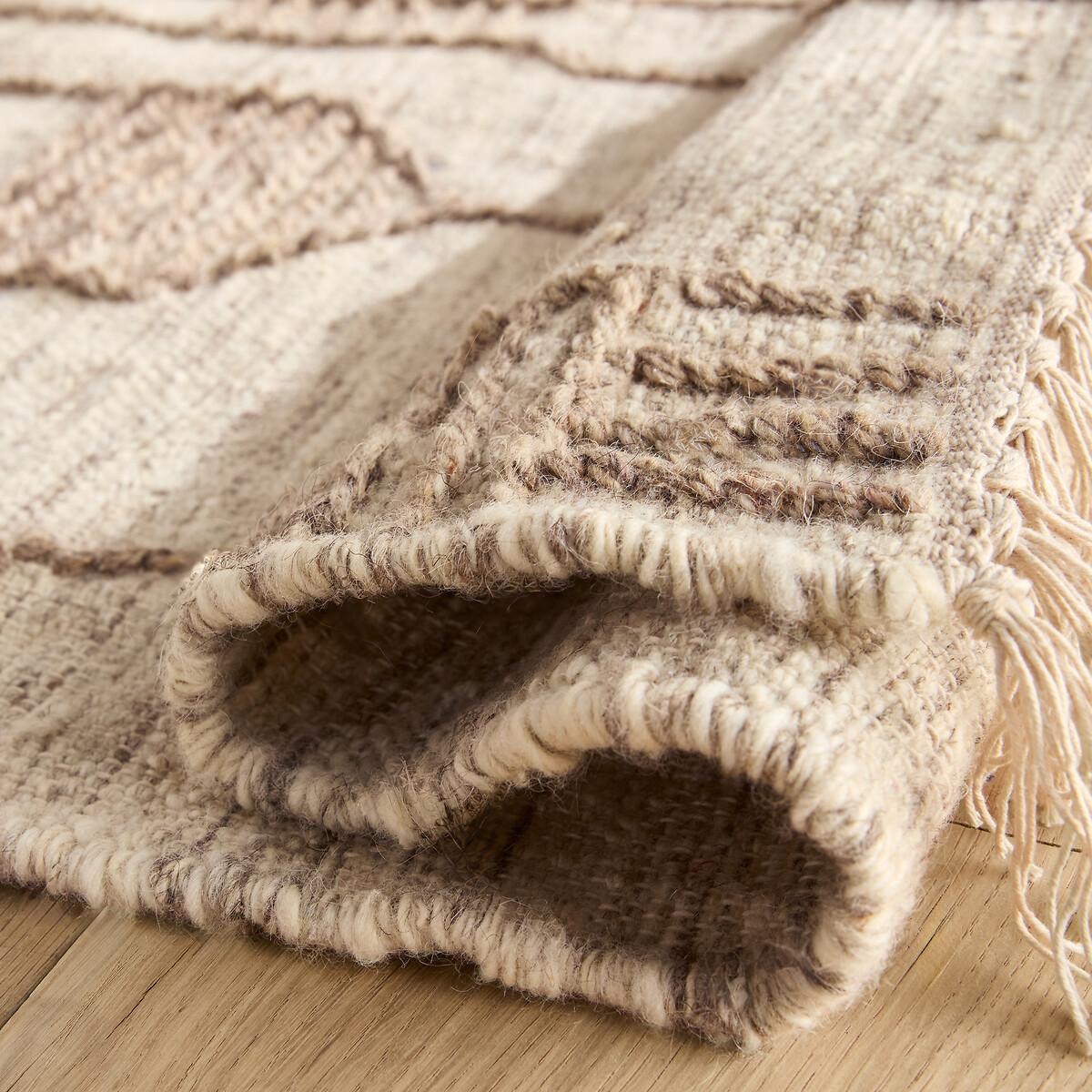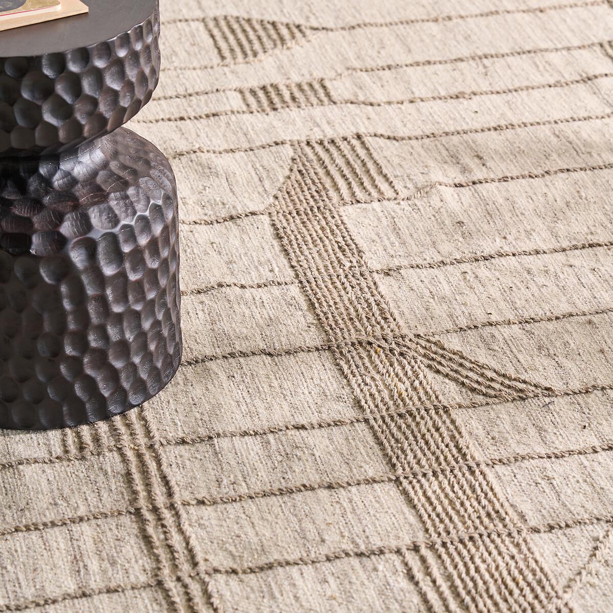 Its design, inspired by nomadic symbols, creates free geometric shapes. Embroidered on a textured base, they create harmonious lines and 3D textures, enhanced by a combo of natural tones, veering between rock and sand. All our rugs are handcrafted, a guarantee of quality and uniqueness. Real decorative elements, thermal and sound insulators, they warm the atmosphere. Product Details • 84% wool, 16% cotton • Craftsmanship: hand woven • Weight: 1500gsm • Pile height: Flat woven. Quality Info • Wool is a warm and comfortable natural fibre. In addition to being resistant to wear and durable over time, the wool carpet is also an excellent thermal and sound insulator. • Each piece is handcrafted, according to ancestral know-how. There may therefore be slight variations in colour from one carpet to another.. They contribute to the beauty of each piece and make it unique. Care Advice • Some materials such as wool are very fibrous and you can actually observe a piling during the first weeks of use: this is a normal for this type of product and is not a defect. Remove the excess fibres by hand where possible, do not use a vacuum cleaner with a rotating brush as this can pull and tear the fibres. The pilling will improve over time. • For maintenance, we advise you to vacuum it very little the first month and then to vacuum it without rubbing too much always without using the brush. • Remove any stains immediately with a clean, damp cloth. • Dry clean recommended. Dimensions • Width 120 x Length 180cm • Width 160 x Length 230cm • Width 200 x Length 290cmDelivery:. Available for home delivery.