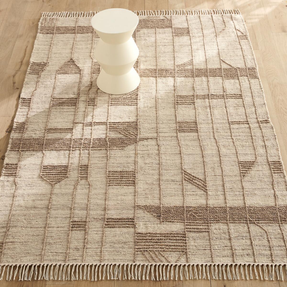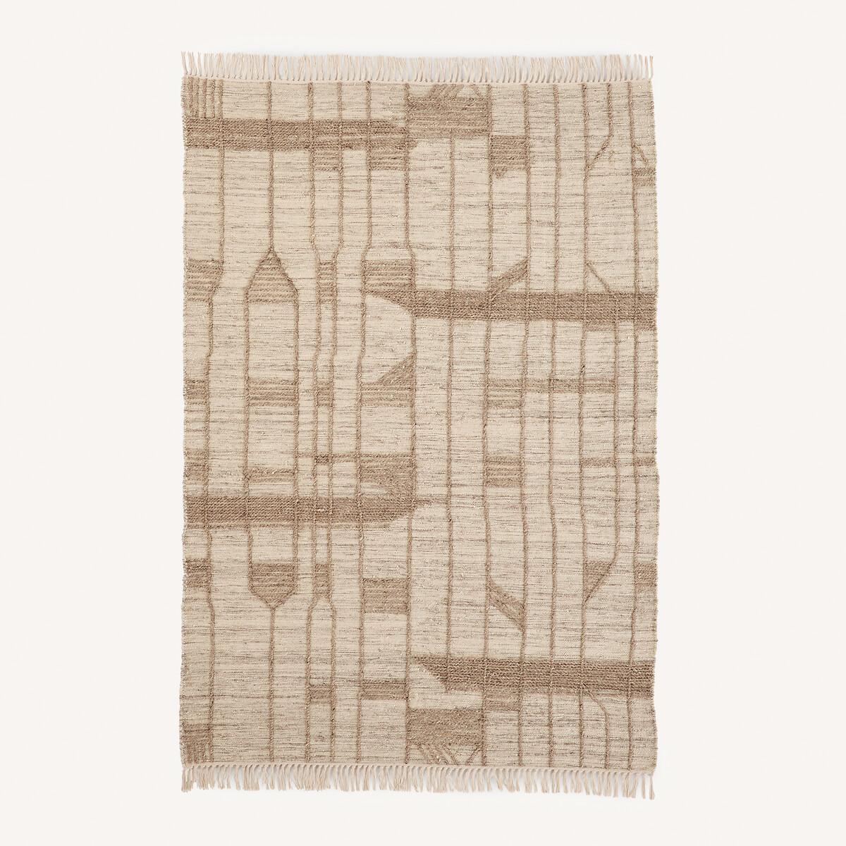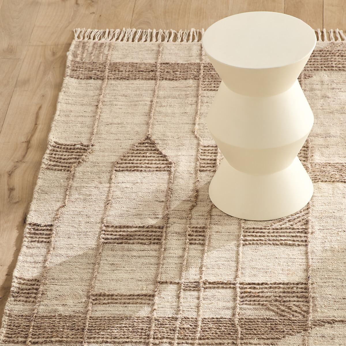 Its design, inspired by nomadic symbols, creates free geometric shapes. Embroidered on a textured base, they create harmonious lines and 3D textures, enhanced by a combo of natural tones, veering between rock and sand. All our rugs are handcrafted, a guarantee of quality and uniqueness. Real decorative elements, thermal and sound insulators, they warm the atmosphere. Product Details • 84% wool, 16% cotton • Craftsmanship: hand woven • Weight: 1500gsm • Pile height: Flat woven. Quality Info • Wool is a warm and comfortable natural fibre. In addition to being resistant to wear and durable over time, the wool carpet is also an excellent thermal and sound insulator. • Each piece is handcrafted, according to ancestral know-how. There may therefore be slight variations in colour from one carpet to another.. They contribute to the beauty of each piece and make it unique. Care Advice • Some materials such as wool are very fibrous and you can actually observe a piling during the first weeks of use: this is a normal for this type of product and is not a defect. Remove the excess fibres by hand where possible, do not use a vacuum cleaner with a rotating brush as this can pull and tear the fibres. The pilling will improve over time. • For maintenance, we advise you to vacuum it very little the first month and then to vacuum it without rubbing too much always without using the brush. • Remove any stains immediately with a clean, damp cloth. • Dry clean recommended. Dimensions • Width 120 x Length 180cm • Width 160 x Length 230cm • Width 200 x Length 290cmDelivery:. Available for home delivery.