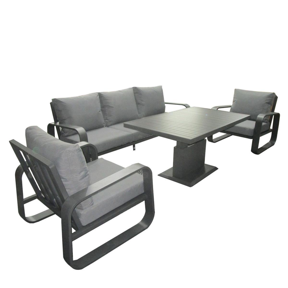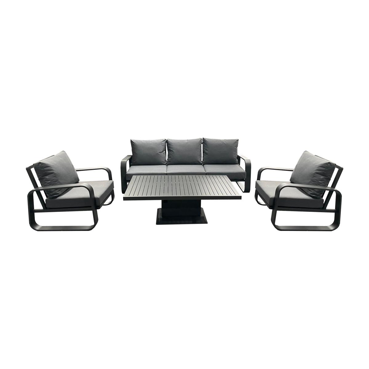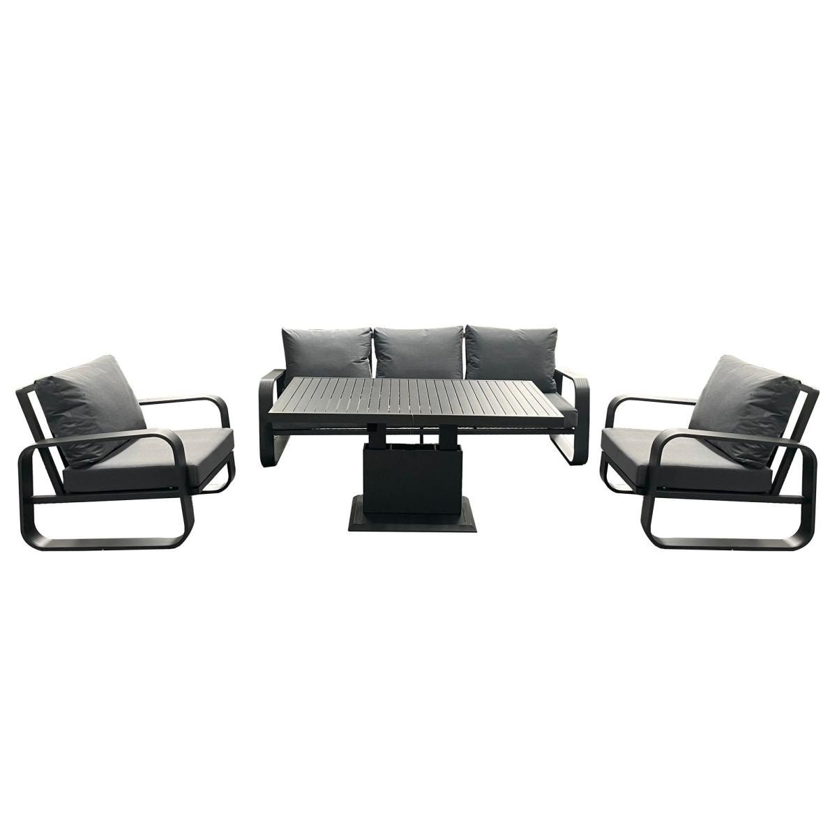 Lounging during the summer months just got so much more comfortable! With an easy reach high-level gas adjustable table, this lounge set is perfect for dining, relaxing, or entertaining. And with anti-scratch, anti-slide feet, you can rest assured that your outdoor area will remain looking its best. Made with sturdy powder-coated aluminium and shower-resistant seat and back cushions, this lounge set is the perfect addition to any outdoor space. The Babingley Lounge Set has a smooth curved frame in a desirable modern look so you know it will suit your garden style. Comfortable curved arms and reclined back rests in an open-slat design paired with the comfy cushions that are included mean you can really get to relax this summer.