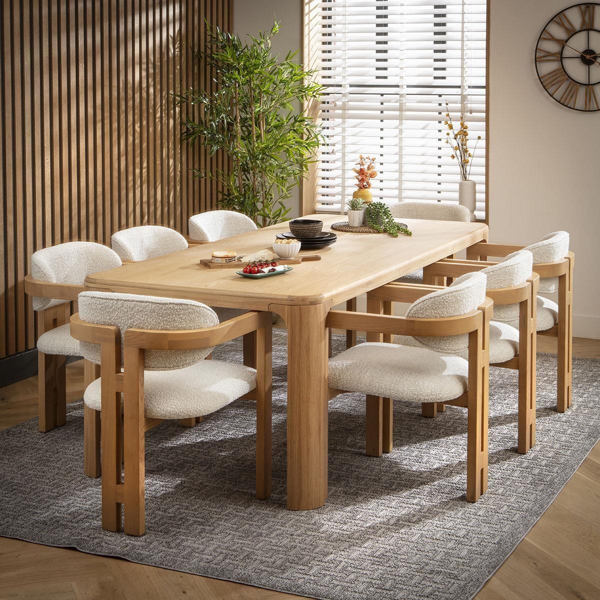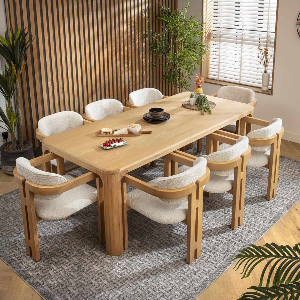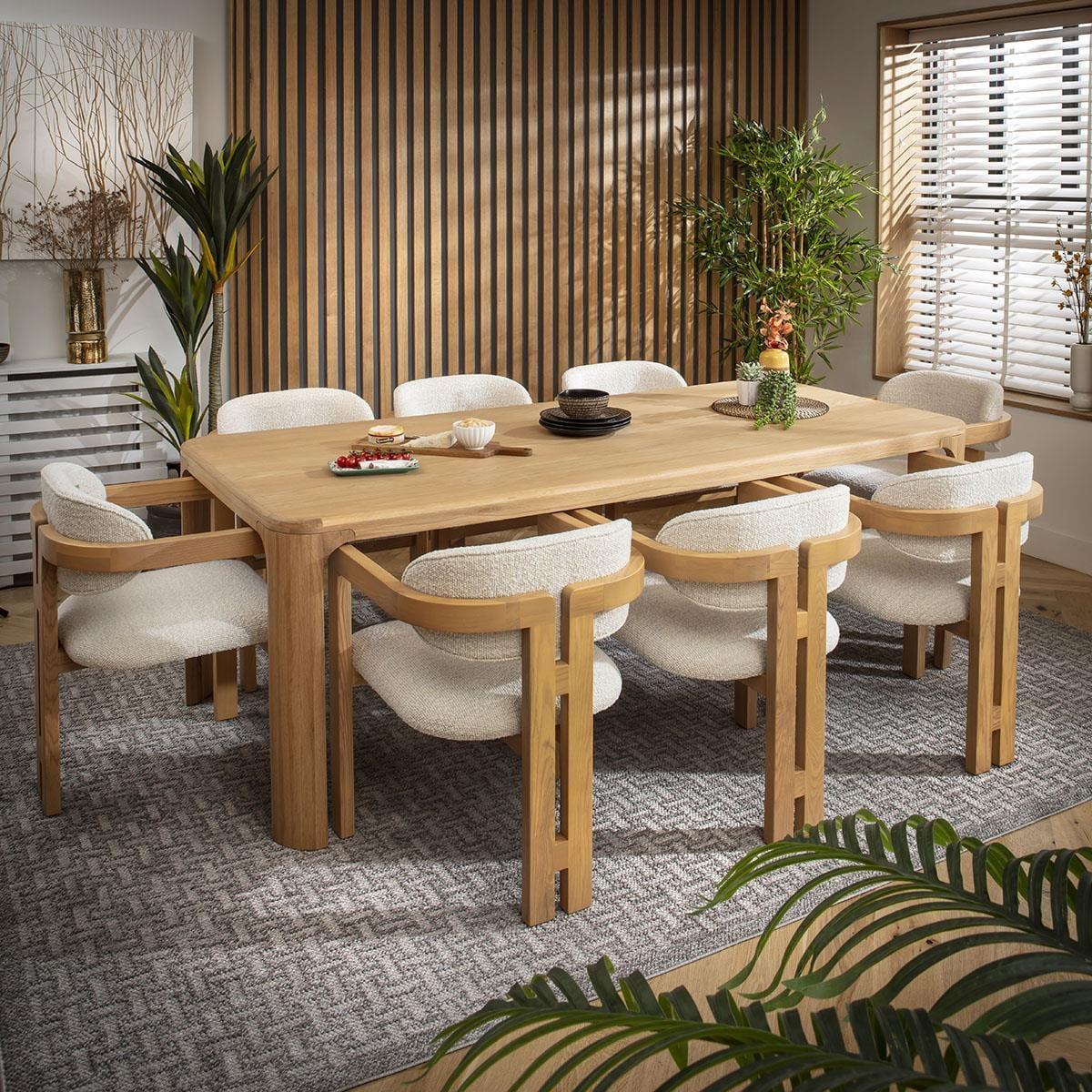 This 8 seater dining table and chairs set includes dining chairs crafted from solid ash wood with a natural finish and arms for a unique carver style, with a dining table crafted from oak with oak veneer, it boasts a modern design and a natural finish. This modern dining set is crafted for durability and comfort. Your dining experience will be elevated with this 8-seater wooden dining table. Crafted from solid oak with oak veneer, it boasts a modern, minimalist design and a natural finish. Perfect as a large wooden dining table for 8 people, its both stylish and functional. Upgrade your dining space with this stunning dining set, including 8 wooden dining chairs, blending Scandi design with modern elegance. Crafted from solid ash wood with a natural oak finish, they feature a wrap-around wooden frame, padded backrest, and arms for a unique carver style. Perfect for modern dining rooms. This 8 seater dining set combines modern Baboraz chairs with the stunning Beau table. Whether you love the Baboraz chairs and would like to purchase them individually, or you think the Beau table would complete your dining room decor better with another chair, you can easily mix and match our modern dining tables and chairs to curate something truly unique. Table Size W220cm D100cm H76cm Chair Size W58cm D58cm H80cm Modern Dining Table And Chairs Set For 8