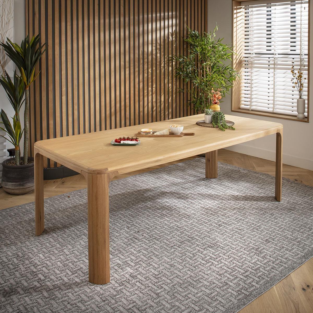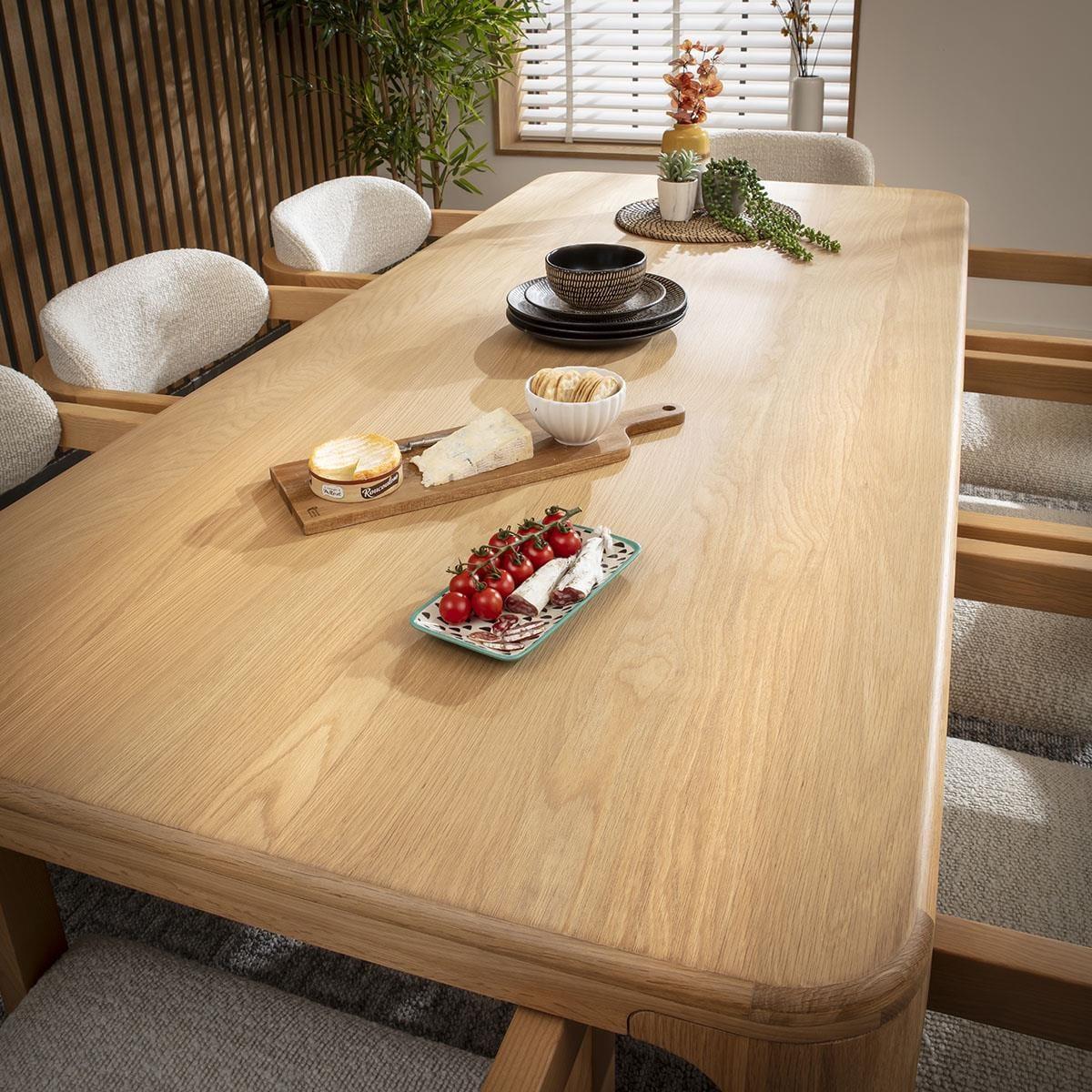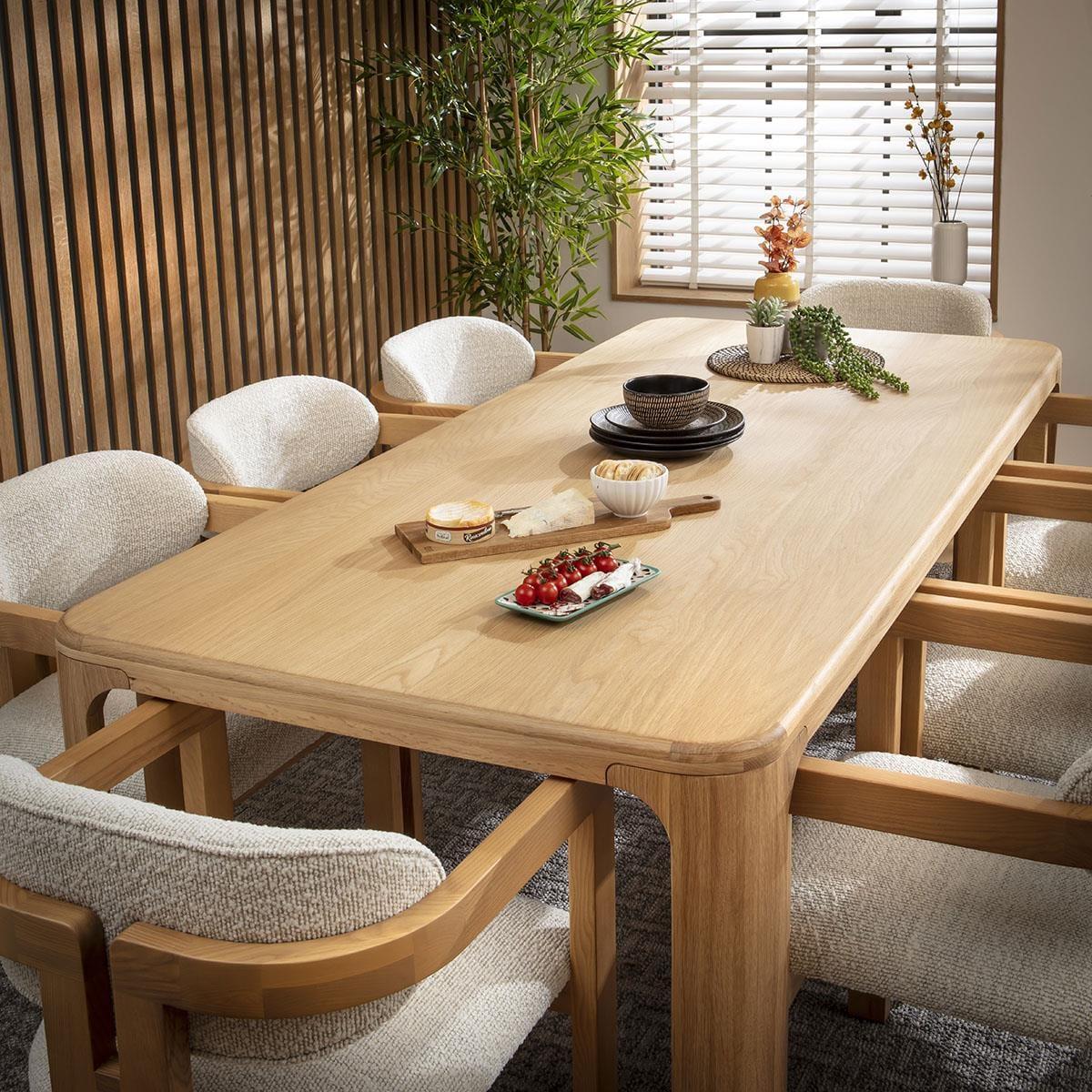 This 8 seater dining table and chairs set includes dining chairs crafted from solid ash wood with a natural finish and arms for a unique carver style, with a dining table crafted from oak with oak veneer, it boasts a modern design and a natural finish. This modern dining set is crafted for durability and comfort. Your dining experience will be elevated with this 8-seater wooden dining table. Crafted from solid oak with oak veneer, it boasts a modern, minimalist design and a natural finish. Perfect as a large wooden dining table for 8 people, its both stylish and functional. Upgrade your dining space with this stunning dining set, including 8 wooden dining chairs, blending Scandi design with modern elegance. Crafted from solid ash wood with a natural oak finish, they feature a wrap-around wooden frame, padded backrest, and arms for a unique carver style. Perfect for modern dining rooms. This 8 seater dining set combines modern Baboraz chairs with the stunning Beau table. Whether you love the Baboraz chairs and would like to purchase them individually, or you think the Beau table would complete your dining room decor better with another chair, you can easily mix and match our modern dining tables and chairs to curate something truly unique. Table Size W220cm D100cm H76cm Chair Size W58cm D58cm H80cm Modern Dining Table And Chairs Set For 8