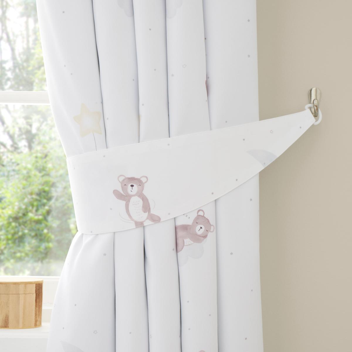 * Includes 2 x curtain panels* Eyelet header* Pair of Blackout curtains* Baby bears design* Coordinating Tiebacks available Perfect for your little cub, this pair of eyelet curtains is an adorable way to finish off your little one's bedroom. Designed with cute baby bears design all over. These curtains feature a blackout lining, reducing unwanted light giving your little one an uninterrupted and dreamy night sleep. Crafted from soft polyester material which can be dry cleaned. This collection is verified by OEKO-TEX and independently tested for harmful substances as well as manufactured using sustainable processes under socially responsible working conditions.