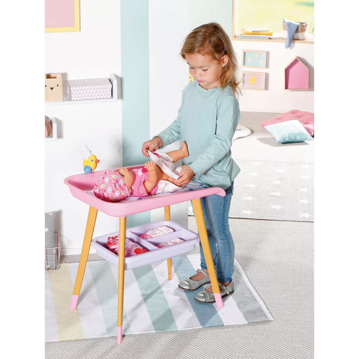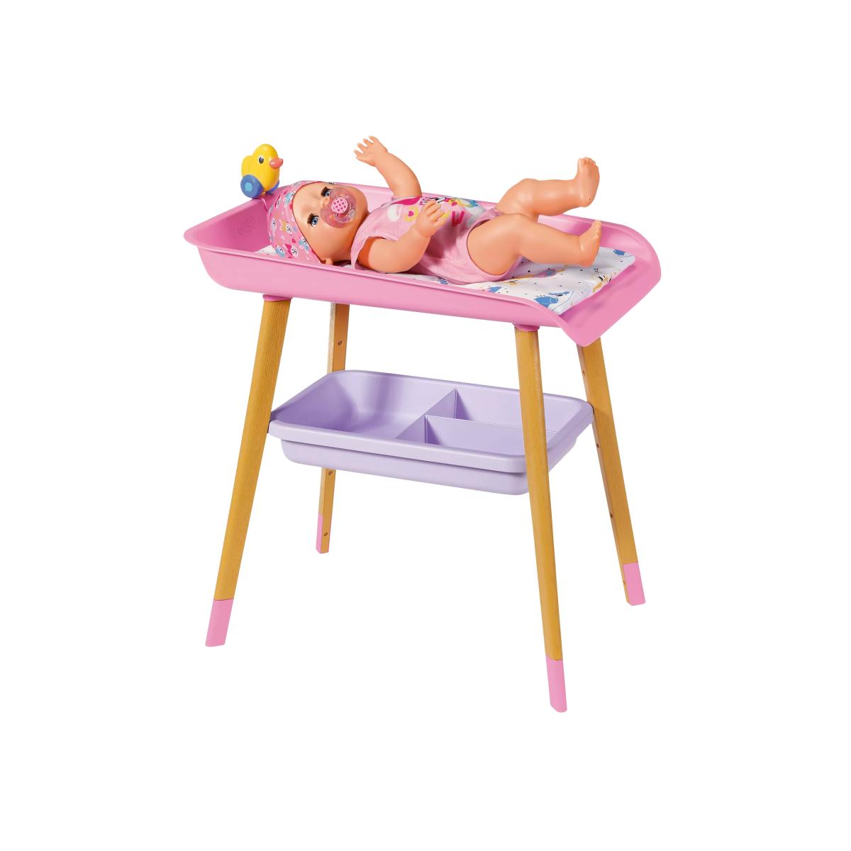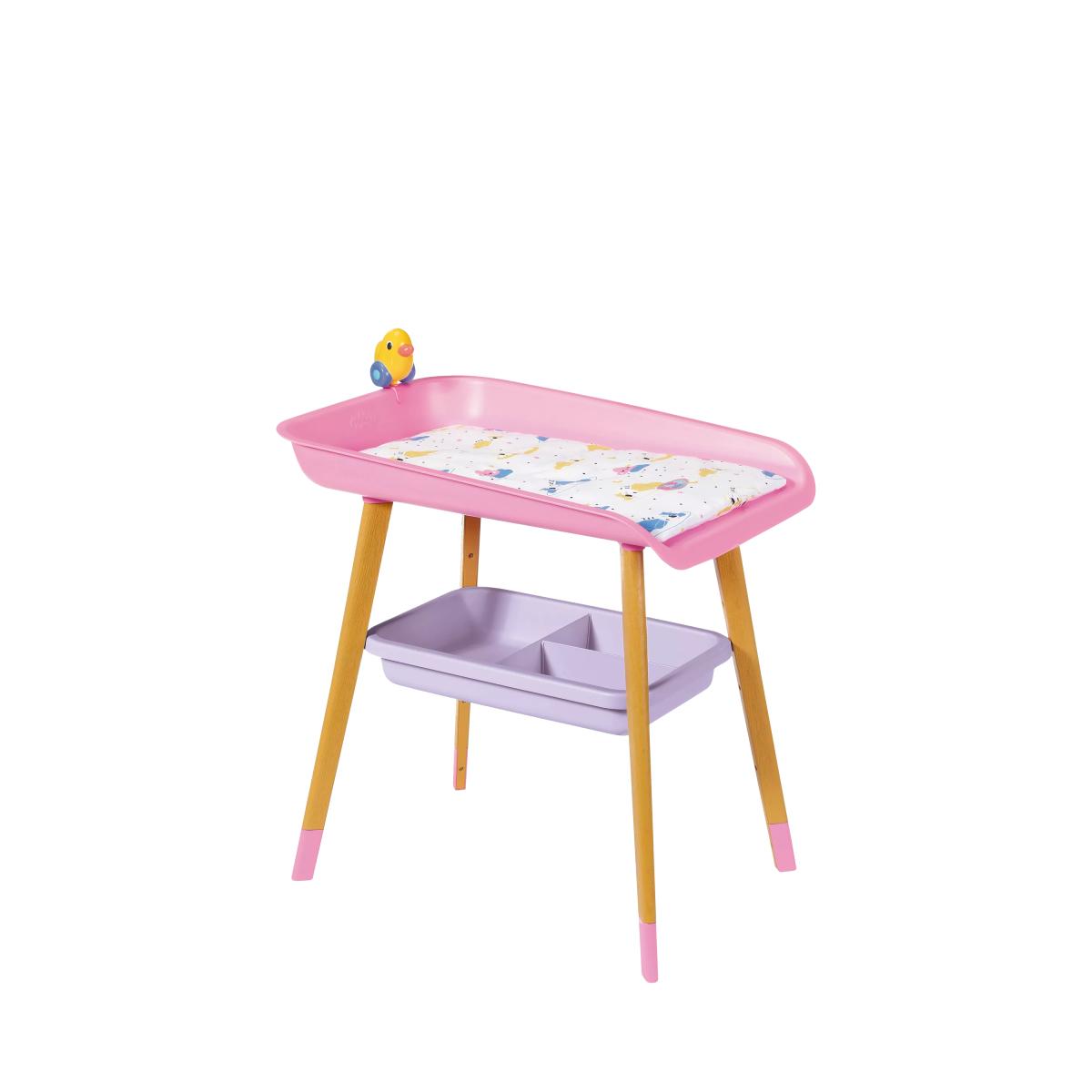 Get Baby Born all kitted out for quick nappy changes that are fun and bursting with colour! This gorgeously designed changing table is the perfect baby care accessory. With a changing mat and tissue dispenser, as well as wooden legs, it’s modern in design. It also has extra storage space underneath to keep all the essentials needed to keep Baby Born clean and content. Plus, her favourite duck sits on the changing table to keep her amused while your little one does the all-important nappy change!