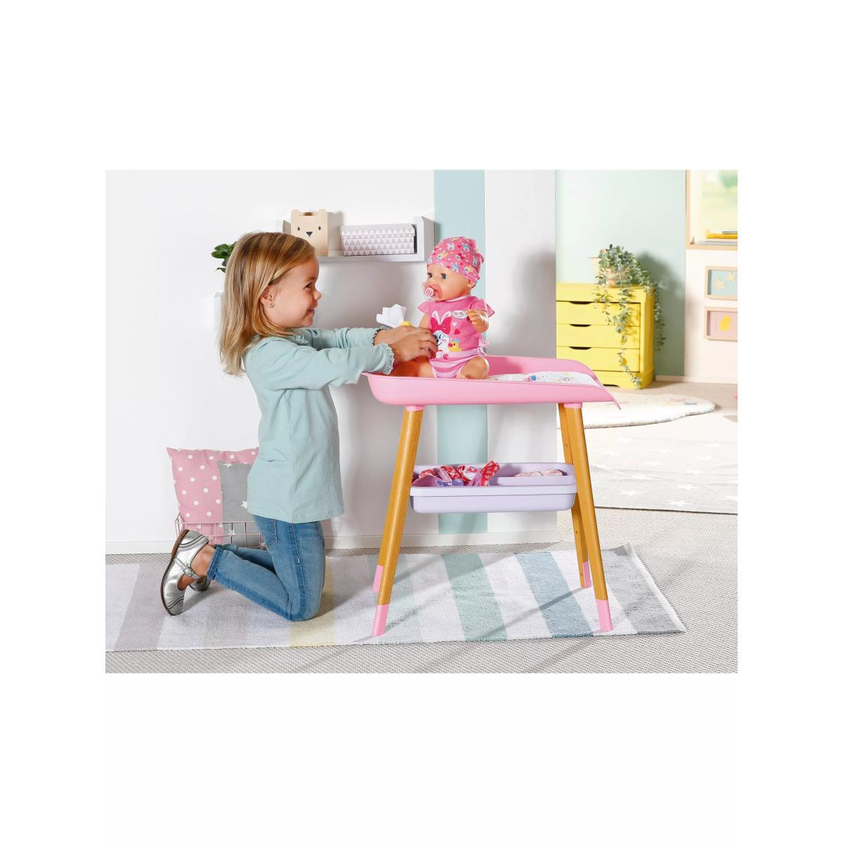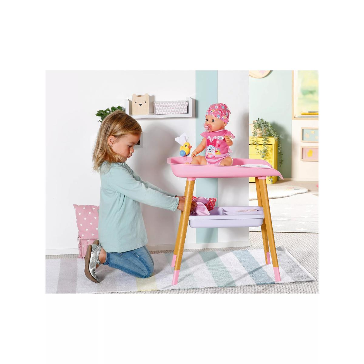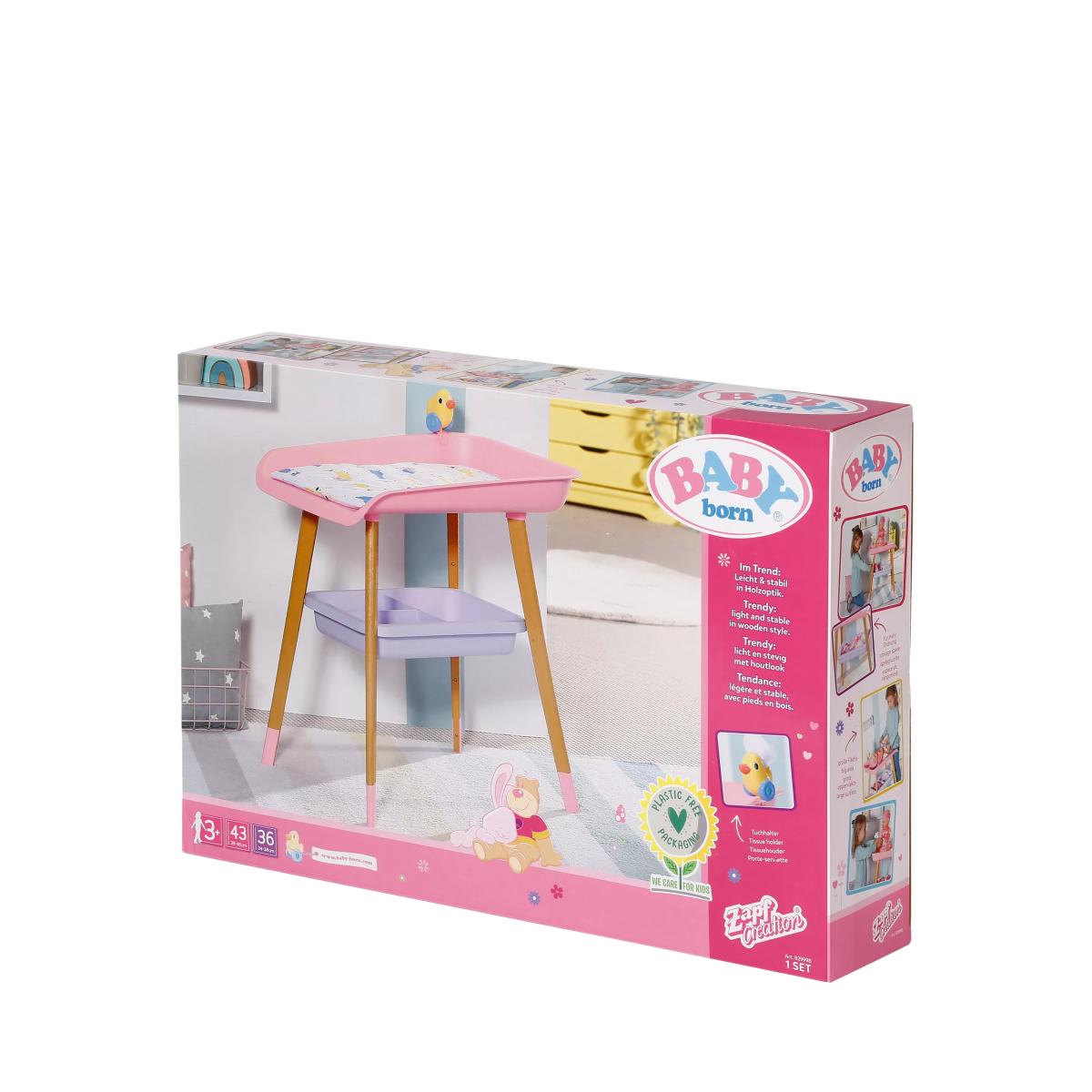 Get Baby Born all kitted out for quick nappy changes that are fun and bursting with colour! This gorgeously designed changing table is the perfect baby care accessory. With a changing mat and tissue dispenser, as well as wooden legs, it’s modern in design. It also has extra storage space underneath to keep all the essentials needed to keep Baby Born clean and content. Plus, her favourite duck sits on the changing table to keep her amused while your little one does the all-important nappy change!