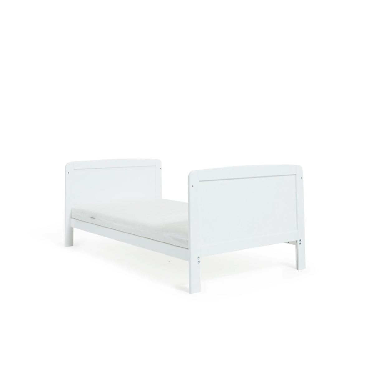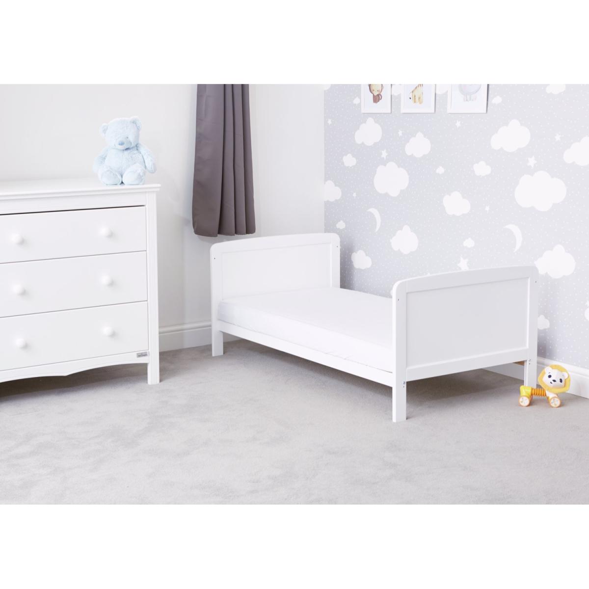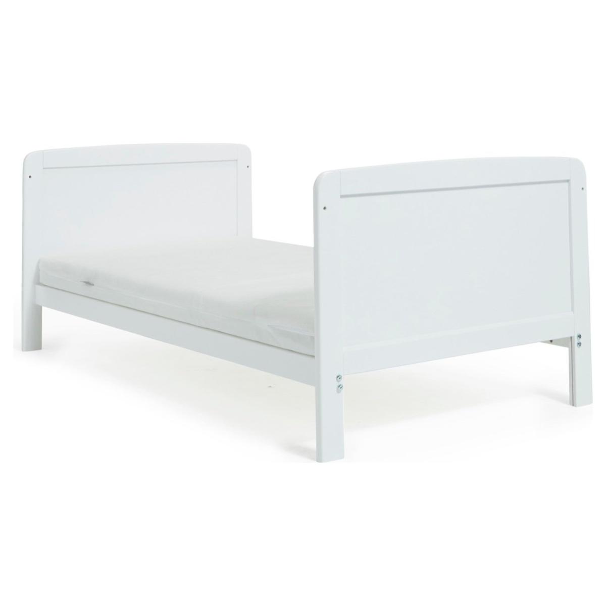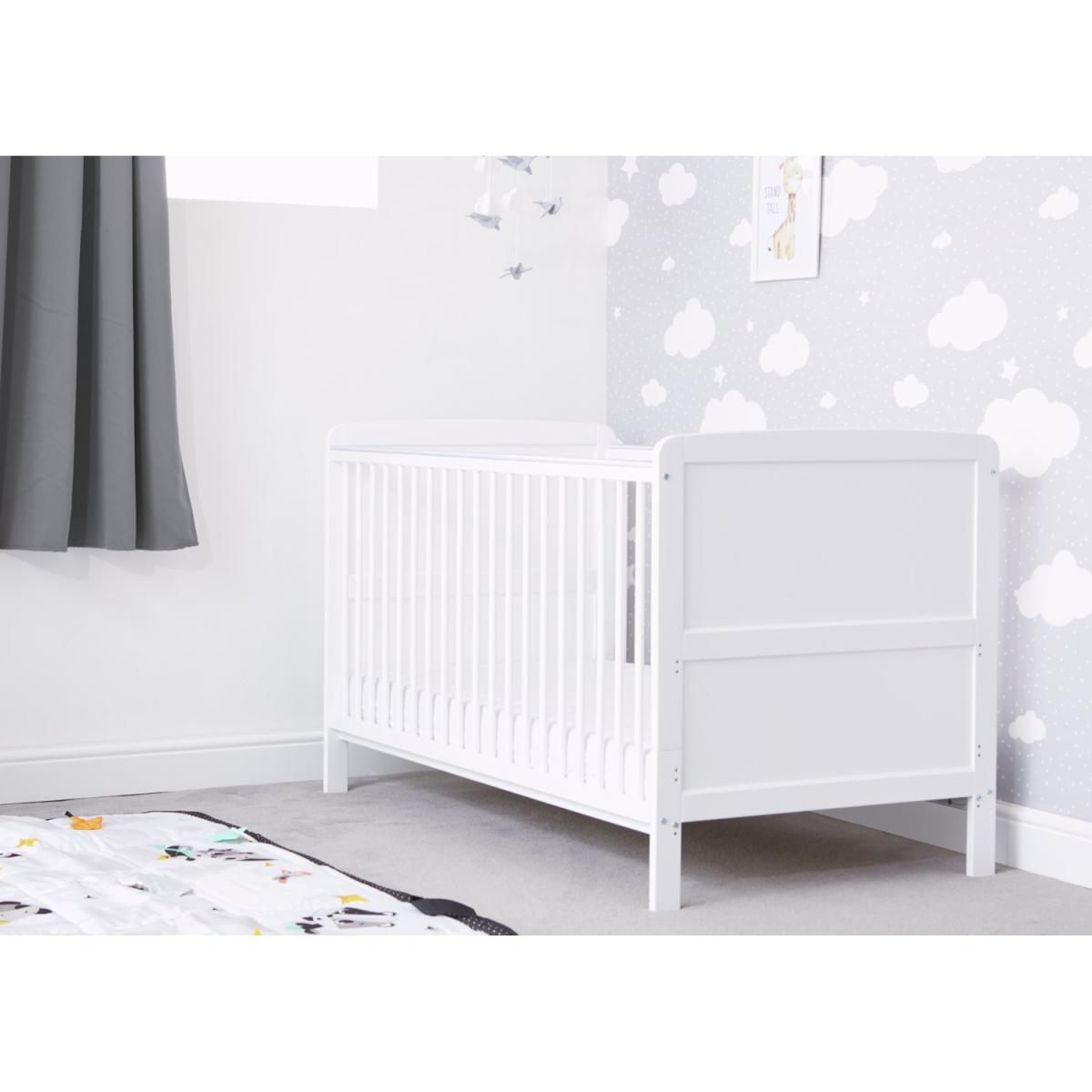 This traditionally styled cot bed has a solid pine finish, creating a warm but fresh look in your little one's nursery. It will last your little one from baby to toddler years, converting easily as your child grows. The Travis Cot Bed has fixed sides and three mattress base heights, when your baby is small, the higher level allows you to easily lift them in and out. The base can then be lowered as your child learns to sit and stand. Part of the Travis collection. Suitable from birth to 4 years and over. Suitable for babies up to 25kg. Made from pine. Packed flat. Cot Features Size L146, W77, H85cm. Weight 12kg. Teething rails - protects your baby's gums once they are teething and have started to chew. 3 position adjustable mattress base - allows you to lower the height of the mattress as your baby learns to sit and stand. Mattress base adjustable height 14cm, 24cm, 43cm. Height under cot 13cm. Cot suitable from birth until baby is able to climb out. Converts to toddler bed. to 4 year. Mattress Features Mattress size L140, W70, D10cm. Mattress included. Healthguard anti-allergy fibre mattress. Hypoallergenic. Removable washable cover.