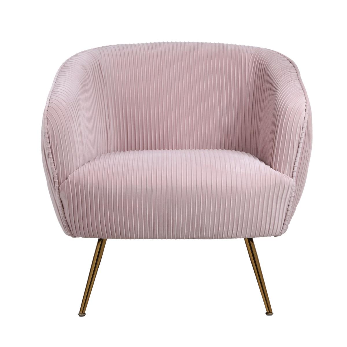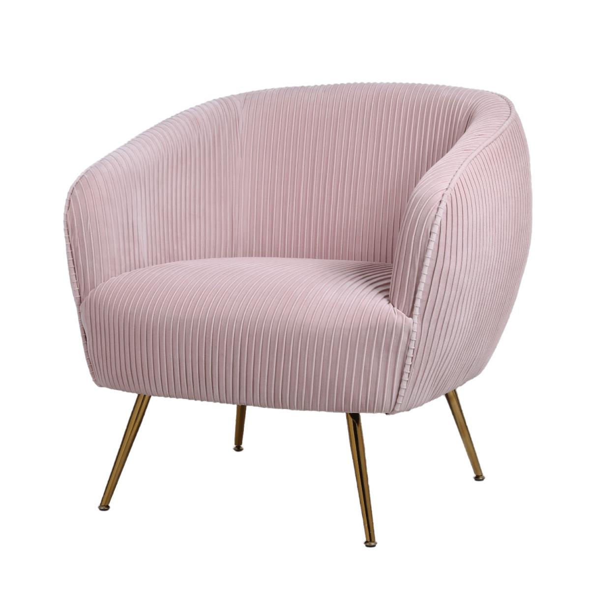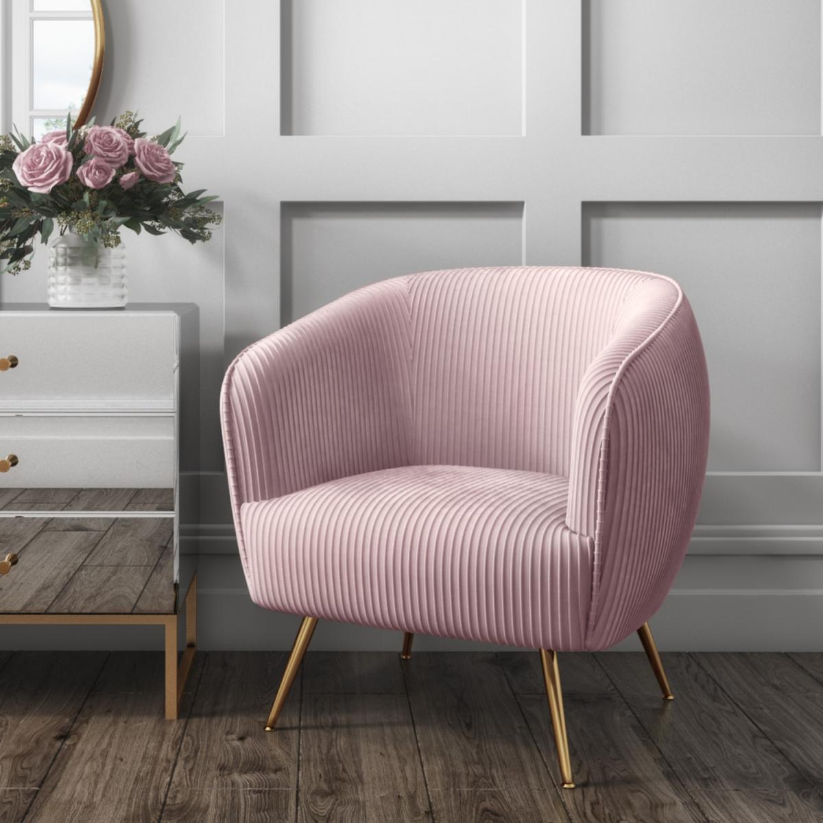Features we love A stunning contemporary armchair that's perfect for any bedroom. Use as an extra seat a dressing table chair or even a glamorous accent chair Gold legs contrast with the baby pink velvet to create a gorgeous piece. Its tub chair design gives you a comfortable place to rest after a long day. Next to no assembly required simply attach the legs and enjoy! Need to know. Dimensions. W79 x H78 x D73 cm Seat height. 44cm Colour. Baby pink Finish. Pleated velvet and gold legs Material. Velvet fabric wooden frame foam and metal chrome legs Weight. 13.2kg Assembly required. Yes - legs need to be attached.
