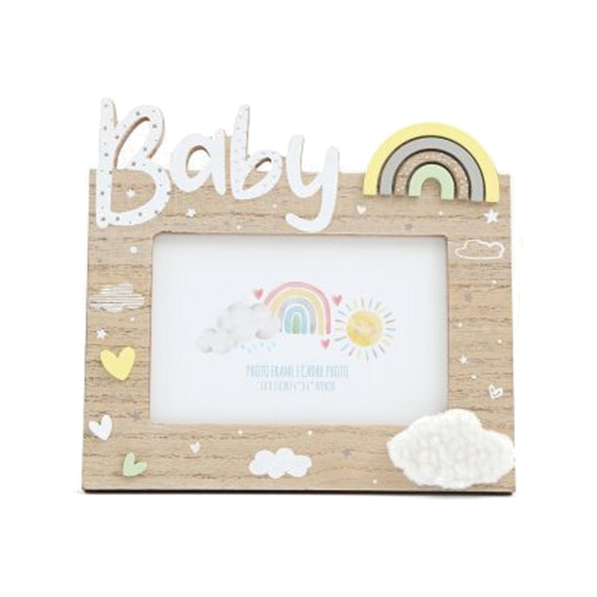 A gorgeous wooden photo frame with a pastel rainbow and clouds design. A lovely gift item and interior accessory. This is a free standing frame so you can place this anywhere in your home. It has lovely decorations and decals around the frame which makes it stand out and colourful.