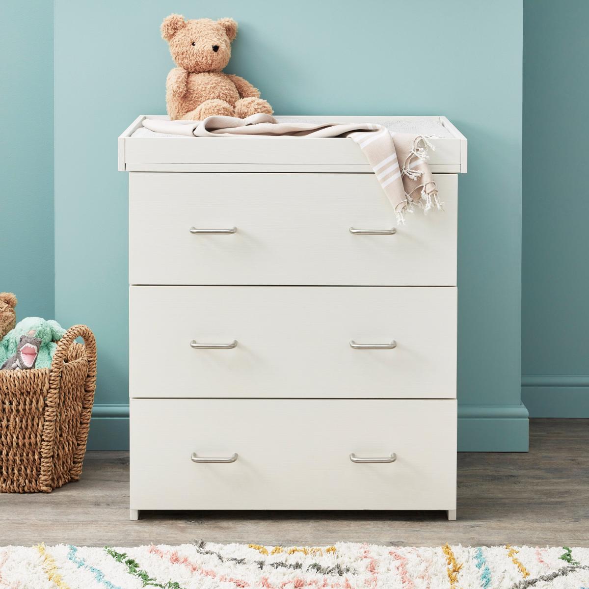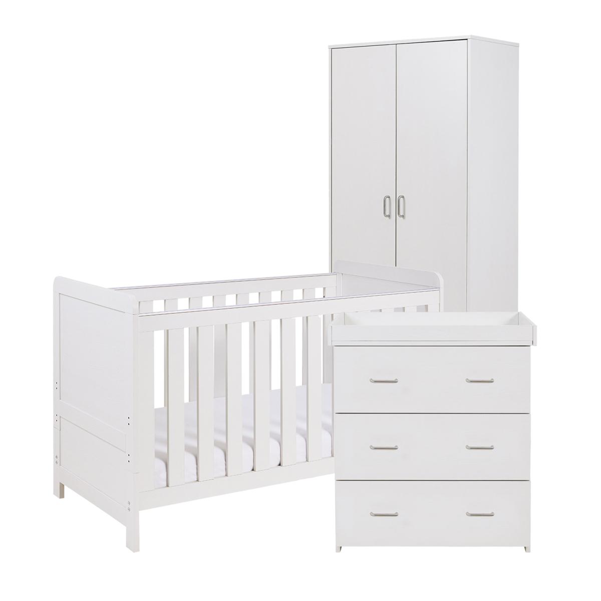 Prepare for your new arrival with the perfect nursery set up with Babymore’s Caro nursery collection. This 3-piece nursery set features a timeless style, woodgrain finish and includes a stylish cot bed, versatile dresser and double wardrobe which are available in a white wash or grey wash colour to coordinate with your nursery décor theme.**Cot Bed*** Cot bed converts to toddler bed* Suitable from birth to (approx) 5 years old* Three adjustable mattress base positions* Protective teething rail on top of both sides* Compatible with Babymore mattress size 140 x 70cm (sold separately)Designed to start its life as a cot, this cot bed transforms as your baby grows, so from birth until around 18 months, your baby can be safe in the cot mode and then easily convert into a stylish toddler bed to last up to 5 years and extend the use of the product. A protective teething rail is fitted along both sides to protect the wood from nibbling and teething marks.**Drawer Chest & Changer Unit*** Combined changer & dresser* Removable changer top* 3 full size drawers* Suitable from birth to 12 months (max weight: 11kg)* Requires a changing mat size 75 x 45cm (not included)The 3 deep and generous sized drawers offer ample space for your baby’s essentials and clothes and the changing section is attached to the top of the chest unit. Accommodating a changing mat up to 75 x 45cm, the changing section can be easily removed to transform into a more traditional chest of drawers when your baby has outgrown the nappy stage or reaches weight of 11kg.**Double Wardrobe*** Full sized wardrobe* Double soft close doors* 2 internal hanging rails* Top shelf Display your baby’s precious outfits in style with this quality wardrobe combining practicality, perfect design and storage in one piece of furniture. Babymore’s Caro Wardrobe will help to organise your nursery and baby’s clothes with it’s spacious interior, a handy shelf at the top and the choice of two hanging rails.