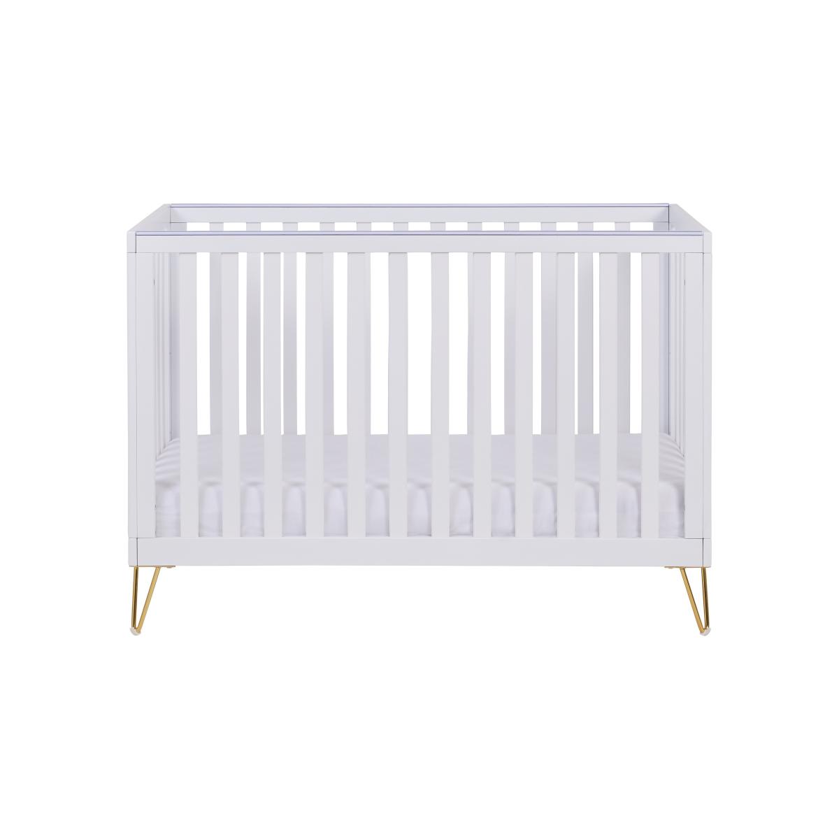 * Cot bed converts to toddler bed* Contemporary & distinctive style* Heavy duty hairpin metal legs* Suitable from newborn to (approx) 4 years old* Three adjustable mattress base positions* Protective teething rail on top of both sides* Complies with safety standards* Compatible with Babymore mattress size 120 x 60cm (sold separately)* Available in a white or midnight blue colour option Bringing on trend contemporary design with a distinctive style to your nursery, Babymore’s Kimi Cot bed is here to make a striking statement. With an exquisite combination of modern wooden design and retro hairpin legs, this cot bed blends seamlessly to provide a stunning statement piece of furniture. The sophisticated retro hairpin legs add an element of luxury while the heavy duty solid metal provides support with rubber floor protectors. It features 3 adjustable mattress heights, teething rails, and can be transformed into a toddler bed, suitable from birth to 4 years old to bring longevity to the product. It comes with a 6 month guarantee from date of purchase, which can be extended to 12 months if the product is registered online with Babymore within 28 days of receiving the item.