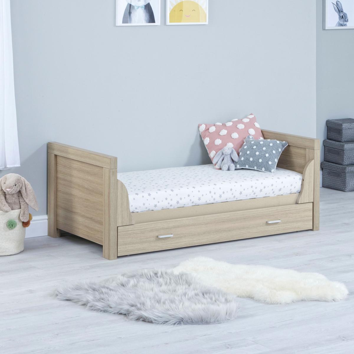 * Cot bed converts to toddler bed* Full width drawer on runner* Suitable from newborn to (approx) 5 years old* Three adjustable mattress height positions* Protective teething rail on top of both sides* Complies with safety standards* Compatible with Babymore mattress size 140 x 70cm (sold separately)* Matching cot top changer available (sold separately) * Available in an oak or white & oak colour option Bringing a clean and modern design to your nursery, Babymore’s Luno Cot Bed offers a stylish and functional fit to welcome in your newborn and grow with your child through the years. Designed to start its life as a cot, it transforms as your baby grows, so you can easily convert it into a stylish toddler bed. The warm wood finish allows it to fit naturally in contemporary and traditional style decorated rooms and features three mattress positions. The highest position allows access to your baby without placing too much pressure on your back and you can easily lower the mattress position as your baby grows. A protective teething rail is fitted along both sides to protect the wood from nibbling and teething marks and comes with a 6 month guarantee from date of purchase, which can be extended to 12 months if the product is registered online with Babymore within 28 days of receiving the item.