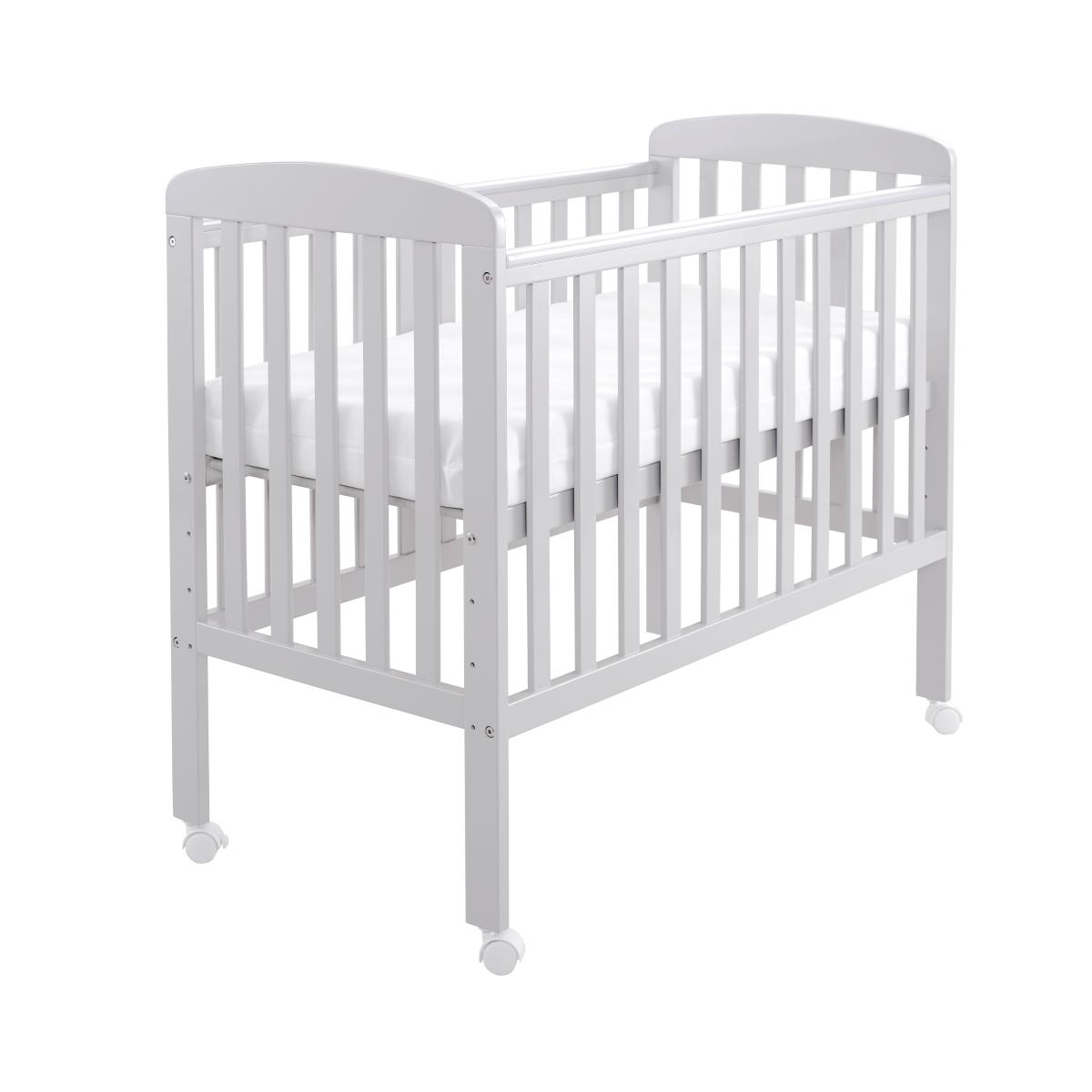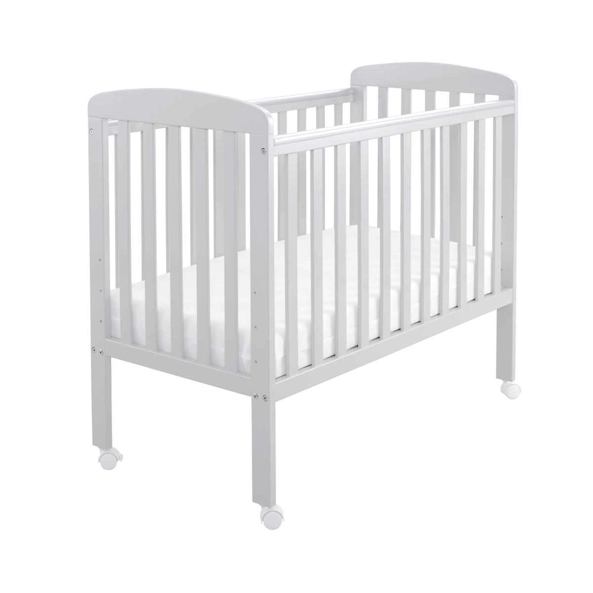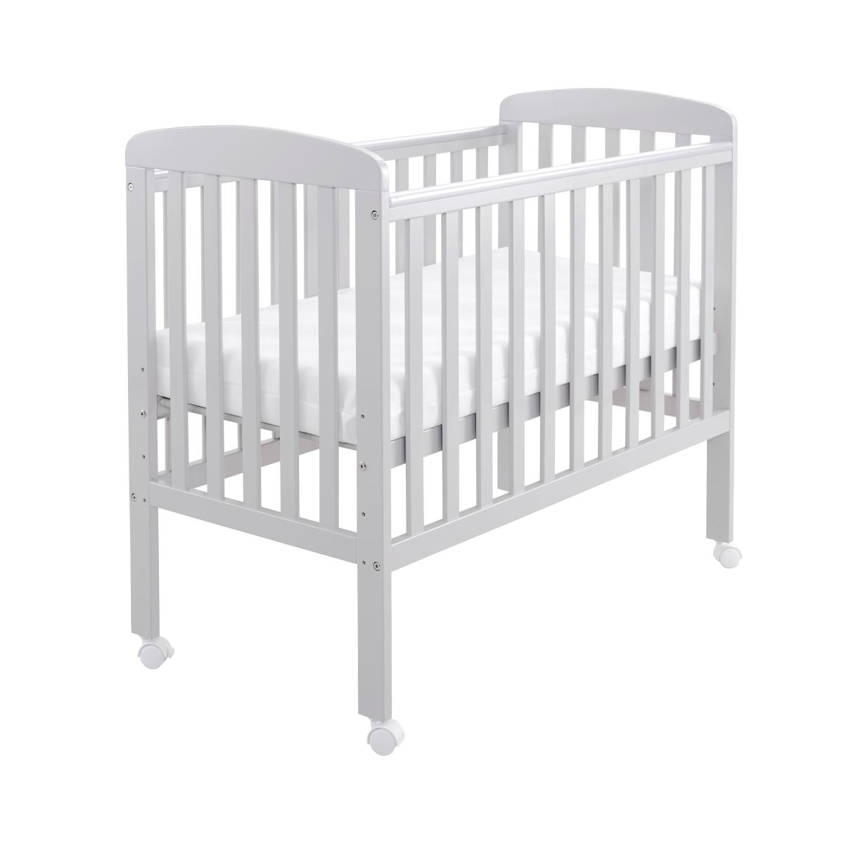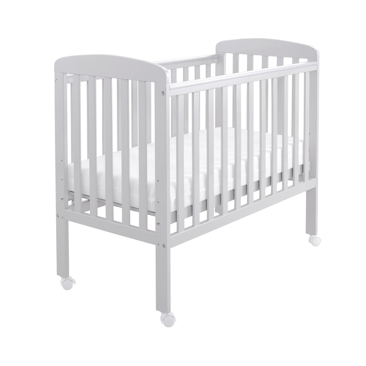 * Space saver cot* Includes: 2 x removable wheels (lockable)* Suitable from newborn to (approx) 12 months old* Four adjustable mattress base positions* Protective teething rail on top of both sides* Complies with safety standards* Compatible with mattress size 100 x 50cm (sold separately)* Available in a white or grey colour option Designed for smaller spaces, Babymore’s Space Saver Cot is made for those who want all the benefits of a solid cot but without the bulk. Perfect for placing in most parent’s bedrooms, this cot has the benefit of lasting around 12 months and the four different mattress positions allow you to adjust the base as your baby grows. The option of adding lockable wheels on the cot allows easy movement around your space. A protective teething rail is fitted along both sides to protect the wood from nibbling and teething marks and comes with a 6 month guarantee from date of purchase, which can be extended to 12 months if the product is registered online with Babymore within 28 days of receiving the item.*Not Compatible with the Babymore Cot Top Changer.