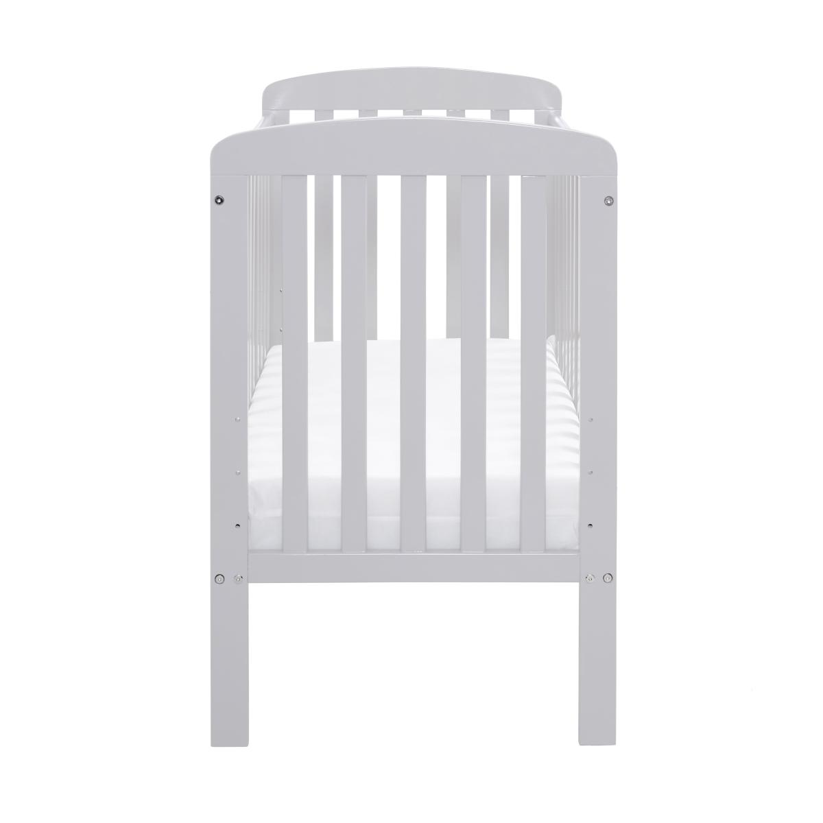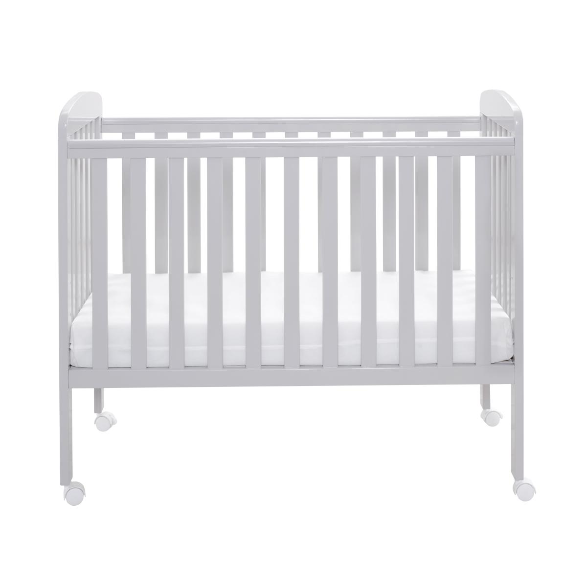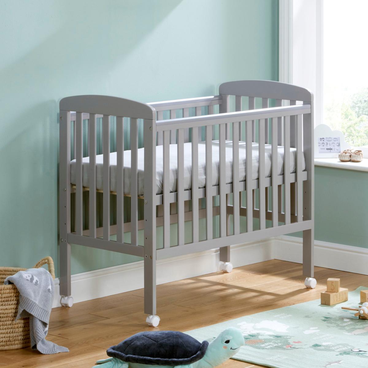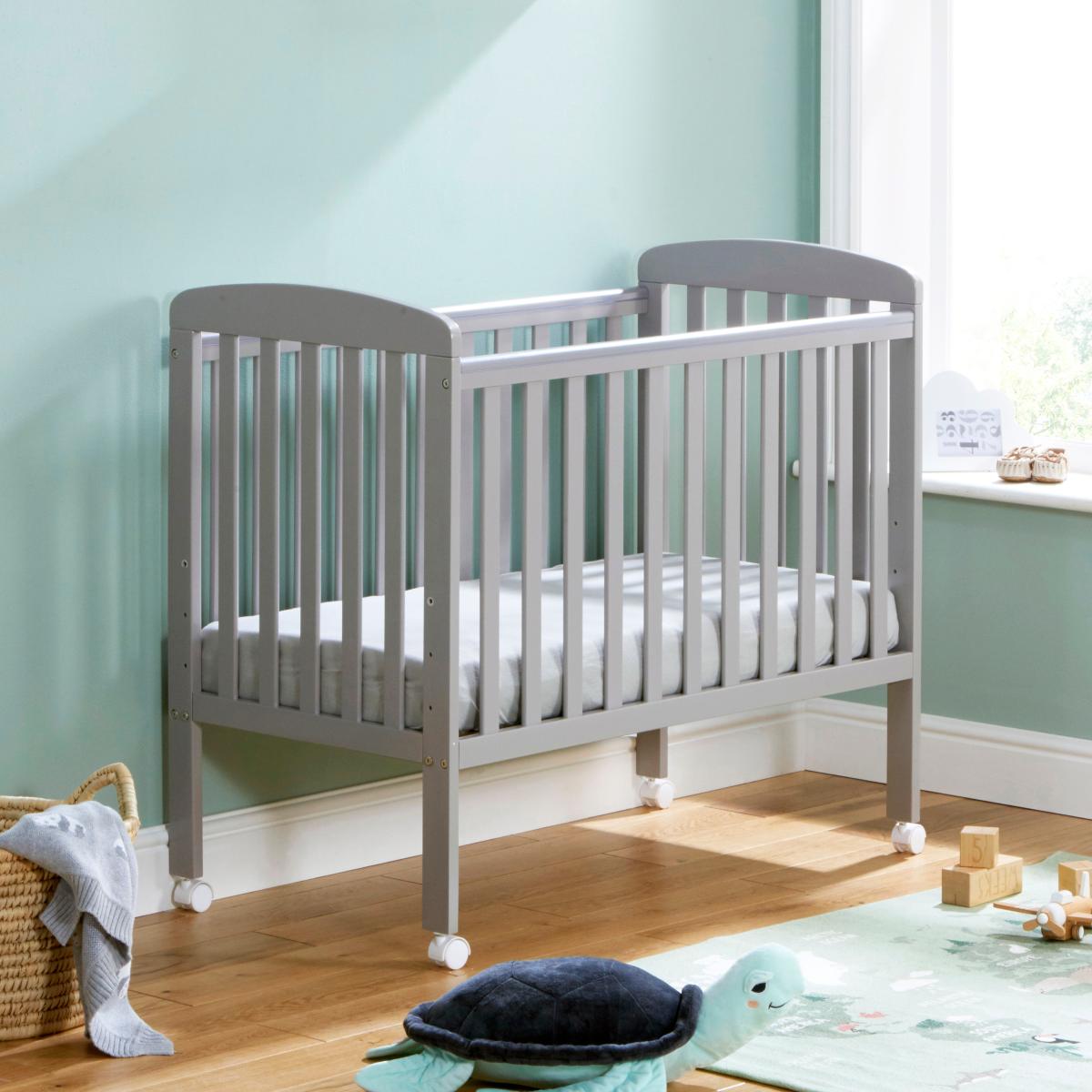 * Space saver cot* Includes: 2 x removable wheels (lockable)* Suitable from newborn to (approx) 12 months old* Four adjustable mattress base positions* Protective teething rail on top of both sides* Complies with safety standards* Compatible with mattress size 100 x 50cm (sold separately)* Available in a white or grey colour option Designed for smaller spaces, Babymore’s Space Saver Cot is made for those who want all the benefits of a solid cot but without the bulk. Perfect for placing in most parent’s bedrooms, this cot has the benefit of lasting around 12 months and the four different mattress positions allow you to adjust the base as your baby grows. The option of adding lockable wheels on the cot allows easy movement around your space. A protective teething rail is fitted along both sides to protect the wood from nibbling and teething marks and comes with a 6 month guarantee from date of purchase, which can be extended to 12 months if the product is registered online with Babymore within 28 days of receiving the item.*Not Compatible with the Babymore Cot Top Changer.