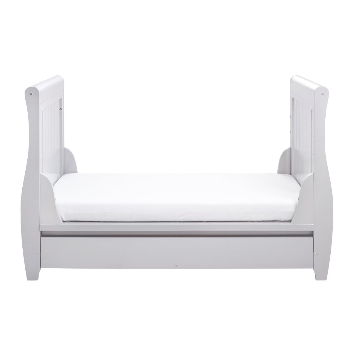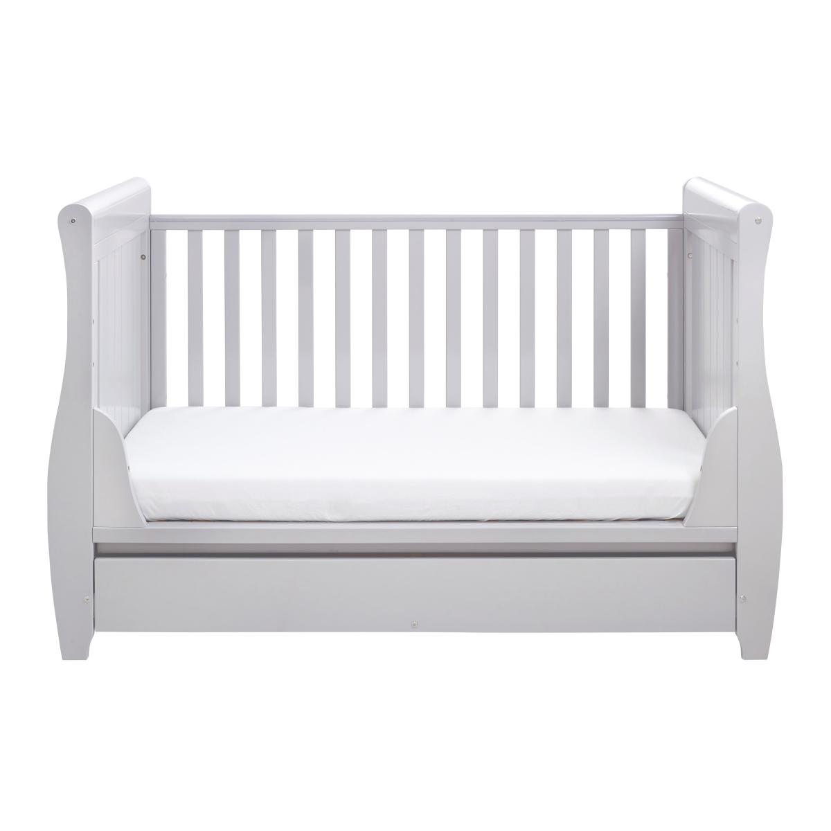 Keep your little one secure and supported while they drift off to sleep from birth, up until the age of around 5 years old with Babymore’s Stella Cot Bed. Stylish and modern, the sleigh design incorporates both smooth curves and unique panel-styled ends which are beautifully crafted in solid pine and finished in a contemporary painted finish. Designed to start its life as a cot, it transforms as your baby grows, so you can easily convert it into a stylish toddler bed and in time, into a practical mini sofa, ideal for special story time moments with your child. The one-handed drop-side mechanism allows easy access to your baby, which is ideal if you have had a c-section or suffer from a bad back and the mattress has three different height positions that get lower as your baby grows and becomes more mobile, extending longevity of the cot bed. A protective teething rail is fitted along both sides to protect the solid wood from nibbling and teething marks and comes with a 6 month guarantee from date of purchase, which can be extended to 12 months if the product is registered online with Babymore within 28 days of receiving the item.