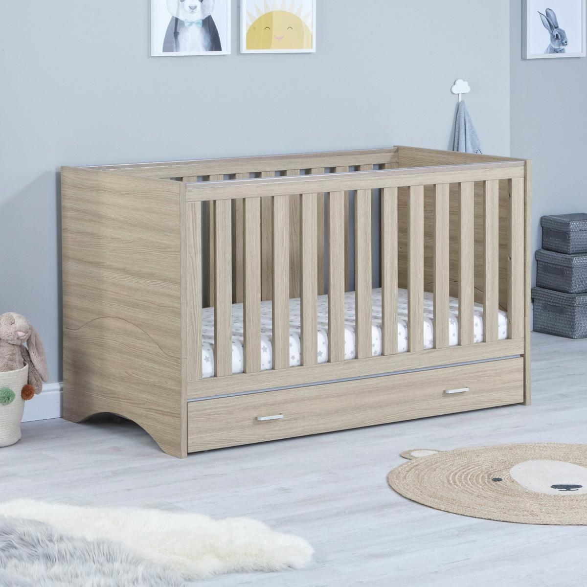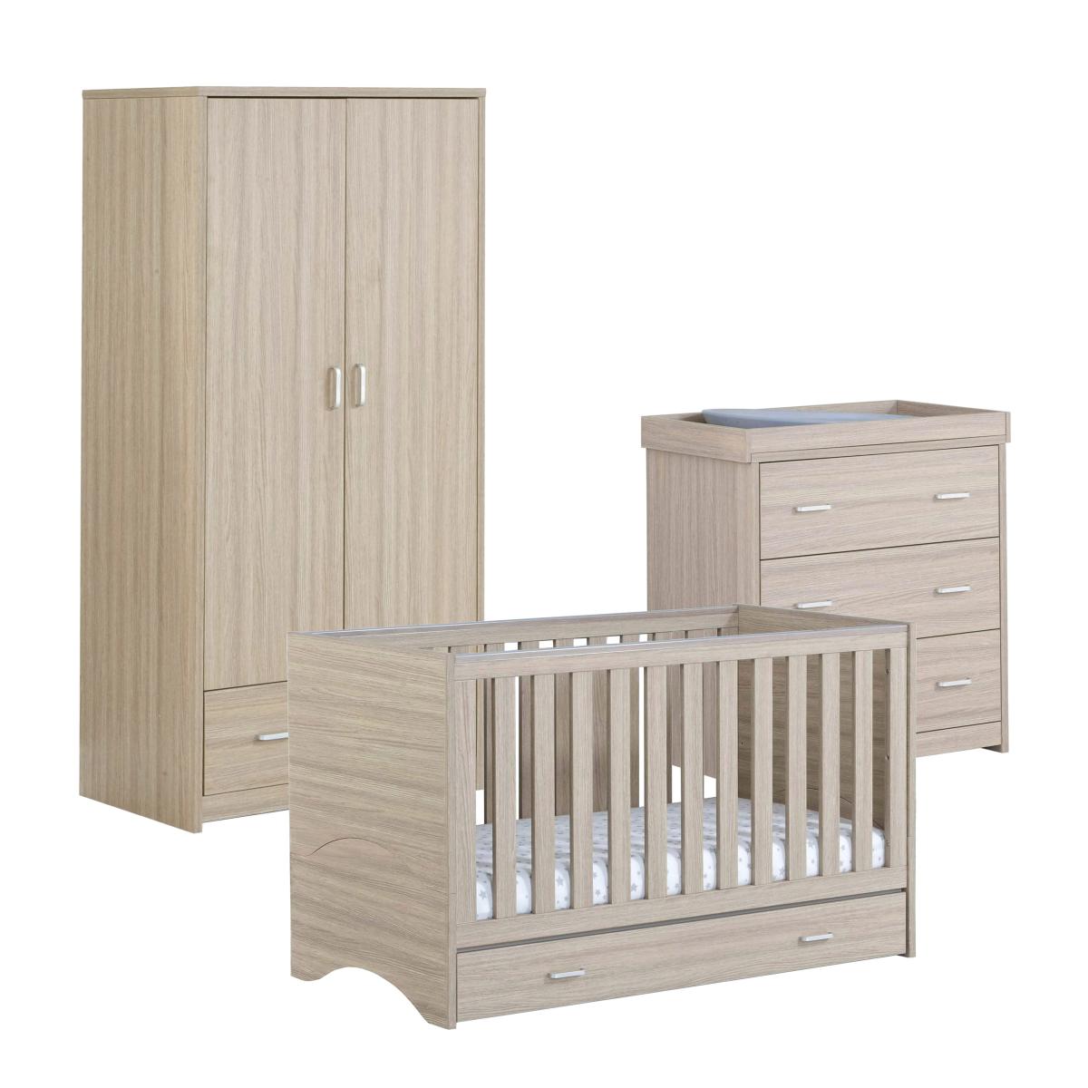 Babymore’s Veni nursery collection brings neat lines and a beautifully textured wood effect finish for a modern, warm, and clean design which will sit stylishly in your baby’s nursery. This 3-piece room set consists of the Veni cot bed, versatile changing unit and double wardrobe which are available in a natural or white and natural colour to coordinate with your nursery décor theme.**Cot Bed*** Cot bed converts to toddler bed* Full width drawer on runner* Suitable from newborn to (approx) 5 years old* Three adjustable mattress height positions* Protective teething rail on top of both sides Compatible with Babymore mattress size 140 x 70cm (sold separately)Designed to start its life as a cot, this cot bed transforms as your baby grows with the three mattress positions, which you can eventually convert it into a stylish toddler bed. The highest position allows access to your baby without placing too much pressure on your back and you can easily lower the mattress position as your baby grows. A protective teething rail is fitted along both sides to protect the wood from nibbling and teething marks.**Drawer Chest & Changing Unit*** Combined changer & dresser* Removable changer top* 3 full size drawers* Suitable from birth to 12 months* Requires a changing mat size 75 x 45cm (not included)The 3 deep and generous sized drawers offer ample space for your baby’s essentials and clothes and the changing section is attached to the top of the chest unit. Accommodating a changing mat up to 75 x 45cm and set at the perfect height for parents, the changing section can be easily removed to create a more traditional chest of drawers when your baby has outgrown the changing stage.**Double wardrobe*** Double soft close doors * Full width large drawer* Internal hanging rail* Adjustable shelf Complete with a hanging rail, a pair of soft close doors and an adjustable shelf, this stylish and practical wardrobe will prove essential with your nursery furniture and organising you baby’s precious outfits