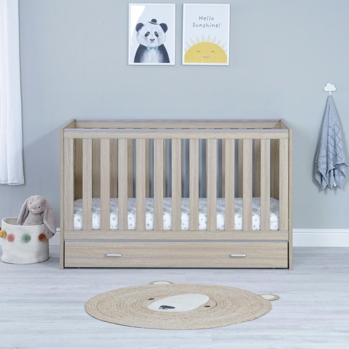 * Cot bed converts to toddler bed* Full width drawer on runner* Suitable from newborn to (approx) 5 years old* Three adjustable mattress height positions* Protective teething rail on top of both sides* Complies with safety standards* Compatible with Babymore mattress size 140 x 70cm (sold separately)* Matching cot top changer available (sold separately) * Available in an oak or white & oak colour option Ensure your little one is secure and supported while they enjoy a blissful sleep from birth, up until the age of around 5 years old with Babymore’s Veni Cot Bed. Designed to start its life as a cot, it transforms as your baby grows, so you can easily convert it into a stylish toddler bed and extend the use of the product. The warm wood finish allows it to fit naturally in contemporary and traditional style decorated rooms and features three mattress positions. The highest position allows access to your baby without placing too much pressure on your back and you can easily lower the mattress position as your baby grows. With a full width drawer under the bed, you can utilise this storage space for quick grab items or store spare bedding, nappies and other essentials. A protective teething rail is fitted along both sides to protect the wood from nibbling and teething marks and comes with a 6 month guarantee from date of purchase, which can be extended to 12 months if the product is registered online with Babymore within 28 days of receiving the item.