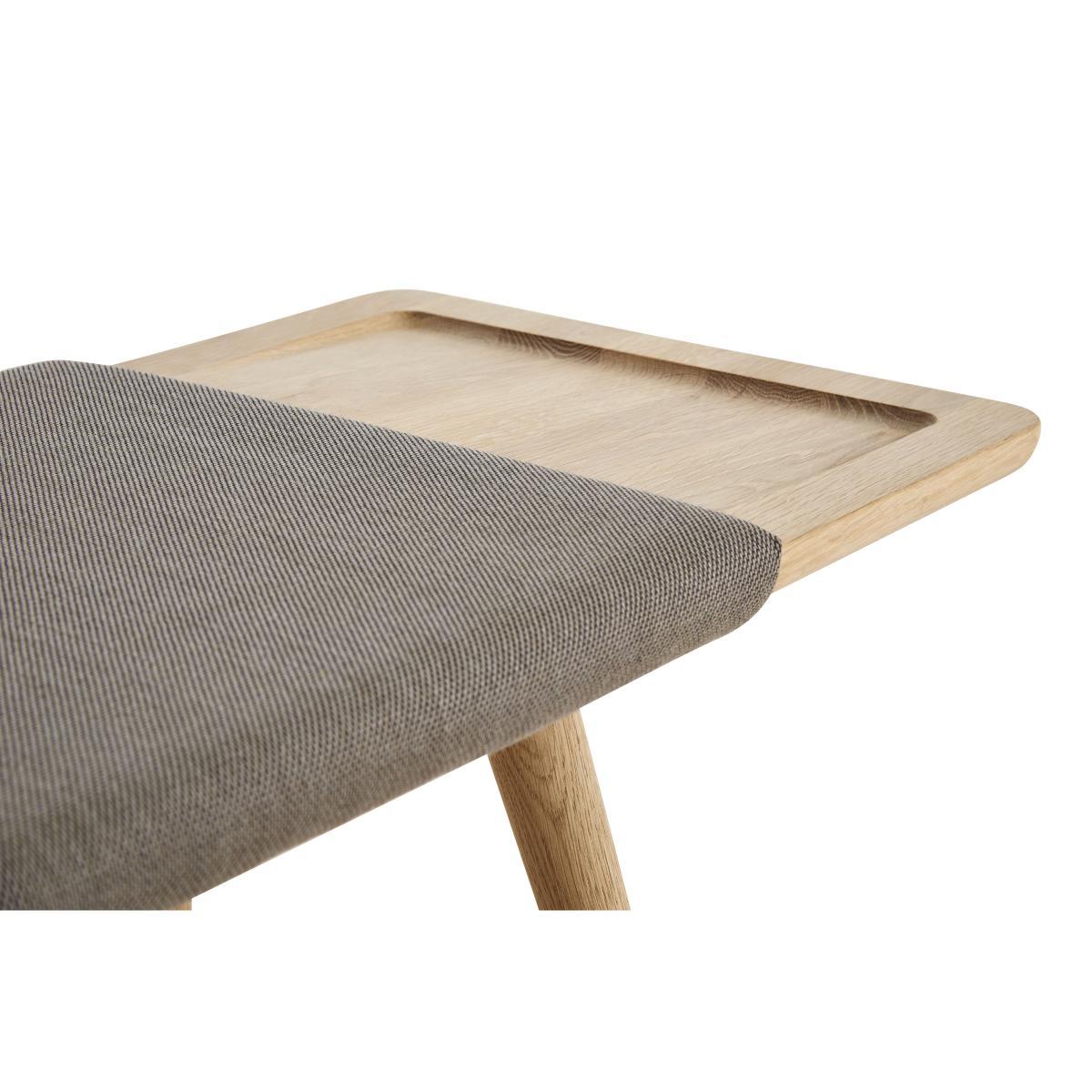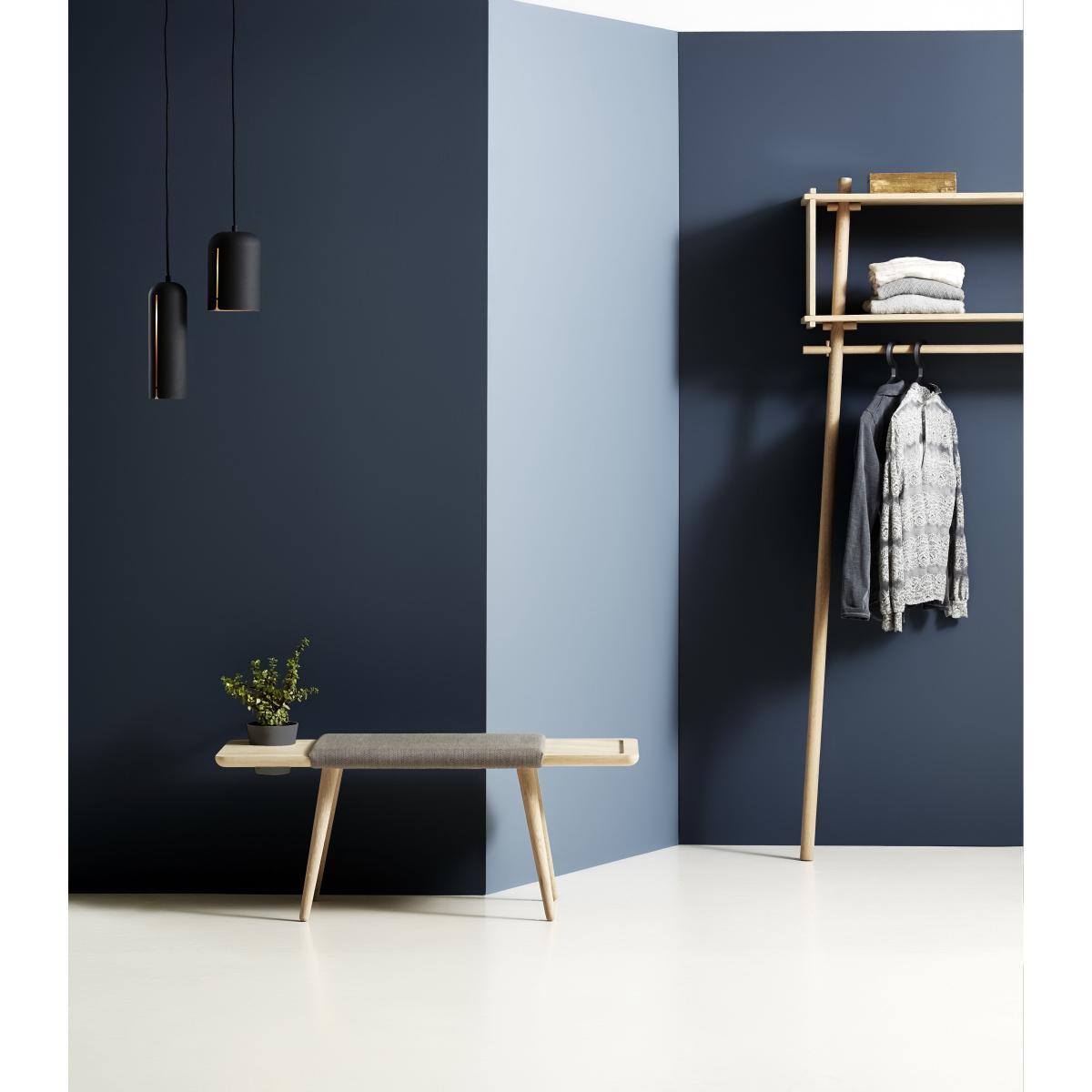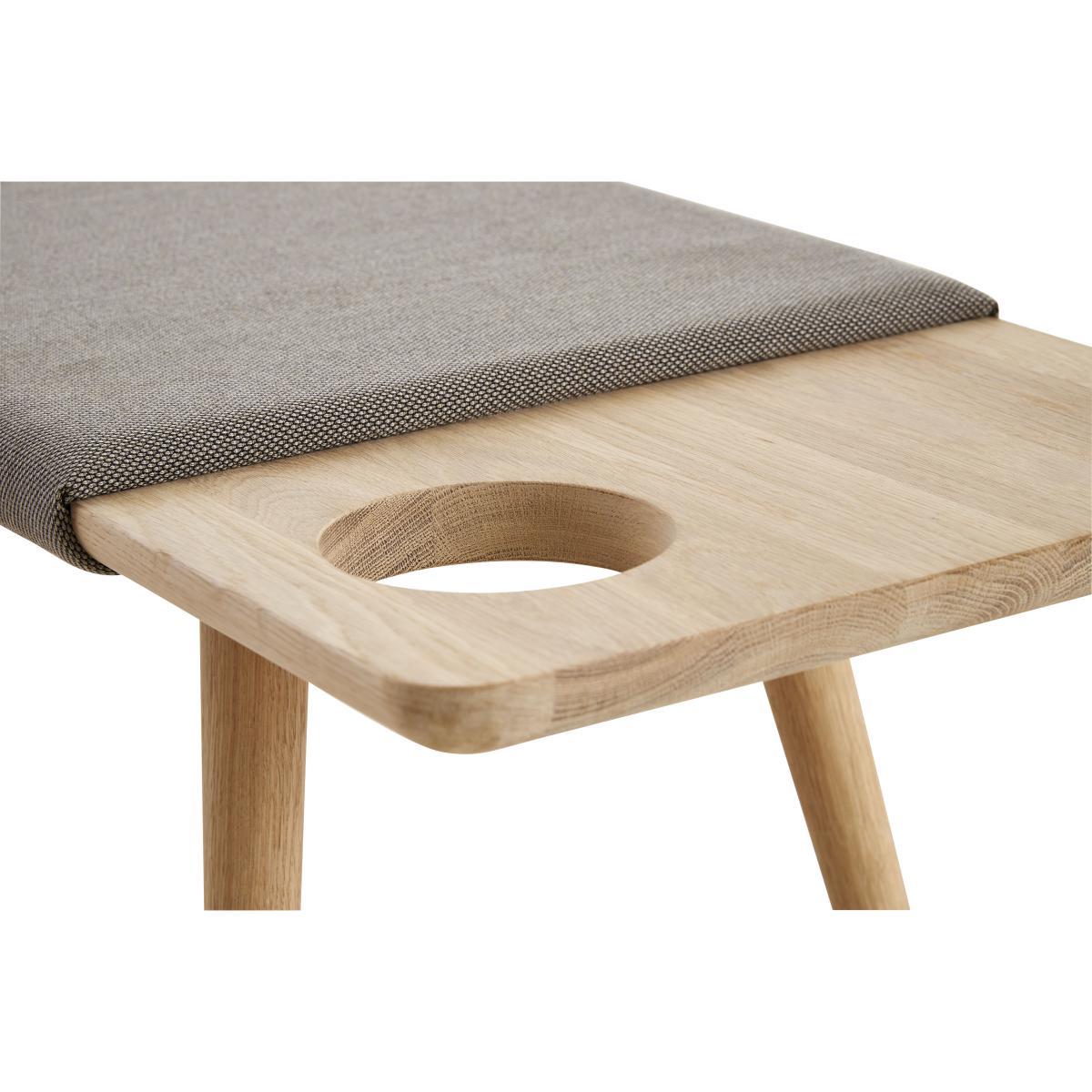This multifunctional bench is made of clean minimalistic lines inspired by the Nordic traditions. The bench is made of solid oak, with a focus on the unique veins that bring nature inside and give each unit a very special and distinctive look. By adding the bench a shelf and a seat, it can be used in multiple contexts. Inspired by an old spool of cardboard the overall shape of the bench is defined. Based on this inspiration the middle piece has been upholstered to also provide increased comfort. The fabric is carefully selected to complement the structure and shades of the wood. Made in solid oak with Gabriel fabric.