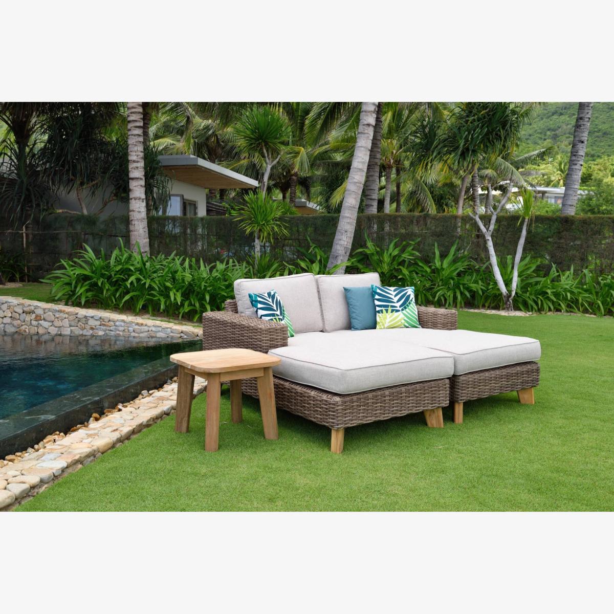 Elegance often lies in simplicity. The warm, earthy tones of the Bahamas range and the smooth lines of its finish ensure that it can blend beautifully with practically any surroundings while delivering premium comfort levels to guests and family alike. The defining feature of the range is our specially formulated Petan wicker, which is durable and highly malleable, forming the perfect support for the forgiving comfort of the cushions. The FSC teak base and Olefin premium fabric ensure that this a collection that is high-end in comfort, design and durability. The Bahamas Day Bed & Side Table consists of the following:1 x Bahamas Chaise Left Unit - W 84cm x D 158cm x H 68cm 1 x Bahamas Chaise Right Unit - W 84cm x D 158cm x H 68cmOverall footprint of chaises together - W 168cm x D 158cm x H 68cm1 x Bahamas Side Table - W 50cm x D 50cm x H 45cm Additional Information: Cushion's should be stored indoors This product is very low maintenance 5 Year Manufacturers Warranty on the frame & wicker 2 Year Manufacturers Warranty on the cushions 2 Year Manufacturers Warranty on the teak table Without regular oiling, Teak will fade in time from a natural honey colour to a silver-grey colour. Surface cracks and imperfections and colour variations are not covered under this limited warranty as this is a natural characteristic of Teak. Damage to the product caused by improper use, neglect, irregular maintenance, or excessive exposure to extreme weather is not covered under this limited warranty. Please note, all screens vary in colour reproduction and whilst every effort has been made to display the colour as accurately as possible it is for guidance only.