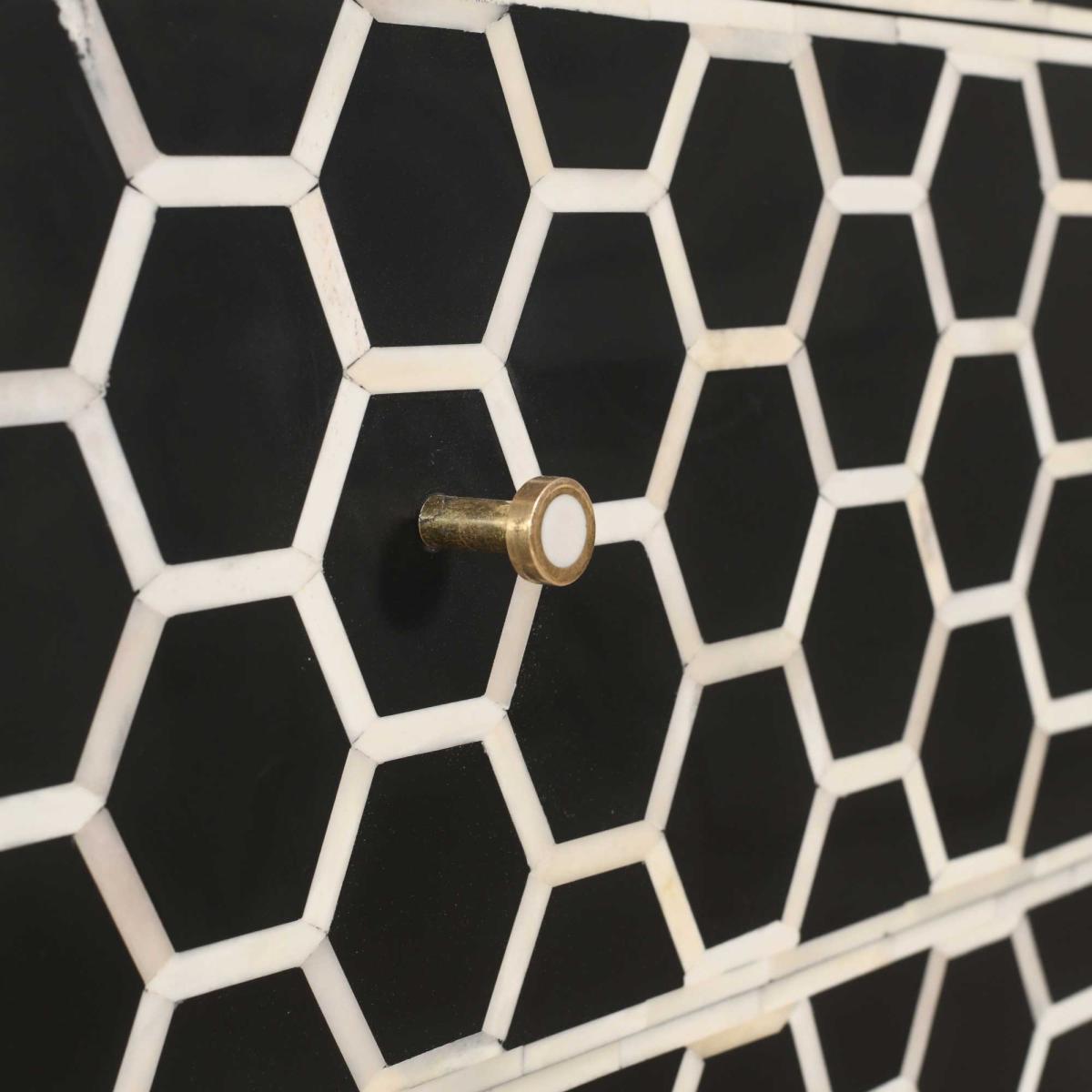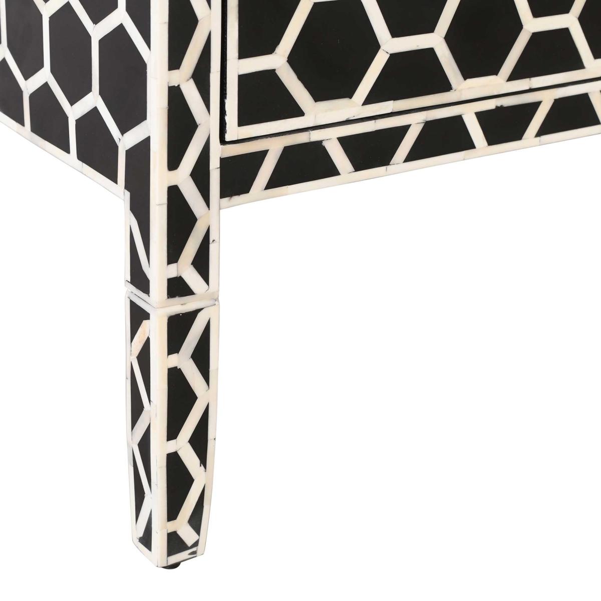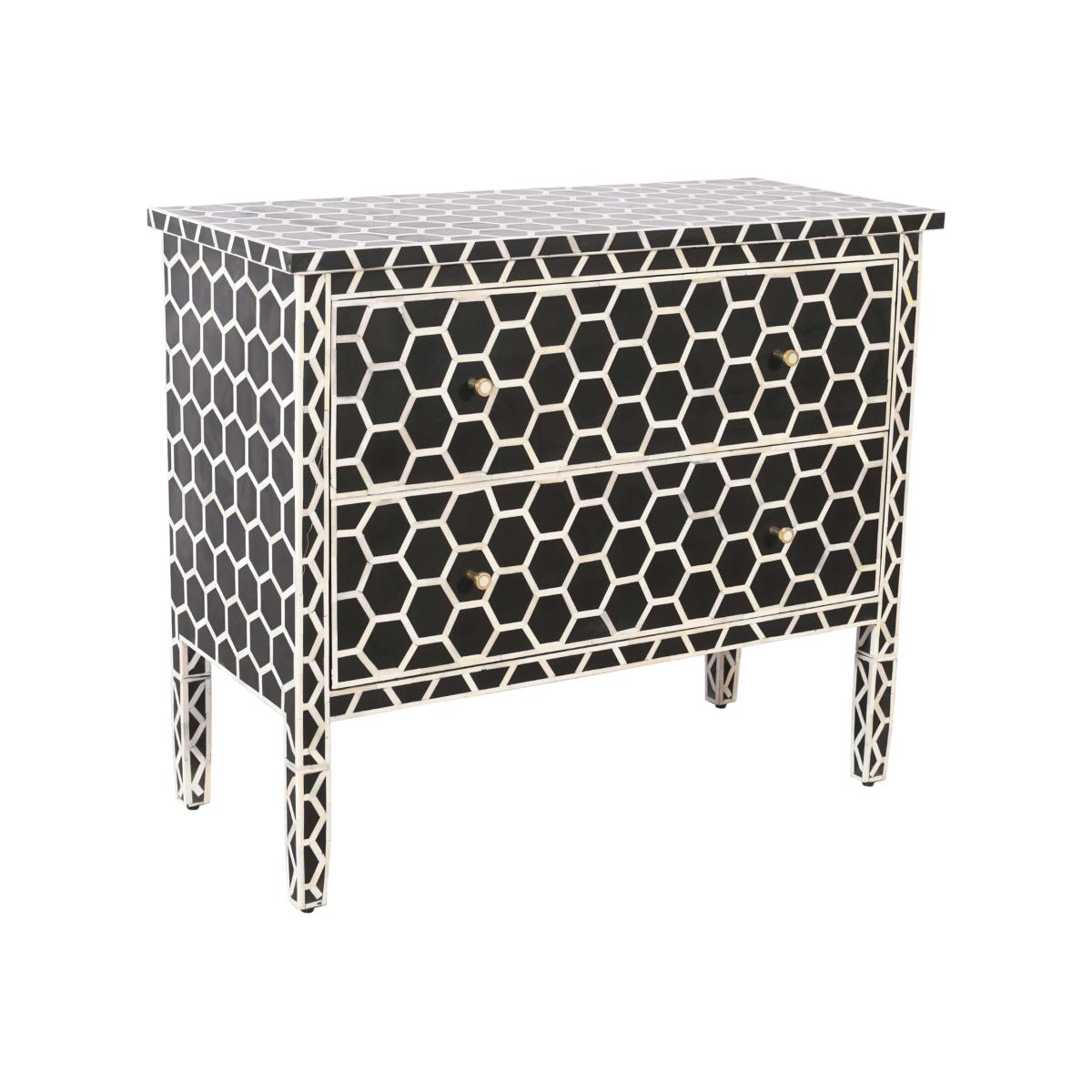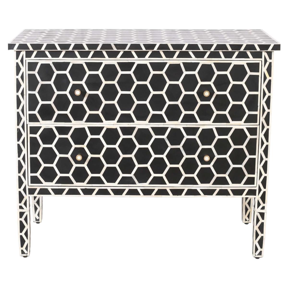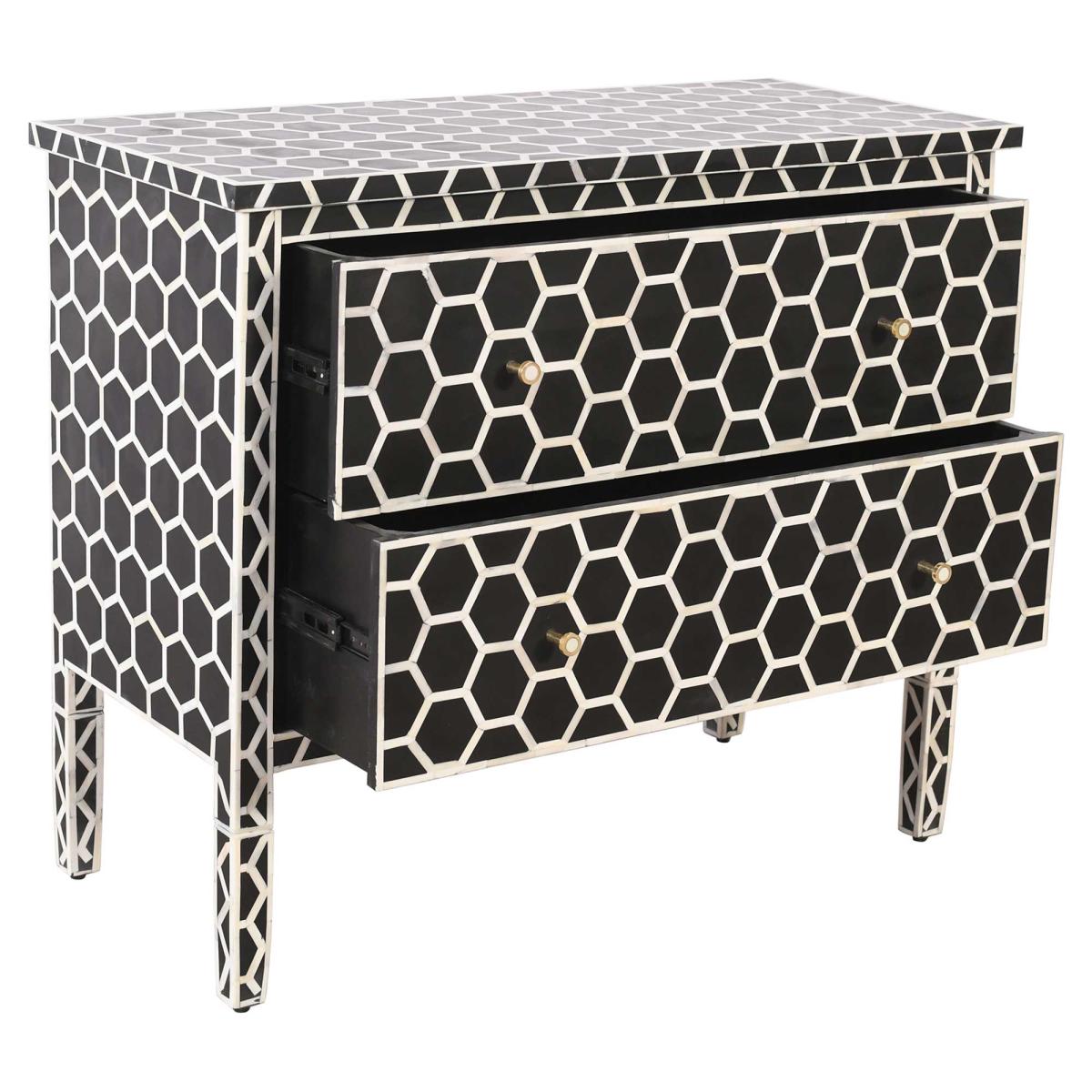 This black and white chest makes a statement with its striking geometric pattern, making it a versatile piece that works well in both modern and eclectic interiors. I love how its bold design can serve as a focal point in a minimalist bedroom or a chic living space. Practical styling tips include pairing it with neutral textiles to really let the pattern stand out, or adding metallic accents for a touch of glamour. It’s also a great storage solution that doesn’t compromise on style, whether placed next to a bed or used as a sideboard in a hallway. Keep the top clear with decorative lamps or plants to maintain a clean, curated look.
