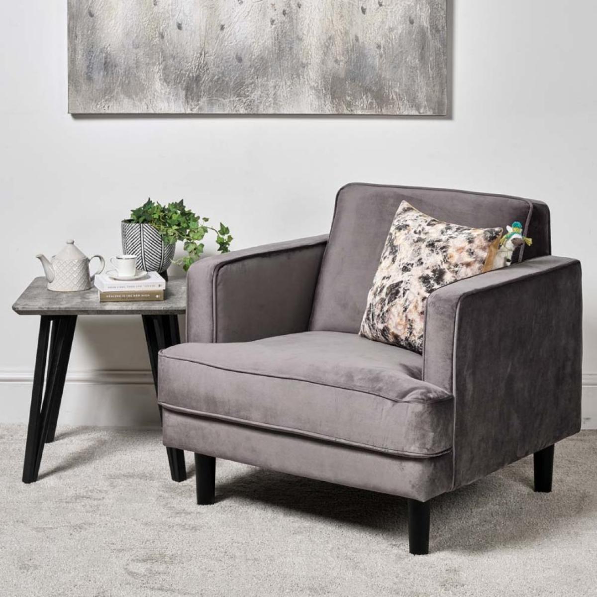 The Bailey armchair is the spot you will look forward to coming home too. The wide seat and comfortable arm rests give you the perfect spot to curl up in.. Choose from four velvet colours to go in your living room... Grey, Mustard, Blue and Green.. *Dimensions:W:86cm D:83cm H:80cm *Simple self assembly *Velvet upholstery