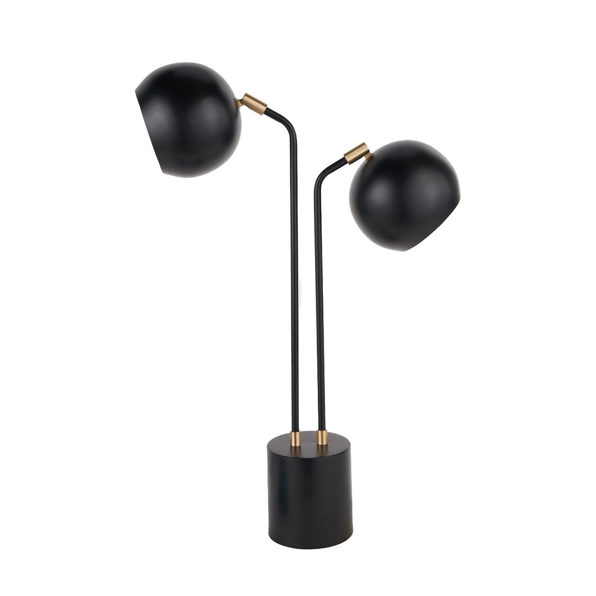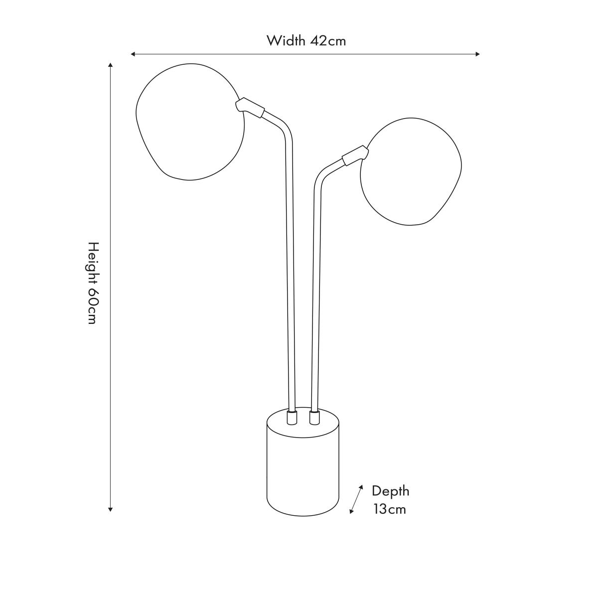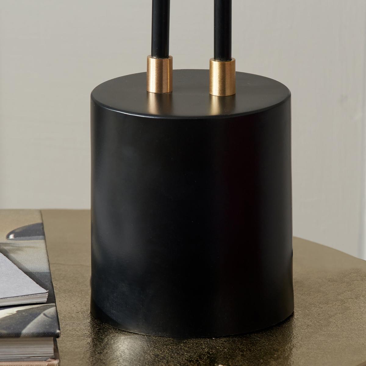 * Bulb required: 2 x SES (Small Edison Screw) - E14* Bulb(s) not included* Matt black finish with brass detailing* Adjustable Head* 2.5m cable with an In Line switch The Bailey Black 2 Head Table Lamp offers both style and functionality with adjustable heads for customisable lighting. Finished in matt black with brass detailing, this lamp creates a striking silhouette in any room.