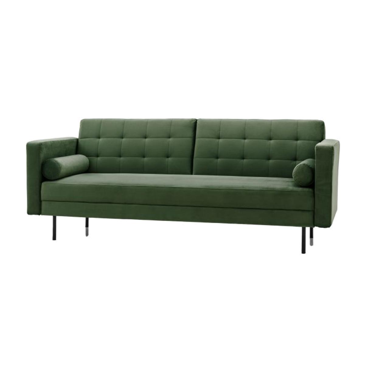 This lovely sofa bed offers stylish contemporary design paired with the practicality of a sofa bed for when guests stay overnight, with the back quickly and simply folding down to create a bed. Slim straight arms are softened by the round bolster cushions for added comfort. Material:Pine 45% / Foam 23% / Fabric 13% / Plywood 10% / Iron 9%. Colour/Finish: Bottle Green.