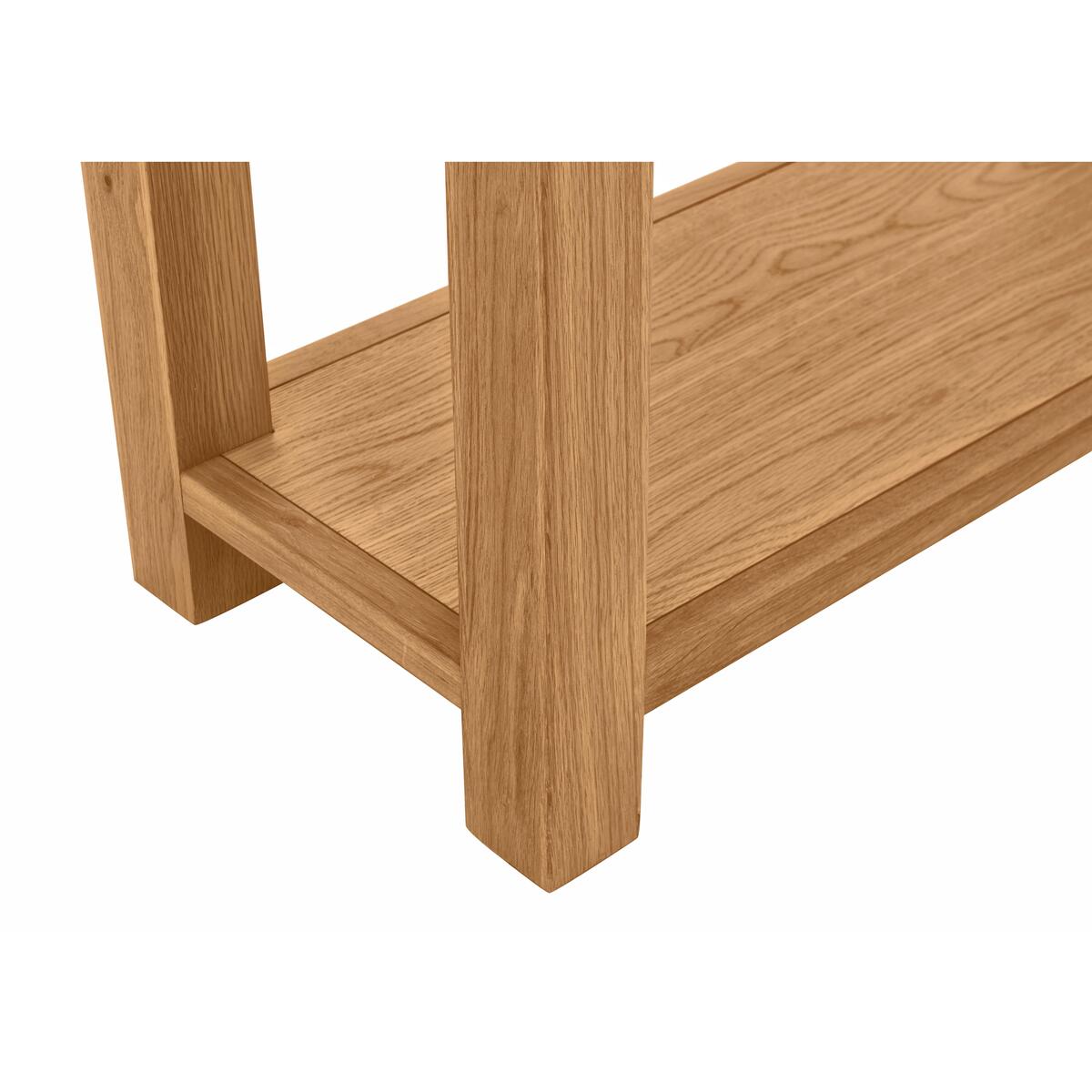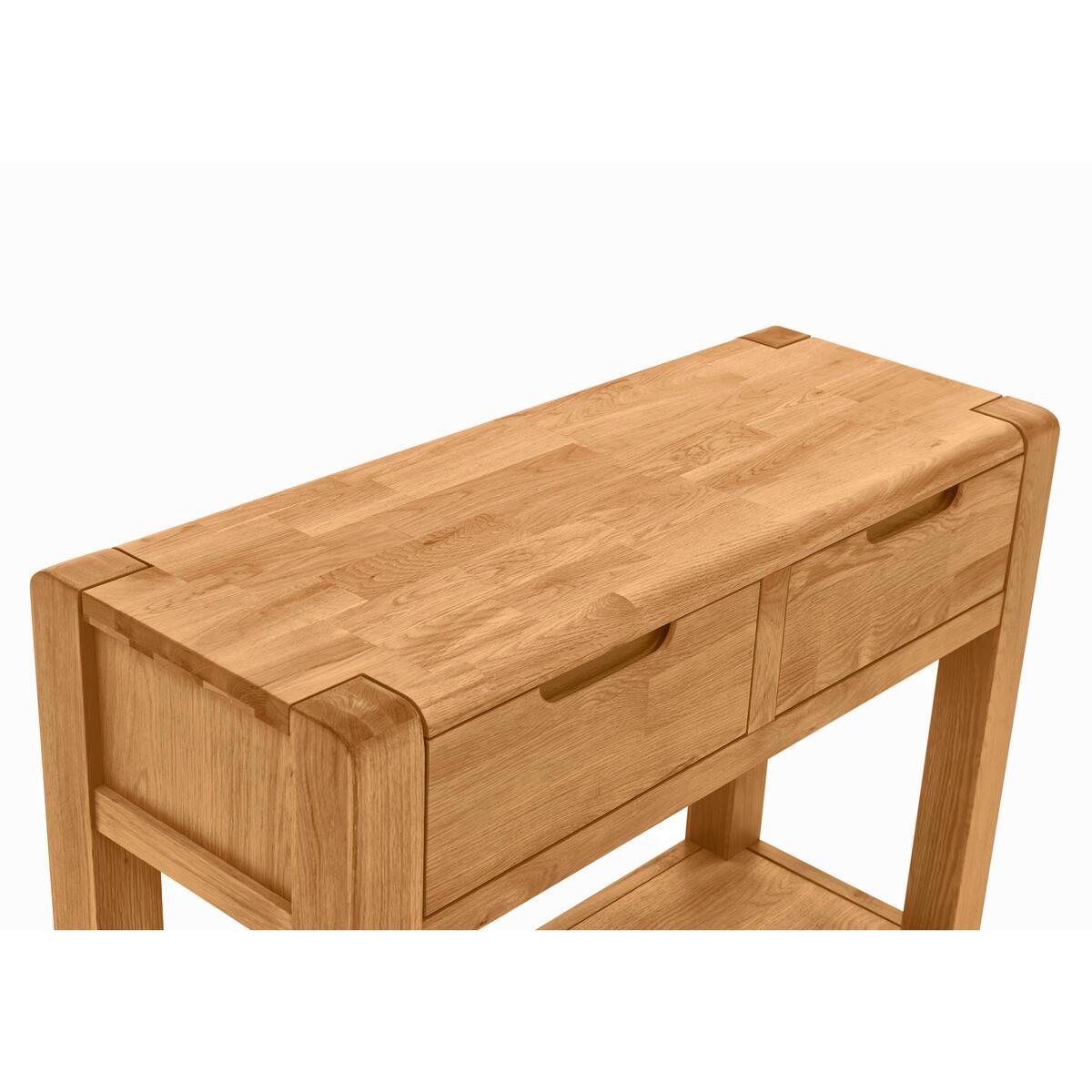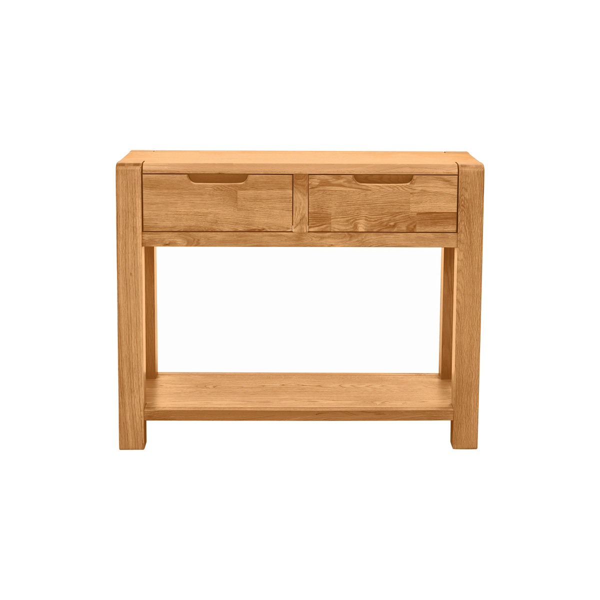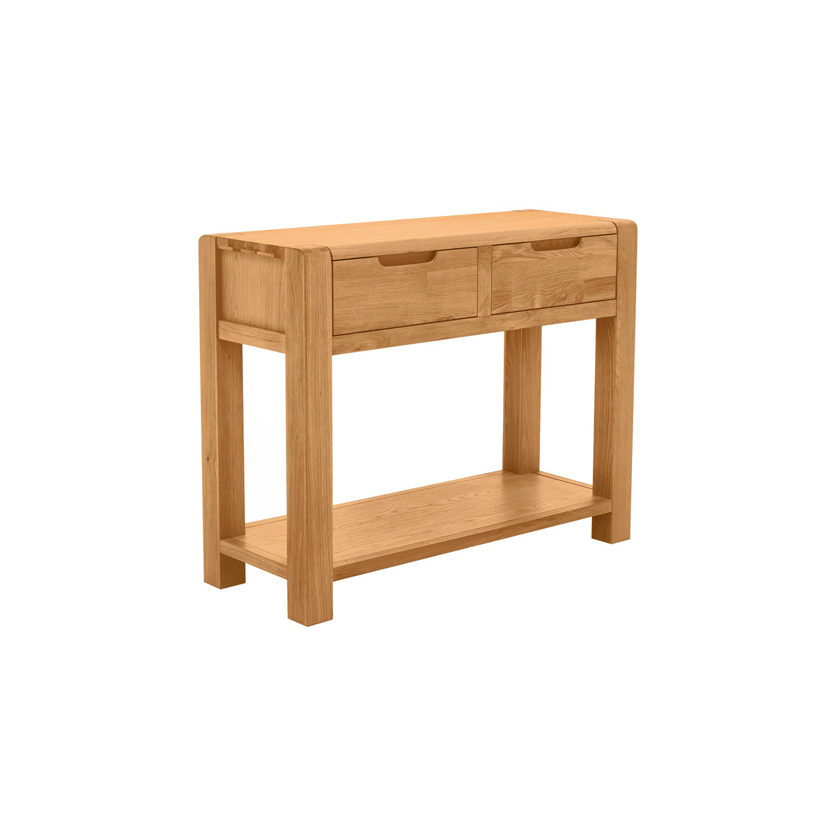Useful in a hallway, stylish against a sofa back and the ideal way to divide an open plan space, this solid oak console table with butcher block-effect top is a contemporary storage piece. Why you'll love it. Oak console table is beautifully crafted and great value. Casual contemporary style suits all interiors. Striking butcher block-style top. Legs smoothly curve into the rounded edges of the top. Drawers have recessed handles. Plenty of storage space - there are two drawers and a lower shelf. It's made of real wood so each table will be different and unique. What you need to know. Wood has natural markings, knots and colour variations. Easy to clean - simply wipe with a damp non-abrasive cloth. The Bakerloo range also includes a lamp table, a coffee table and a nest of tables.