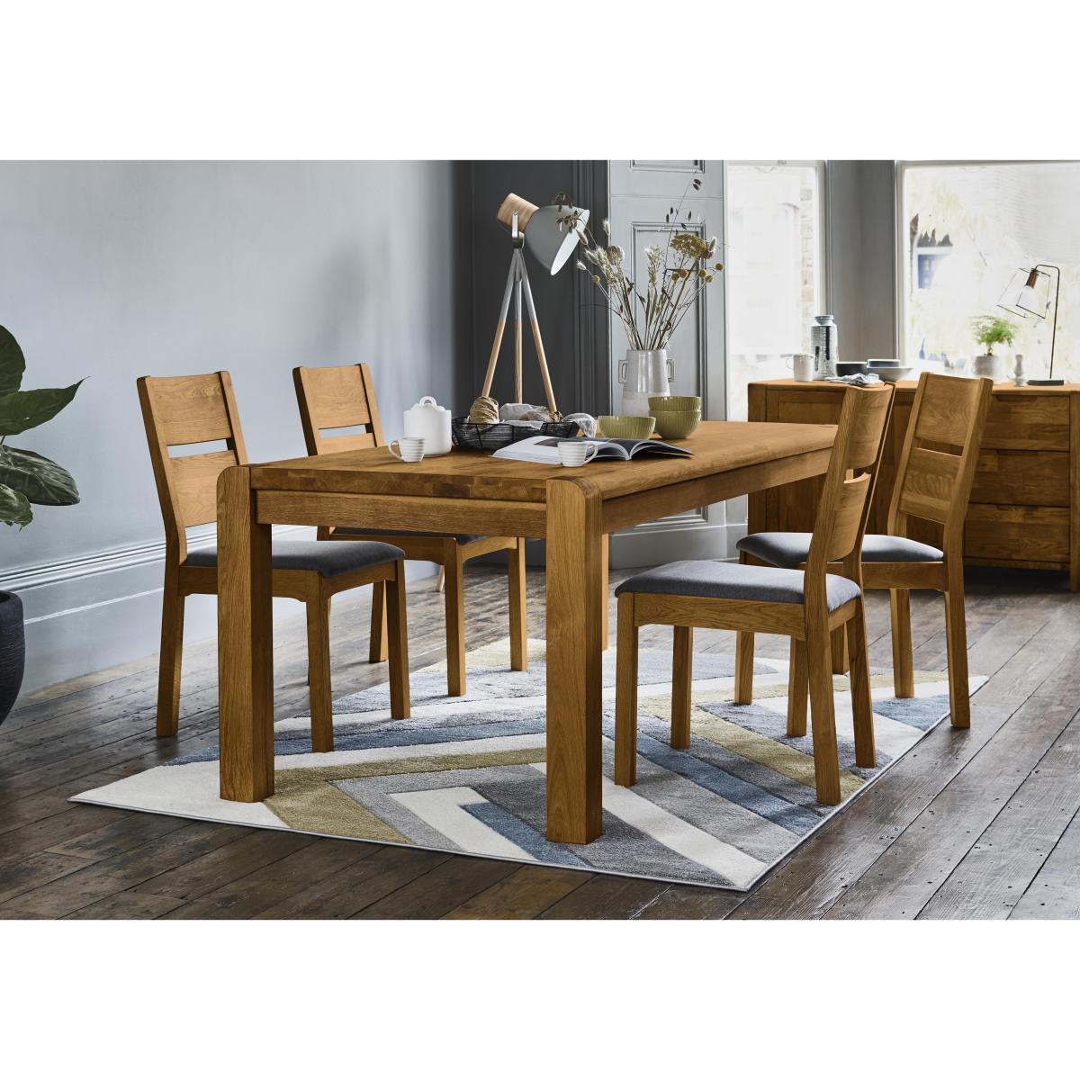 Superb craftsmanship meets casual, comfortable style – and all at a fantastic-value price. Bakerloo is beautifully made from real oak which means every piece is a one of a kind. The finish is warm-toned, and you’ll love the stylish details like the butcher block-effect tops and curved table edges. The collection offers two sizes of extending dining table, a dining chair and a dining bench, storage pieces and occasional tables, and a great choice of ready-made dining sets. Here’s the perfect small-space dining set. Crafted from solid oak, the dining table seats six and has a lovely butcher-block effect top. Four slatted-back dining chairs with dark grey upholstered seats complete the set. Like to entertain? The table extends to seat eight. Why you’ll love it. Solid oak dining set is beautifully crafted and great value. Casual contemporary style suits all interiors. Table has a striking butcher block-style top. Dining chairs have broad horizontal slats, and padded seats with dark grey upholstery. Dining table legs smoothly curve into the rounded table edges. Butterfly extension mechanism is so easy to use. It’s made of real wood so each set will be different and unique. What you need to know. Wood has natural markings, knots and colour variations. Easy to clean wood finish – simply wipe with a damp non-abrasive cloth. There’s a wide choice of Bakerloo dining sets, or mix and match tables, chairs and benches to make your own. Please note. As shown below, this piece has small gaps where the legs meet the top. This is a design feature, not a manufacturing fault.