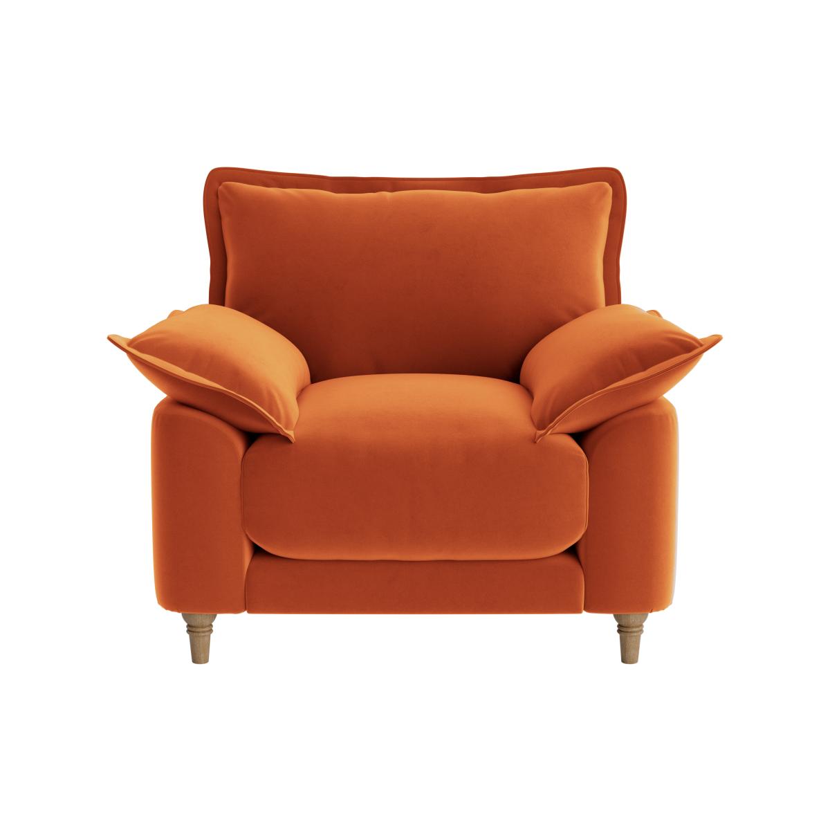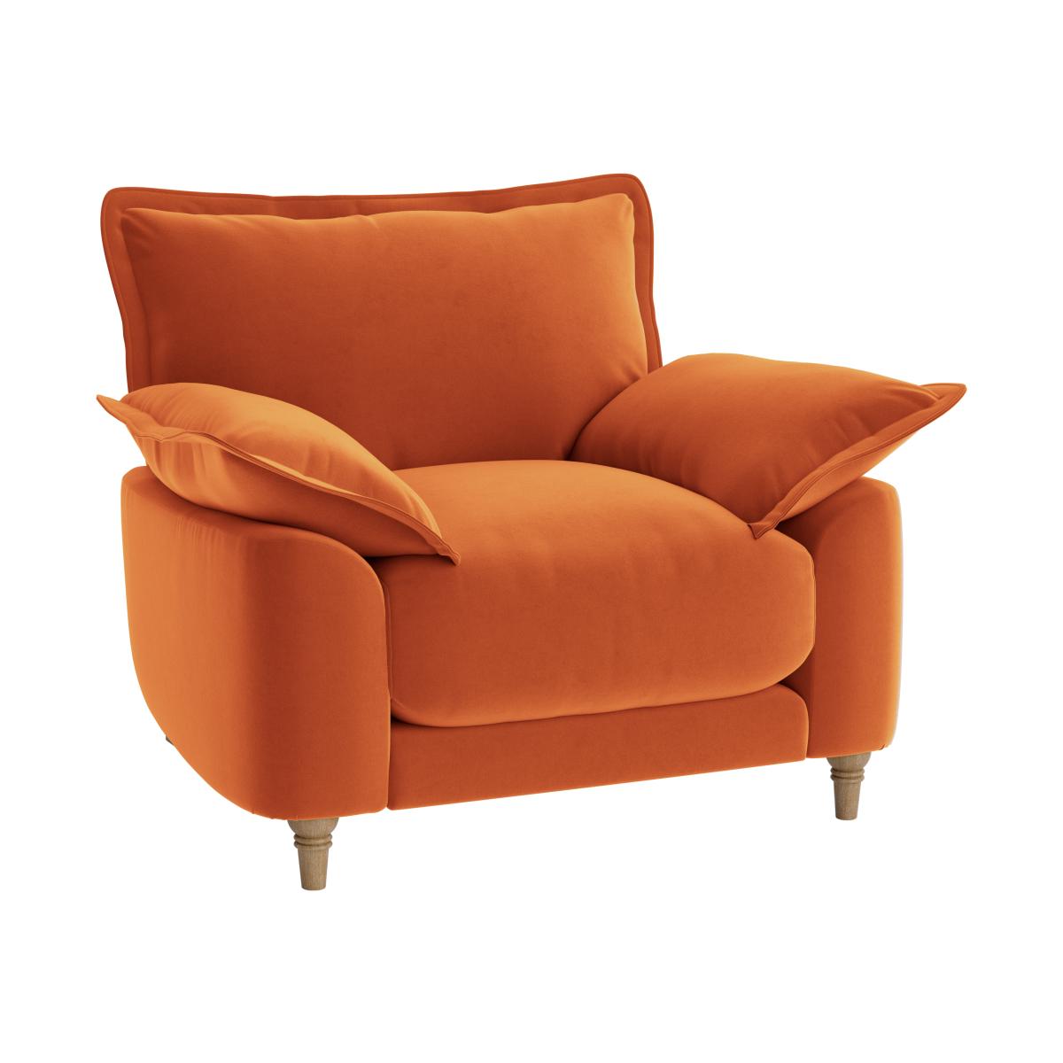 I love this armchair for its bold colour and inviting silhouette, making it a great statement piece in both contemporary and eclectic interiors. Its cosy proportions and plush cushions suggest comfort, perfect for relaxing in relaxed living rooms or cosy reading nooks. To style it effectively, consider pairing with neutral or muted tones in surrounding furniture and accessories to let the rich terracotta hue really pop. Practical tips include adding textured throws and layered cushions for extra comfort and visual interest. It works especially well in warm-toned schemes, mid-century modern settings, or paired with natural woods and brass accents for a balanced, inviting look.