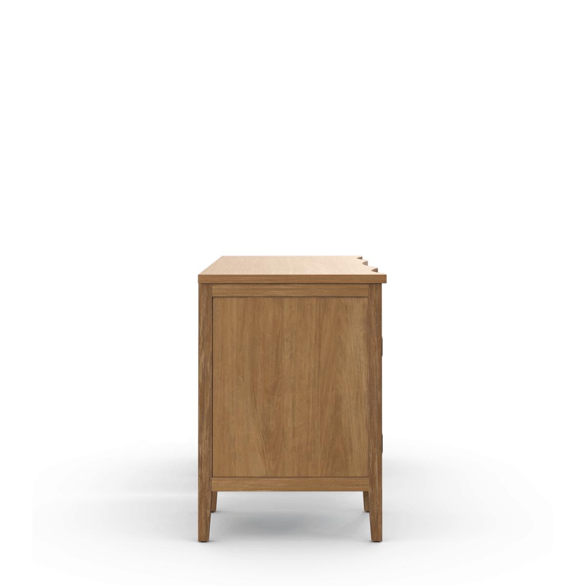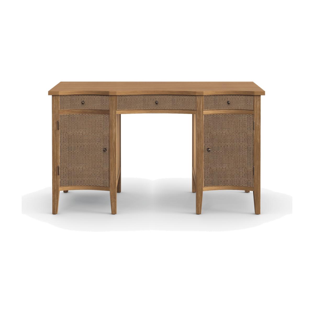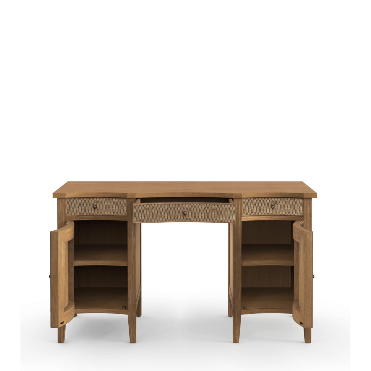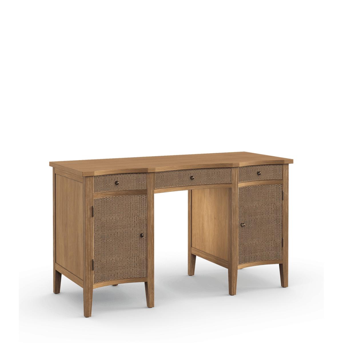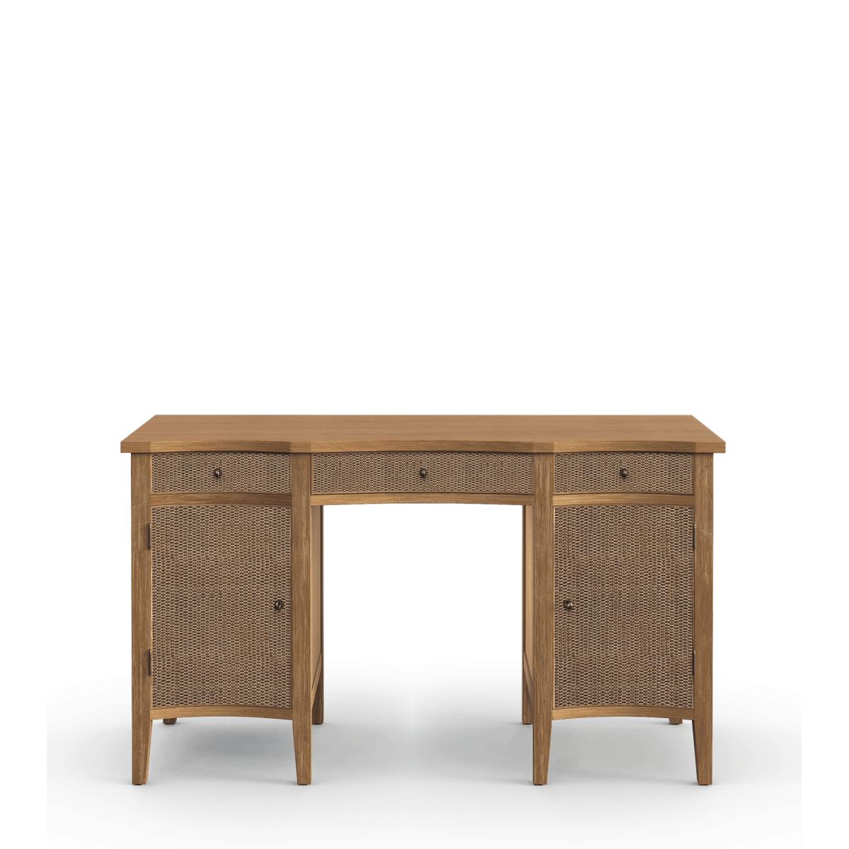 A play on a traditional partners desk, the Balabac flips the rulebook, turning what is normally a heavy and masculine looking piece of furniture into something lighter and prettier. This is achieved through the recessed side panels, curved frontage, delicate ring handles and natural rattan detail typical of our Balabac Range. Due to the natural materials used, each piece will have individual characteristics.