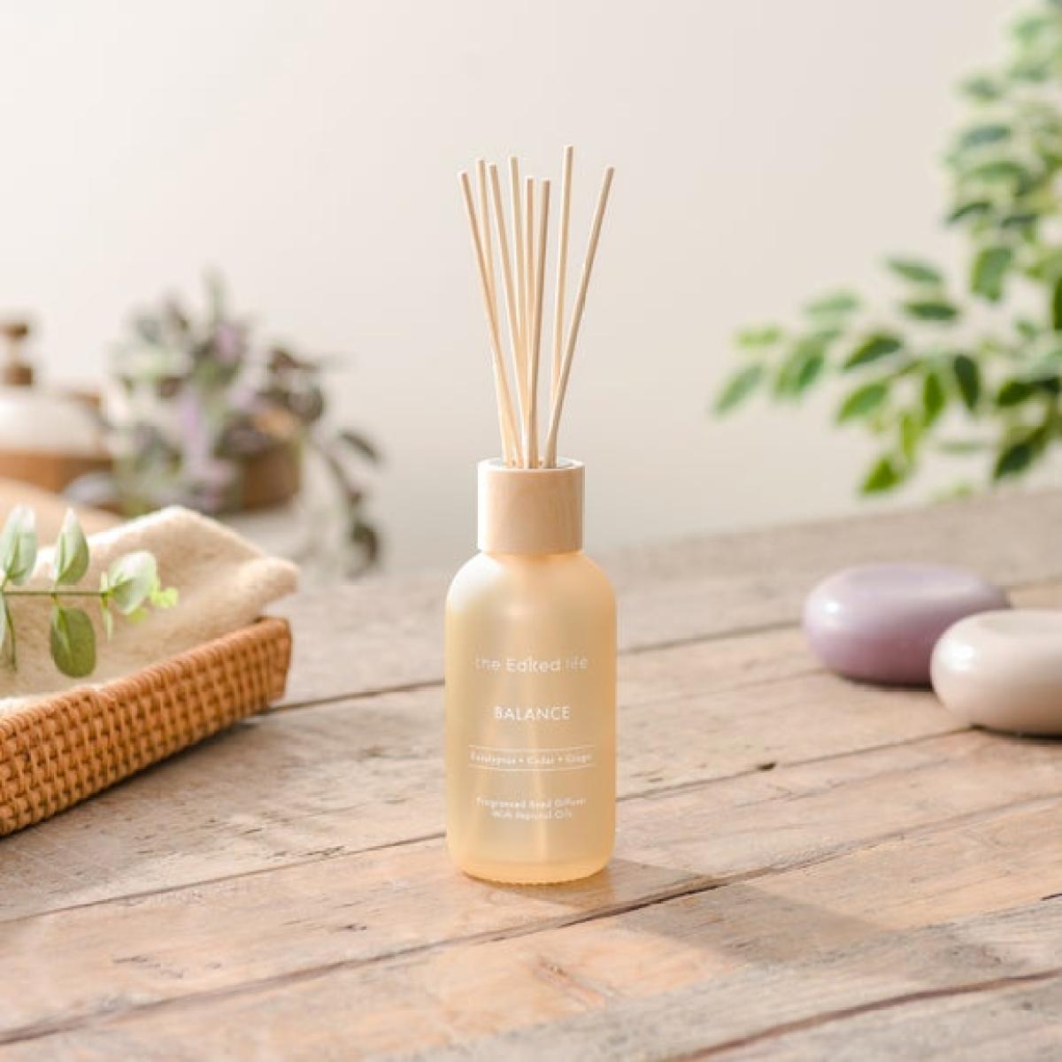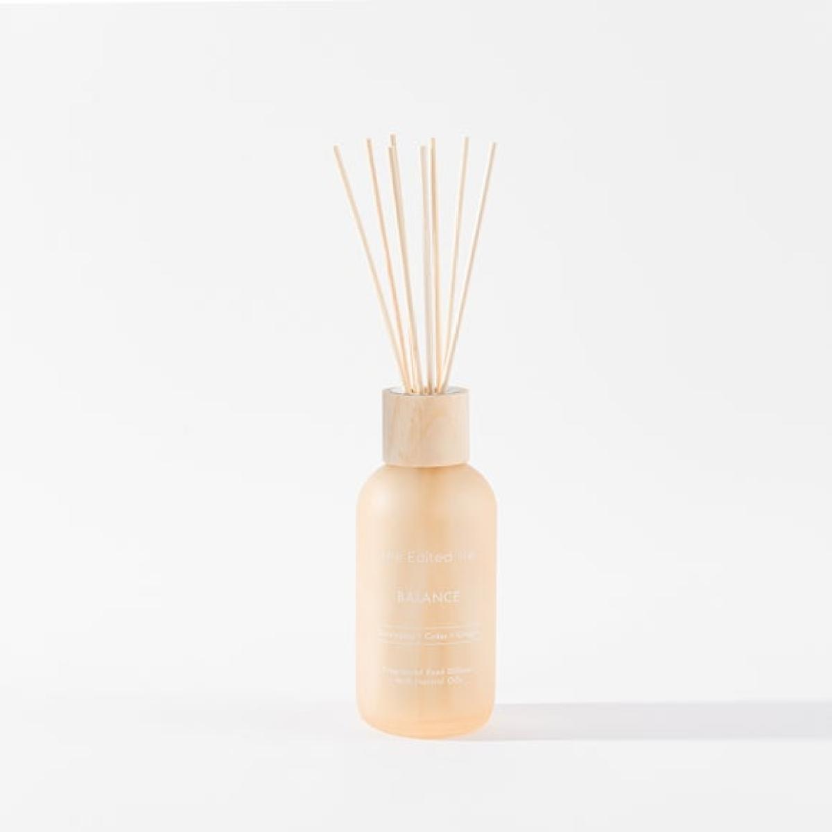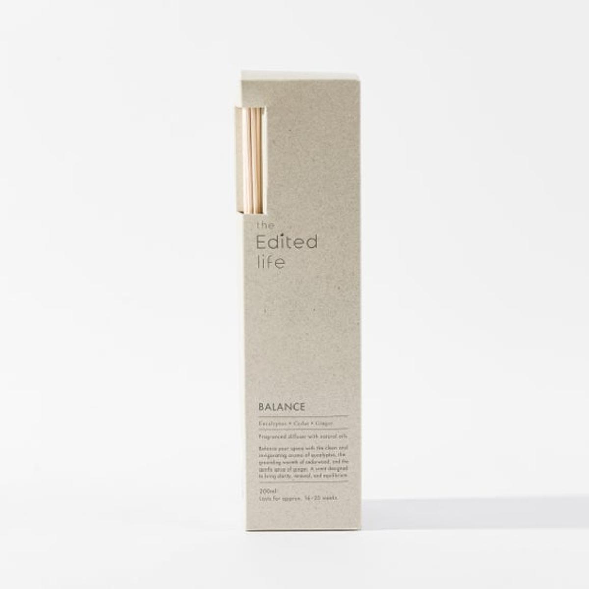 The Edited Life - Balance Diffuser * 200ml diffuser * Natural reeds * Glass jar * Balance scent * Lasts up to 20 weeks Bring clarity and renewal to your home with our Balance Diffuser. This diffuser is beautifully presented in a cream glass vessel with a wooden lid, and includes 8 natural reeds. It features the clean and invigorating aroma of eucalyptus, the grounding warmth of cedarwood, and the gentle spice of ginger, a scent designed to help you find equilibrium. Enjoy this serene fragrance for up to 20 weeks. Live well. Mean well. Be well. Many of us want to live simpler, more responsible lives. As we become more aware of our surroundings and understand how our choices contribute to the world around us, more people are choosing to consume less and curate more. The Edited Life introduces a new era of thoughtfulness in the home, with an understated collection of pieces chosen for their simple beauty, quality craftsmanship and innate usefulness that will last beyond any trend. Having it all is no longer the goal; having enough, and it being just right, is.