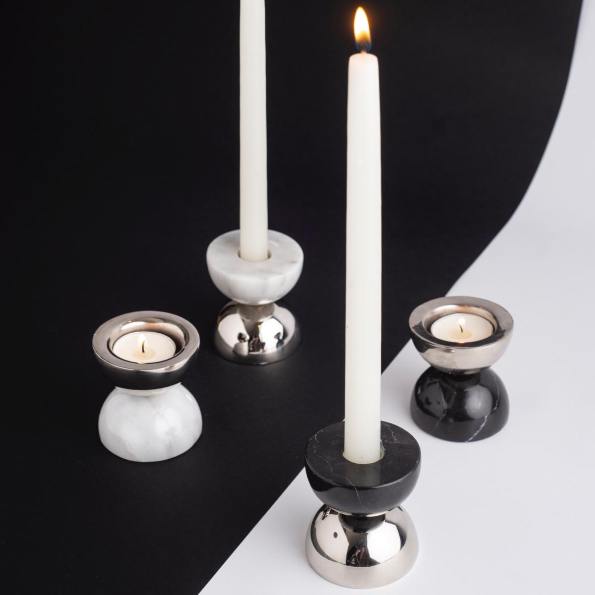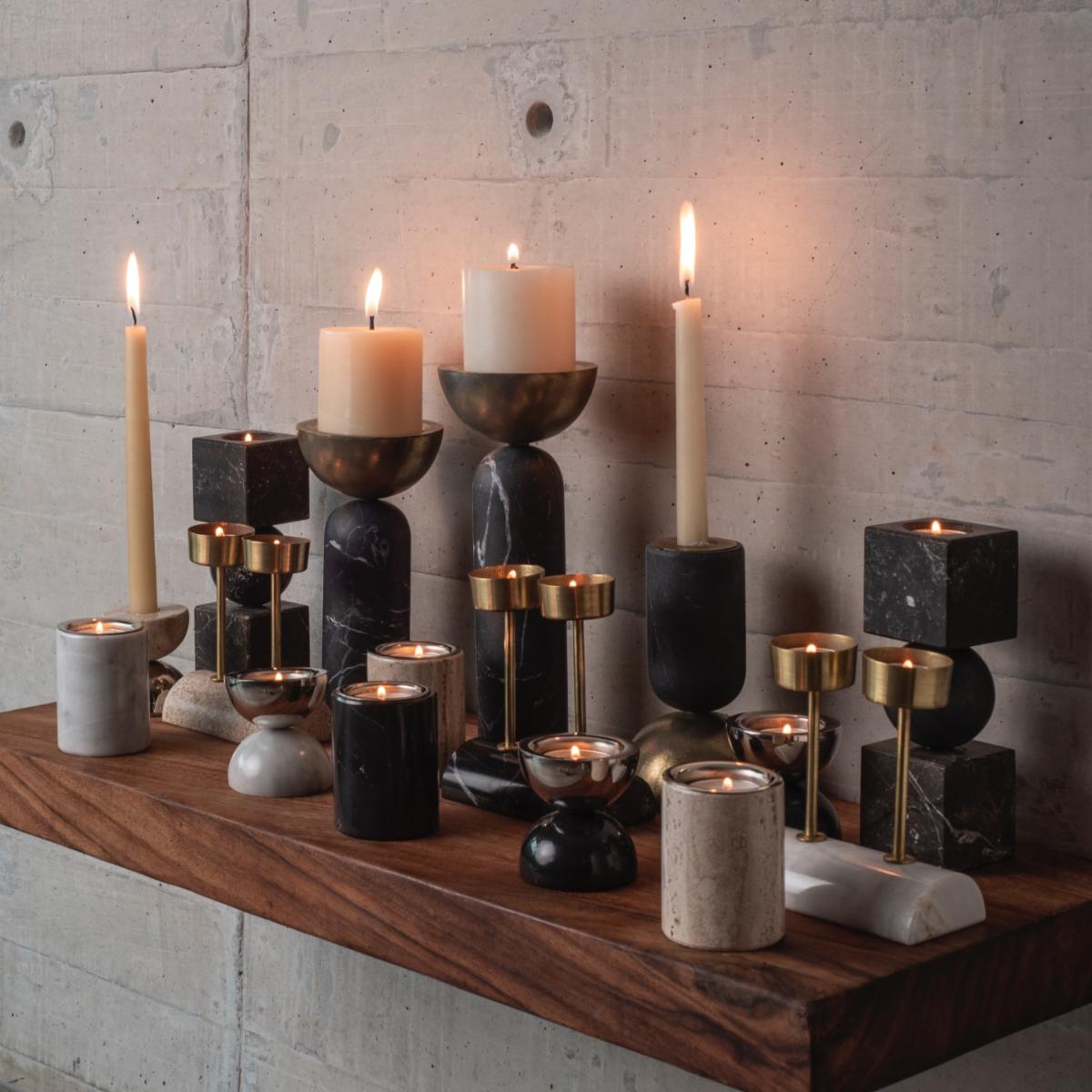 Experience the ultimate in versatility and sophistication with Bruci's Balance candle holders, exclusively designed for the discerning connoisseur of luxury home décor. Whether you prefer the warm glow of traditional tealight candles, the fragrant allure of oil candles, or the hypnotic dance of flames atop an oil burner, these exquisitely handcrafted candle holders offer unparalleled versatility. Each piece is meticulously crafted in our workshop with the finest materials, including nickel-plated brass and your choice of opulent white, black, or travertine marble. The unique design and impeccable craftsmanship of these candle holders make them a standout addition to any interior space, lending an air of refined elegance and timeless sophistication.