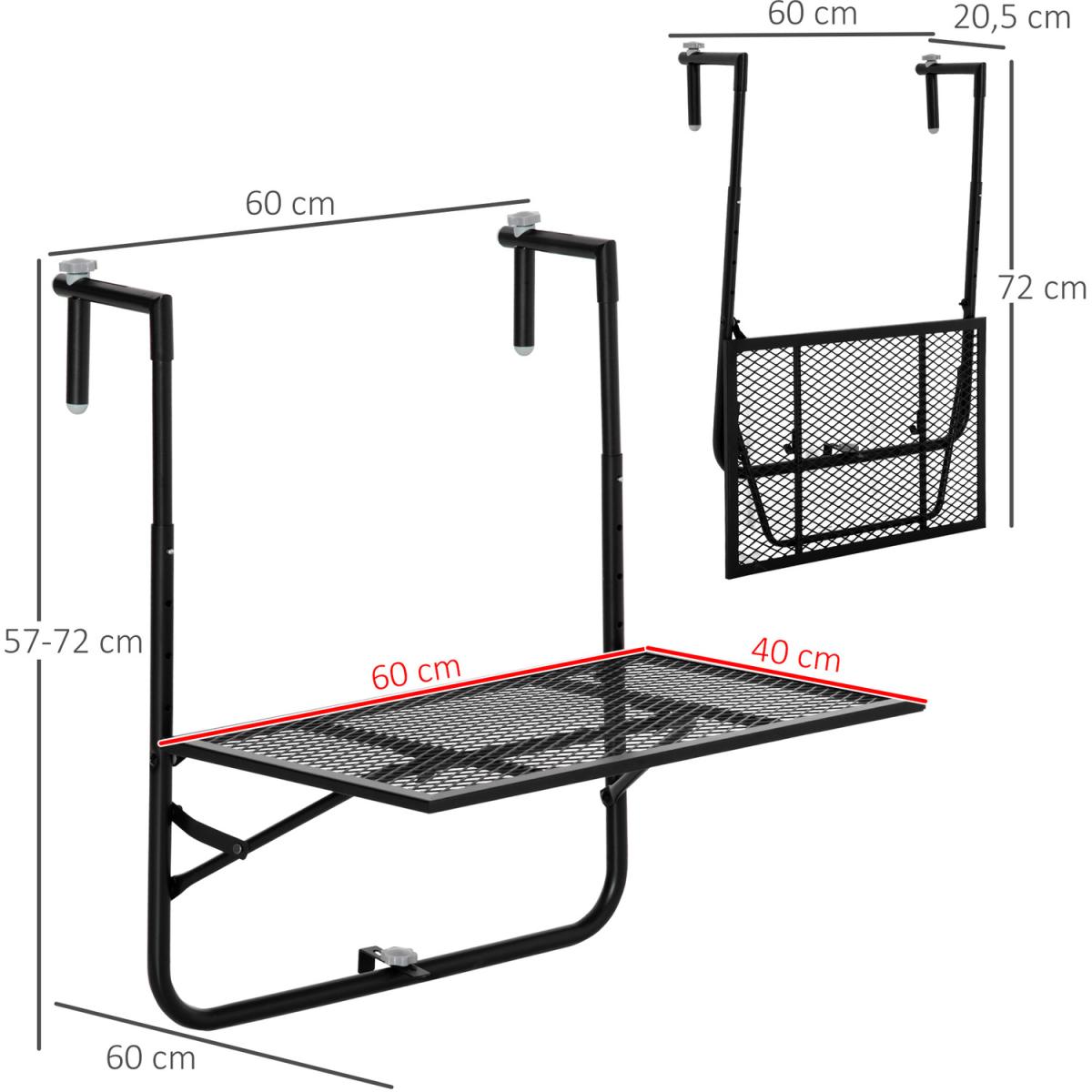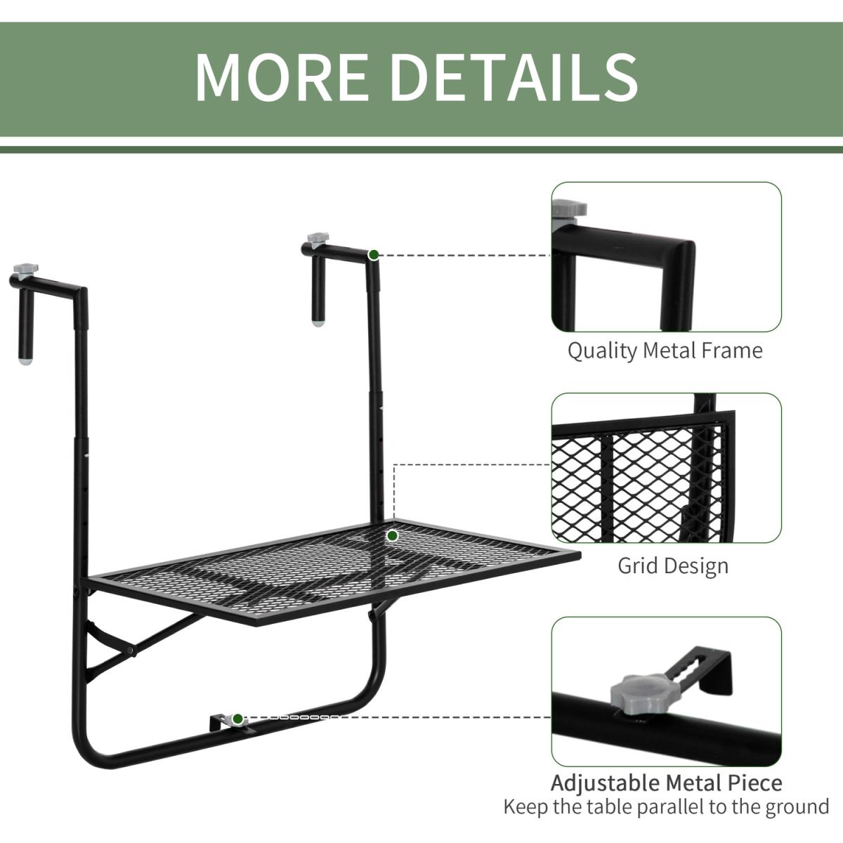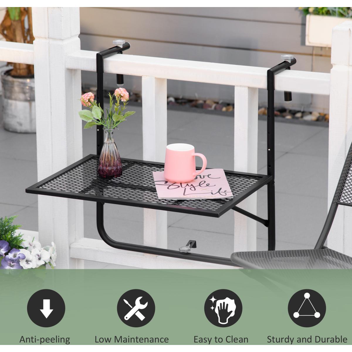 Sit at the balcony, enjoy coffee, tea, cook-tile with this metal railing table from Outsunny! This table provides a great solution to anyone who has a limited outdoor space. Constructed with metal frame in black finish, it can meet your frequent daily use. With adjustable railing position and adjustable positions for desktop height, it can easily attach to your deck or patio railing. With this smart gadget, you will never spill a drink while enjoying the view from your balcony.