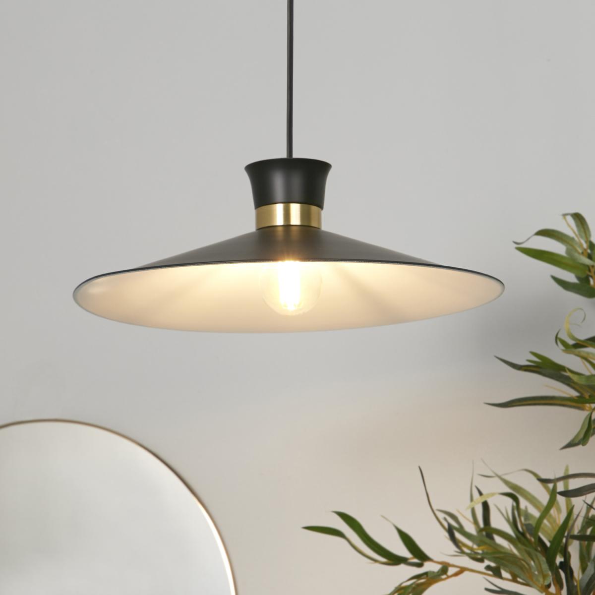This shade features a wide conical design that effectively directs light downward, making it ideal for focused illumination. Its black exterior contrasts with a white interior, which helps reflect light more efficiently. A metallic band near the top adds a stylish accent, blending modern aesthetics with functional lighting.