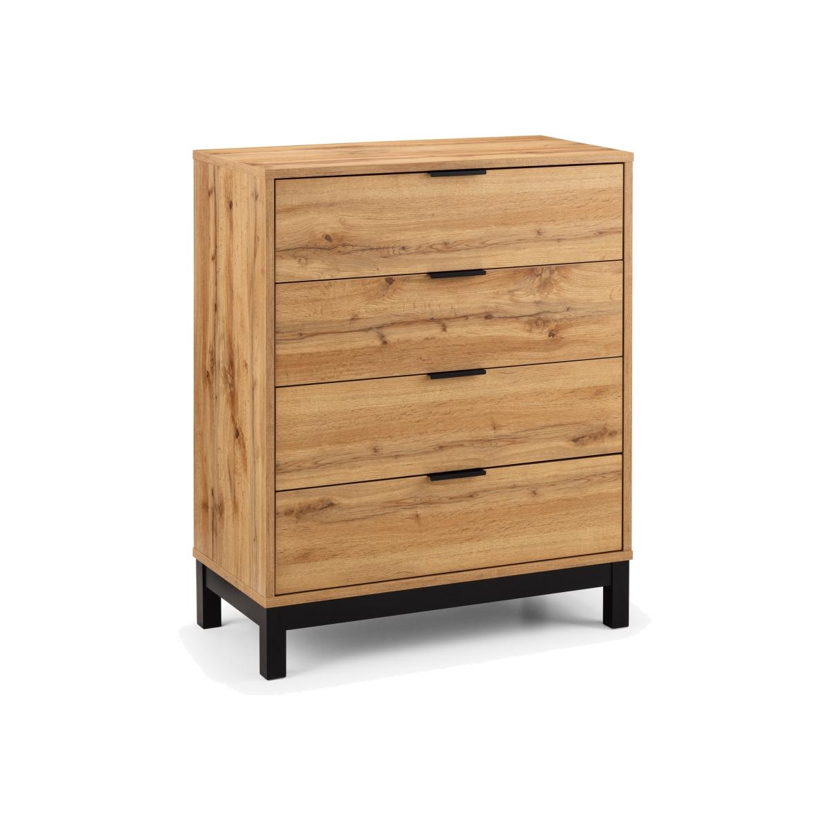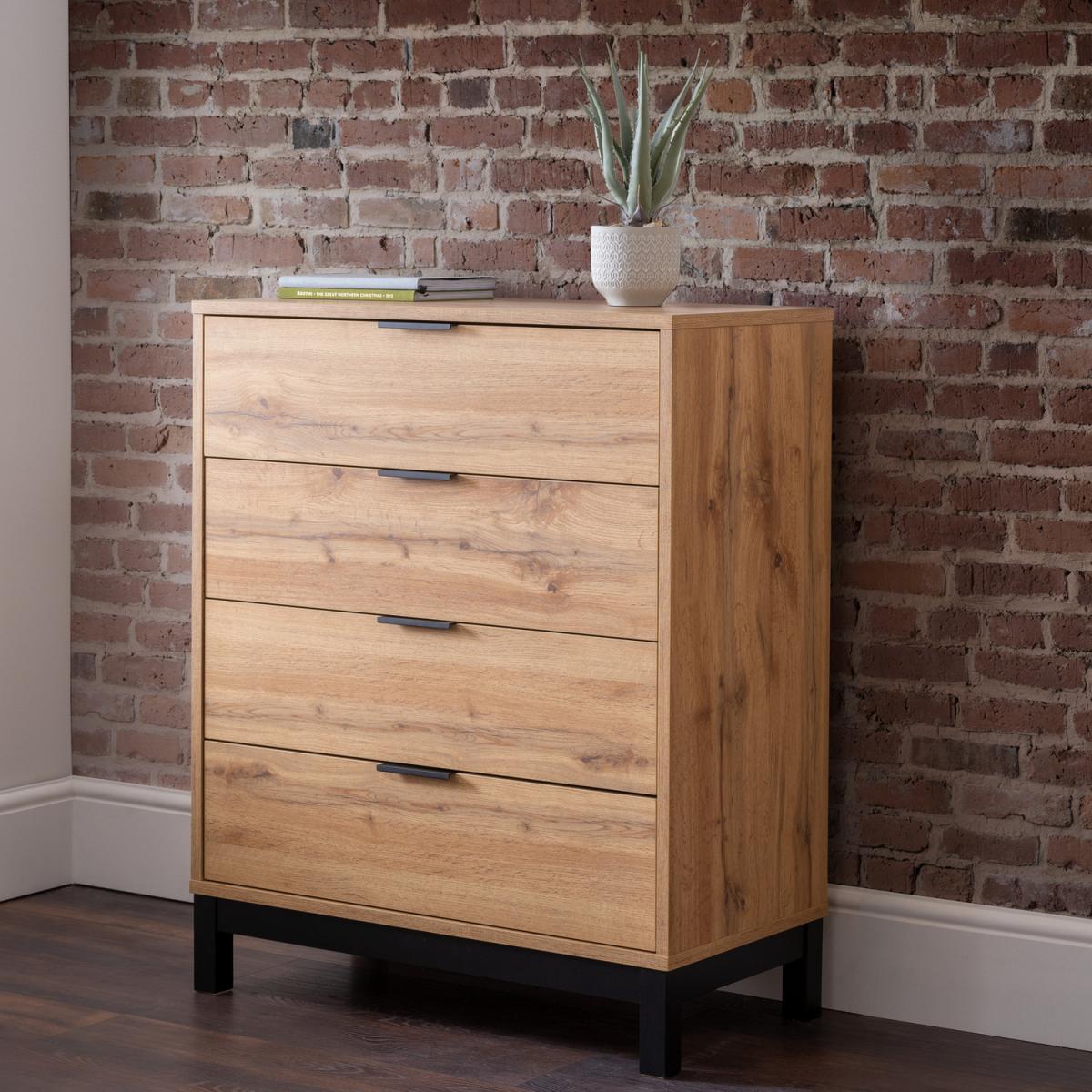 I love how this oak chest strikes the balance between warm, natural tones and a minimalist black metal base, making it a versatile piece for both Scandi-inspired and urban-style interiors. Its clean lines and broad drawers offer practical storage in a bedroom, hall or home office without looking bulky. For styling, keep the top clear of clutter by grouping a low-profile plant, a slim table lamp and a shallow tray for keys or accessories. Pair with soft neutrals on the walls and add a textured rug beneath to ground the look and highlight the wood grain.