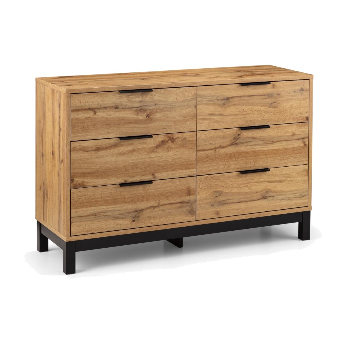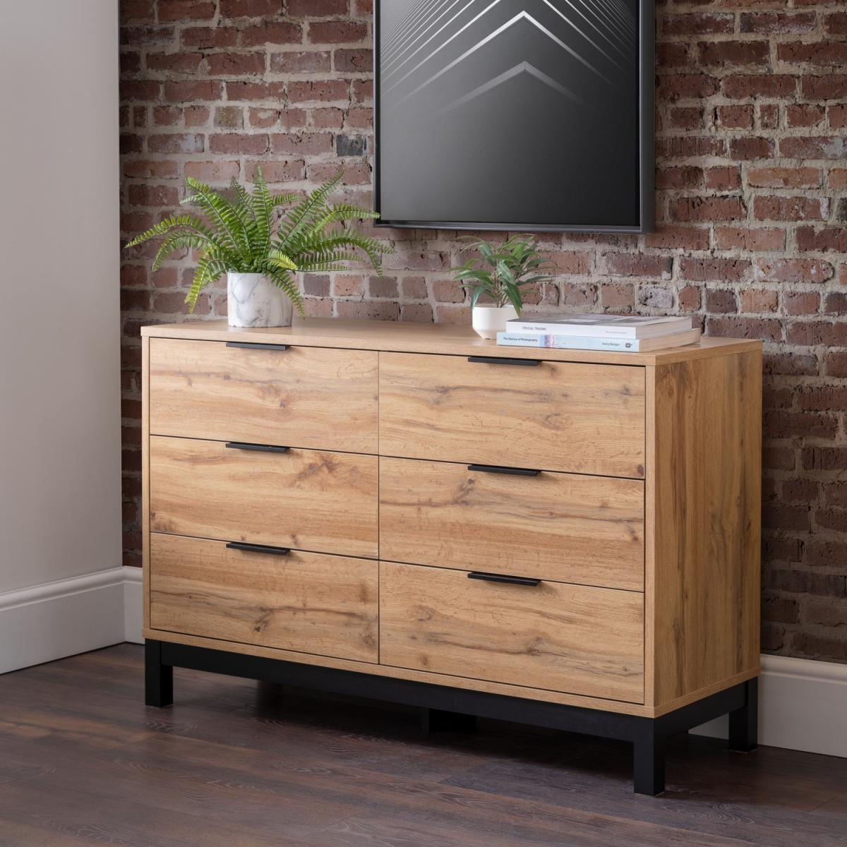 I love how the oak-effect grain and slim black metal base give this wide chest a clean, modern look that works equally well in Scandi, industrial or modern farmhouse schemes. The six spacious drawers mean you can hide away everything from bed linen to office clutter, making it ideal for bedrooms, hallways or home offices. For styling, keep surfaces clear and add height with a round mirror or a tripod lamp. A small plant in a textured pot and a neat stack of books will soften the lines without overwhelming the natural wood finish.