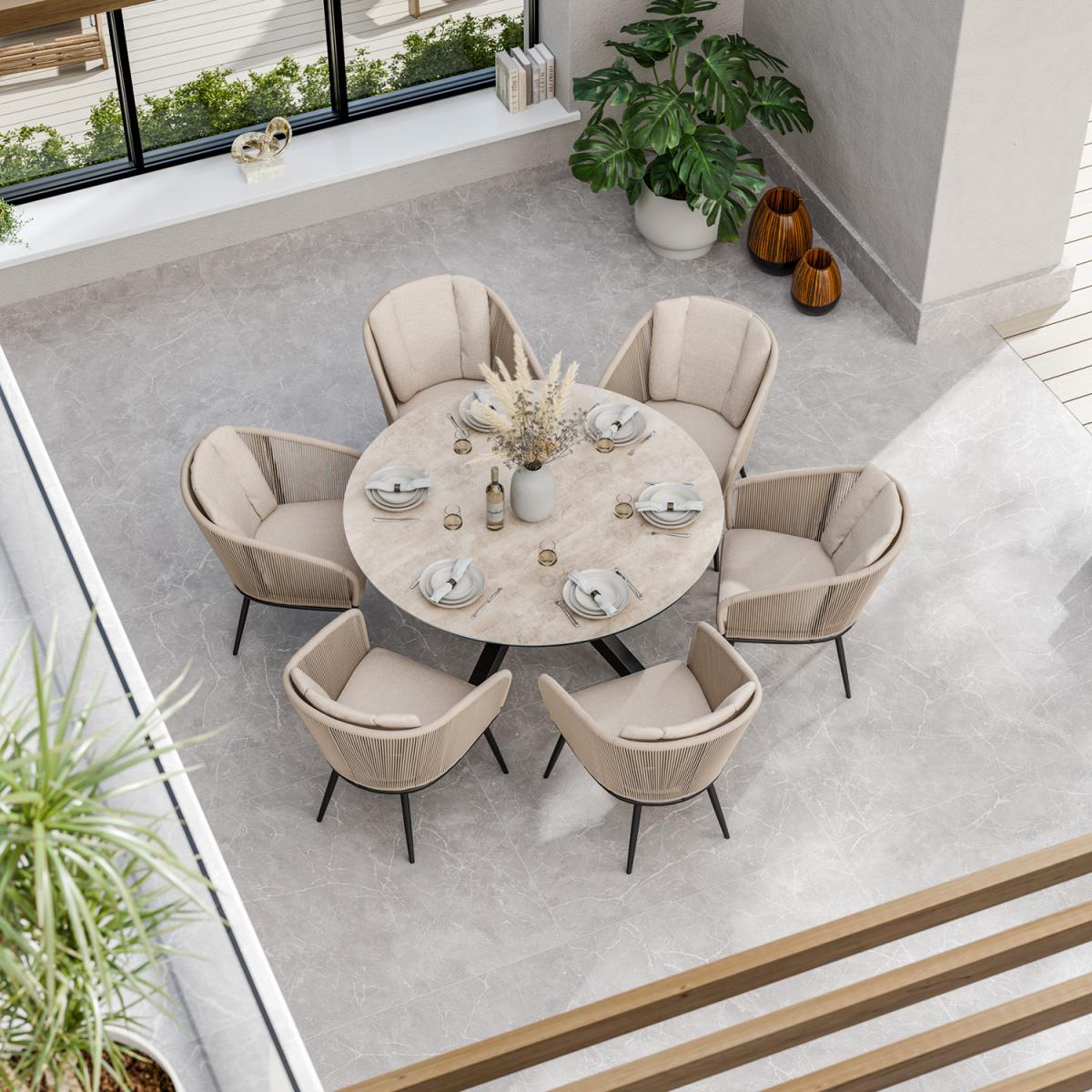 The Bali 6 Seater Ceramic Glass Dining Set from Royalcraft is a modern and stylish outdoor dining solution that combines durability with contemporary design. The set is ideal for those who want to enjoy outdoor dining with family and friends in style. Complete with an Aspen 150cm round natural colour ceramic glass top table and six Bali Sandstone rope chairs including Olefin fabric seat cushions, the Bali 6 Seater Ceramic Glass Dining Set is an excellent choice for those looking to blend modern design with functionality for their outdoor space.